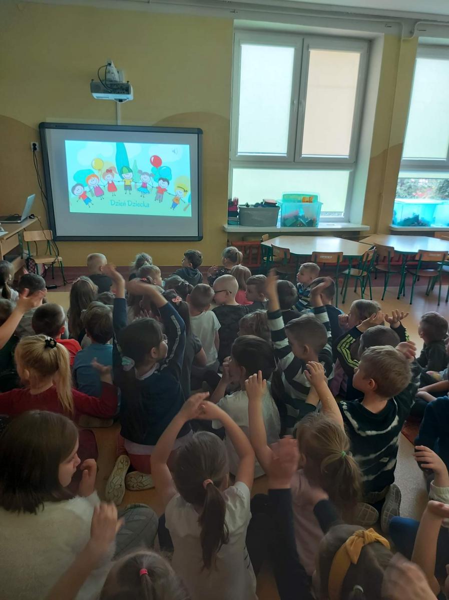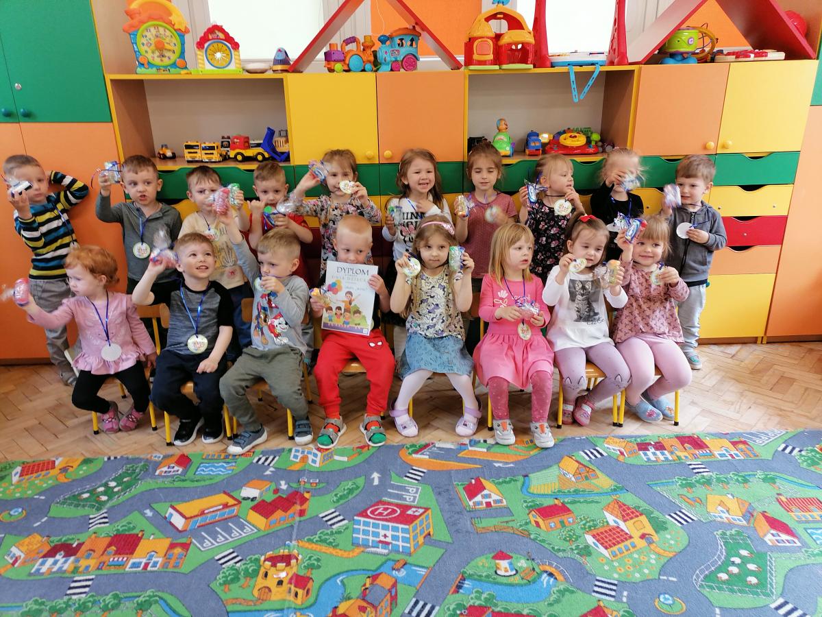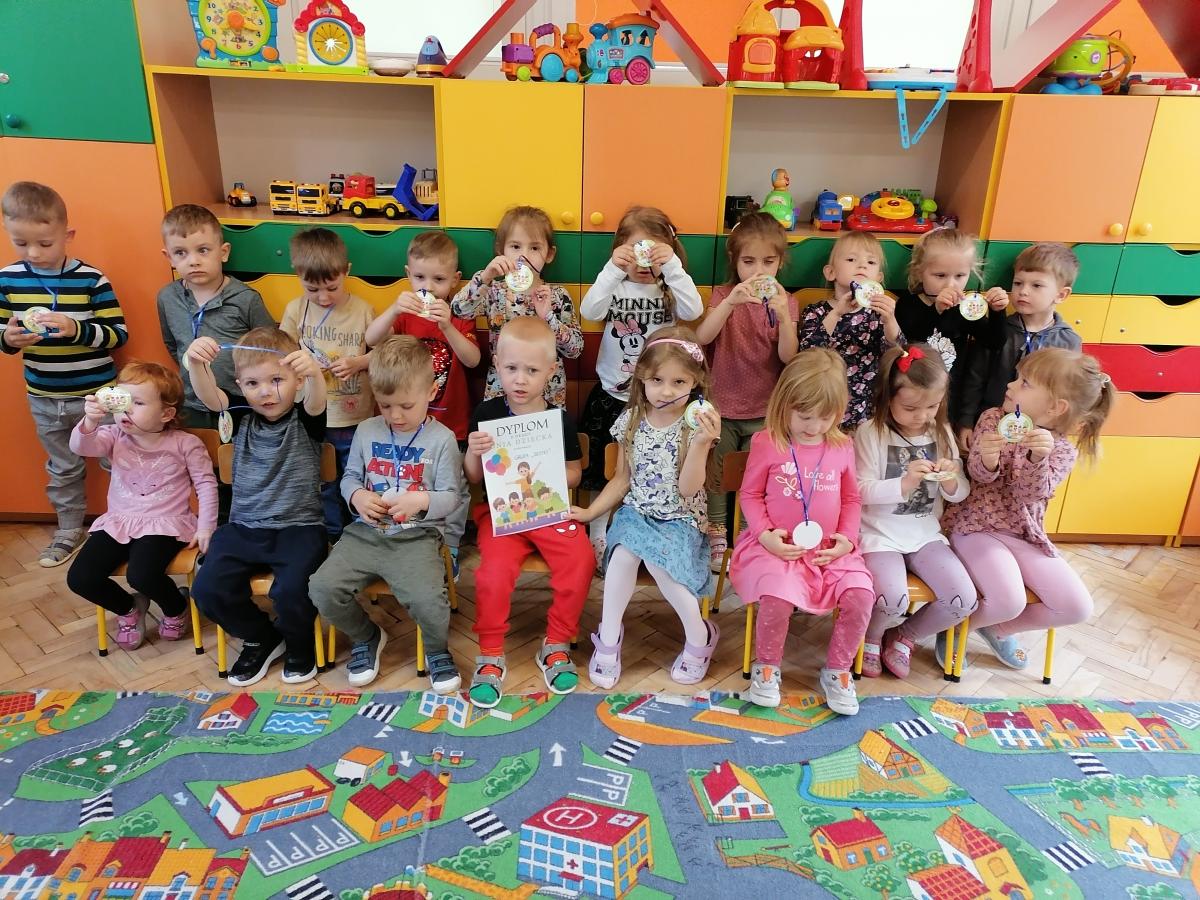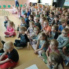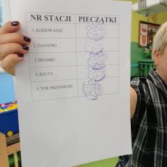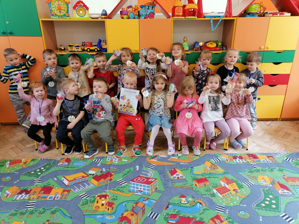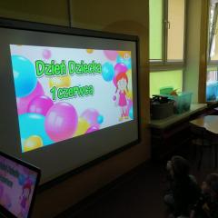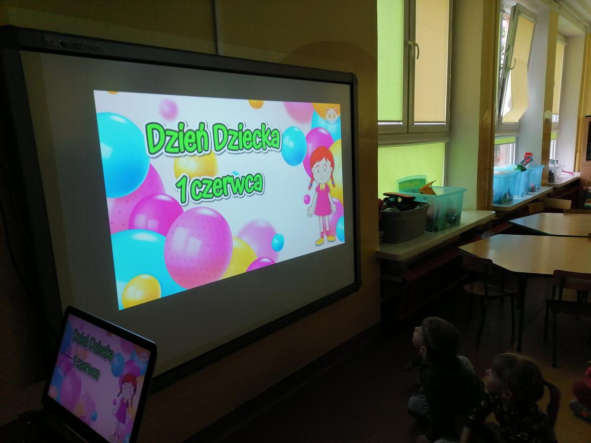 Z okazji Dnia Dziecka przedszkolaki obejrzały prezentację multimedialną, podczas której śpiewały, tańczyły, wykonywały zadania na spostrzegawczość, a także obejrzały film edukacyjny o dzieciach świata. Następnie wędrowaliśmy po stanowiskach rozmieszczonych w różnych salach i na korytarzu. Za wykonane zadanie grupa otrzymywała pieczątkę. Po ukończeniu wszystkich zadań dzieci dostały dyplom dla grupy, medale i drobne upominki.