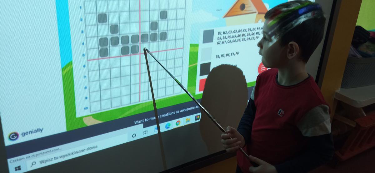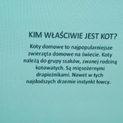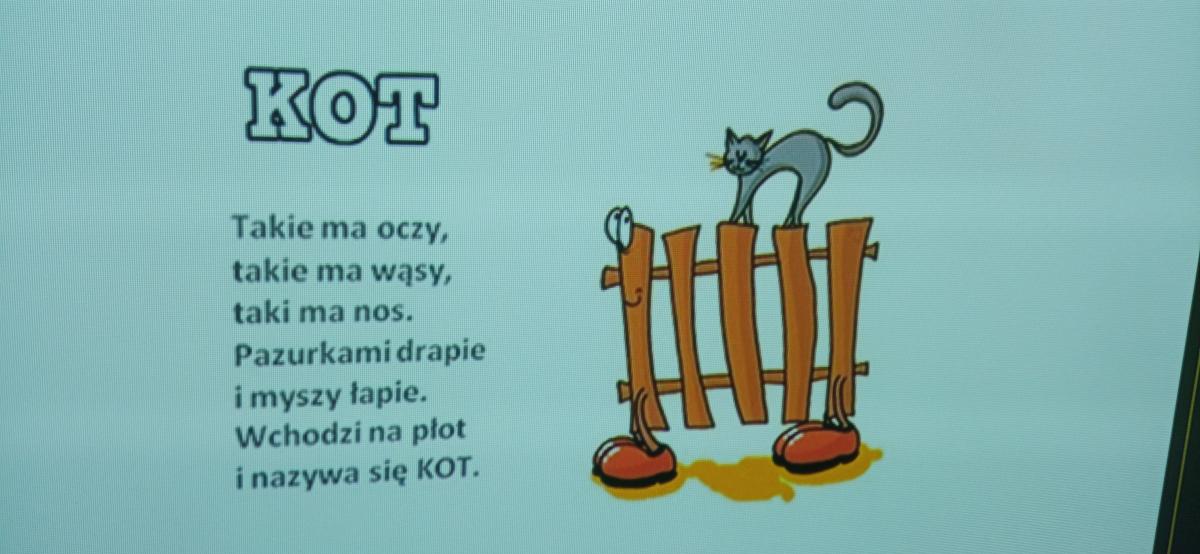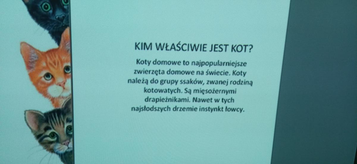 W ramach dzisiejszych zajęć dzieci obejrzały prezentację z okazji "Dnia Kota". Poznały różne rasy kotów ich zachowania oraz budowę. Rozwiązywały zagadki dotyczące kotów występujących w różnych bajkach, oraz film pt." Kot w butach". Odkodowały głowę kota w ramach Programu Uczymy Dzieci Programować. Wykonały pracę plastyczno - techniczną do Projektu Edukacyjnego z "Darami Natury Świat nie jest Ponury".