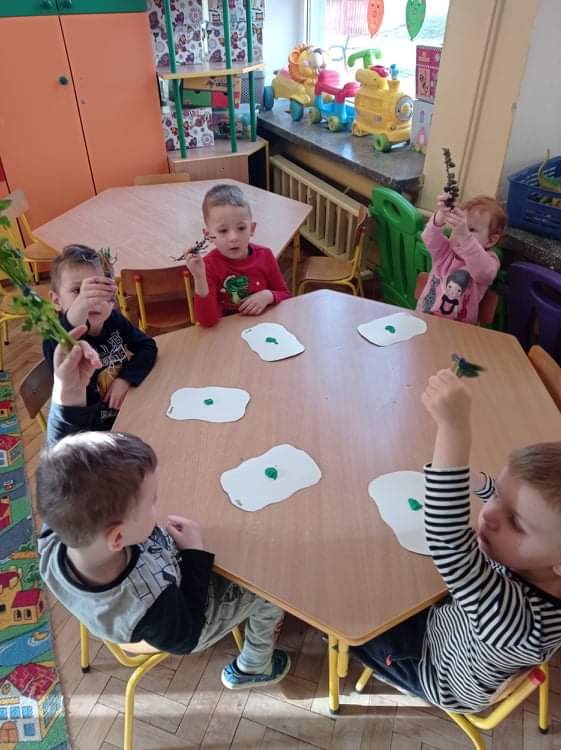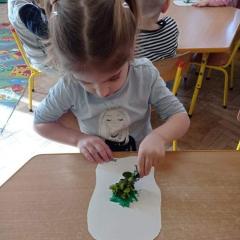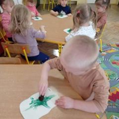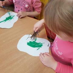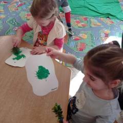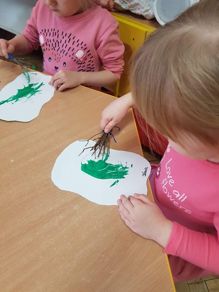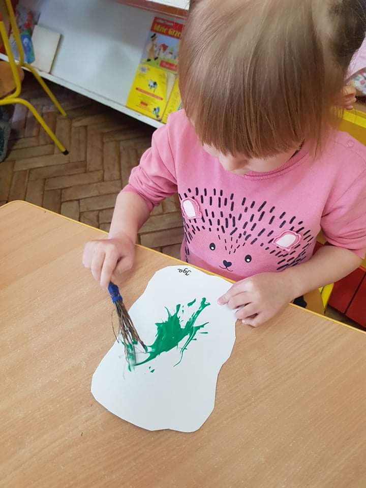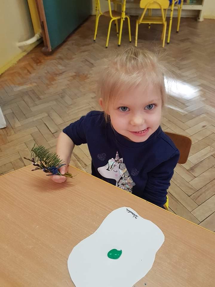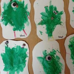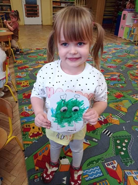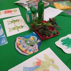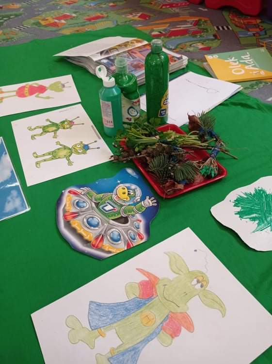 Na zajęciach na temat ufoludków, Jeżyki zrealizowały zadanie z projektu "Z darami natury świat nie jest ponury". Za pomocą pędzli z materiałów przyrodniczych i materiałów plastycznych stworzyły zielone ufoludki.
