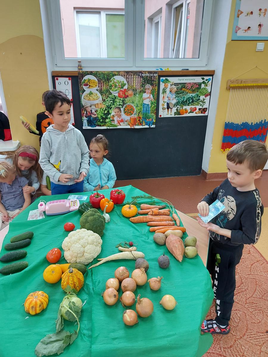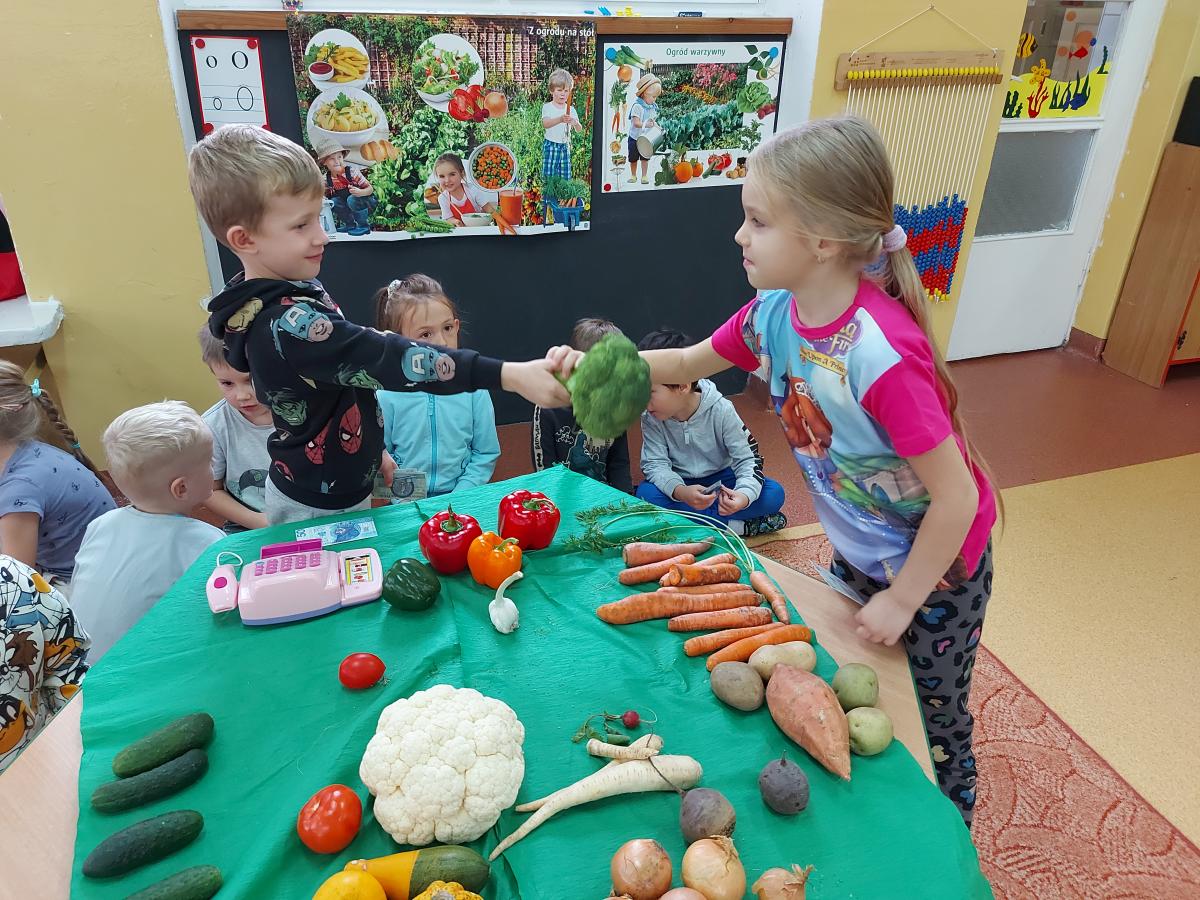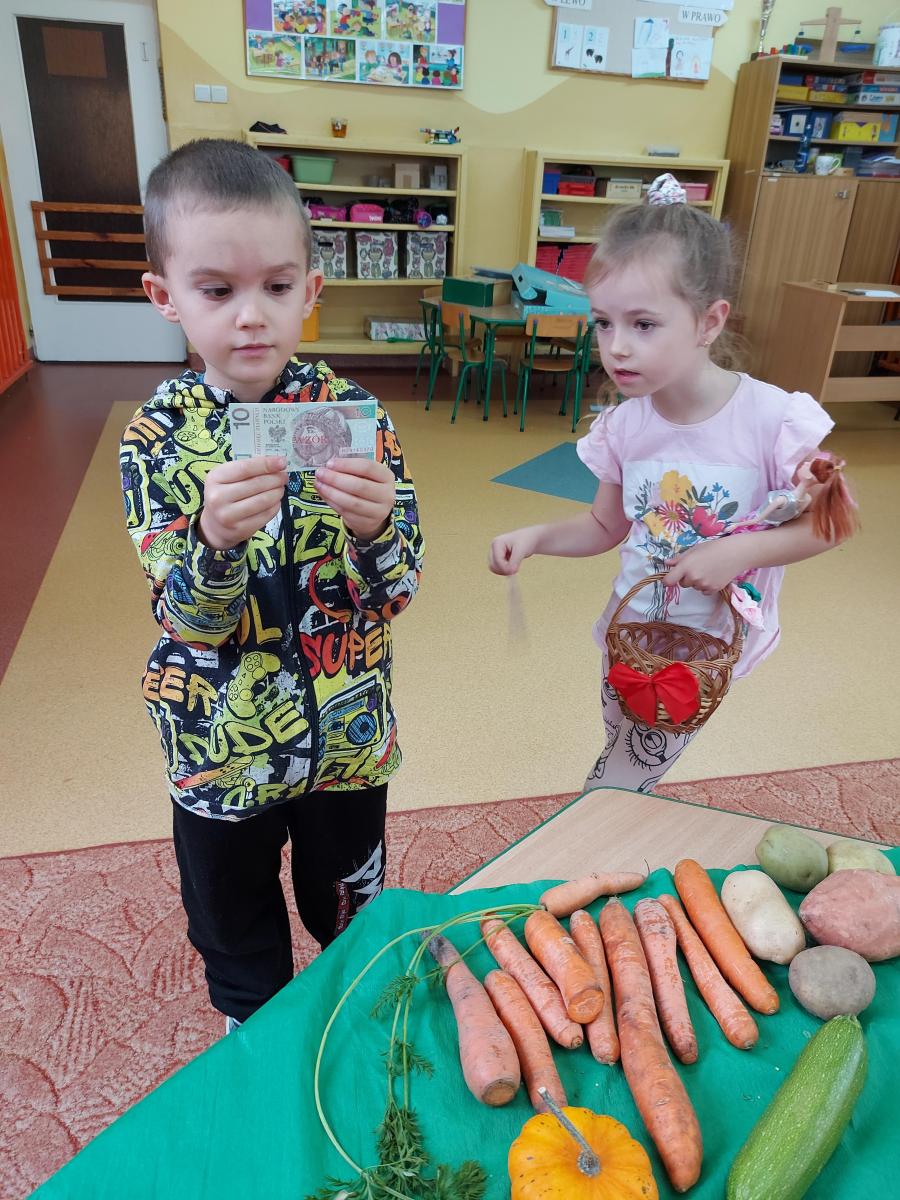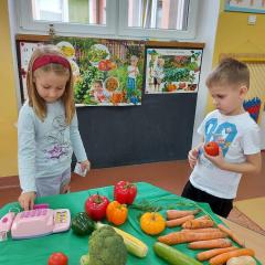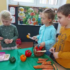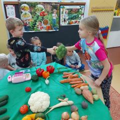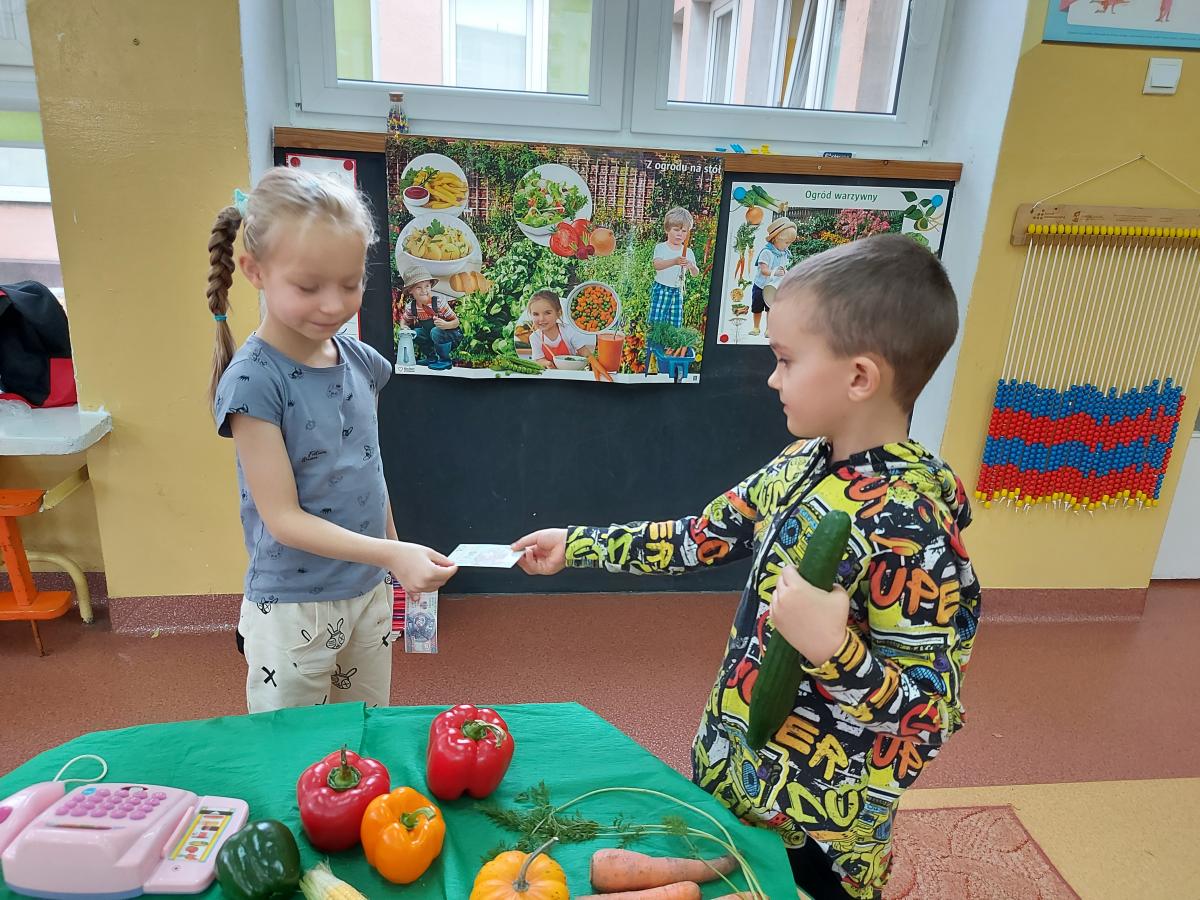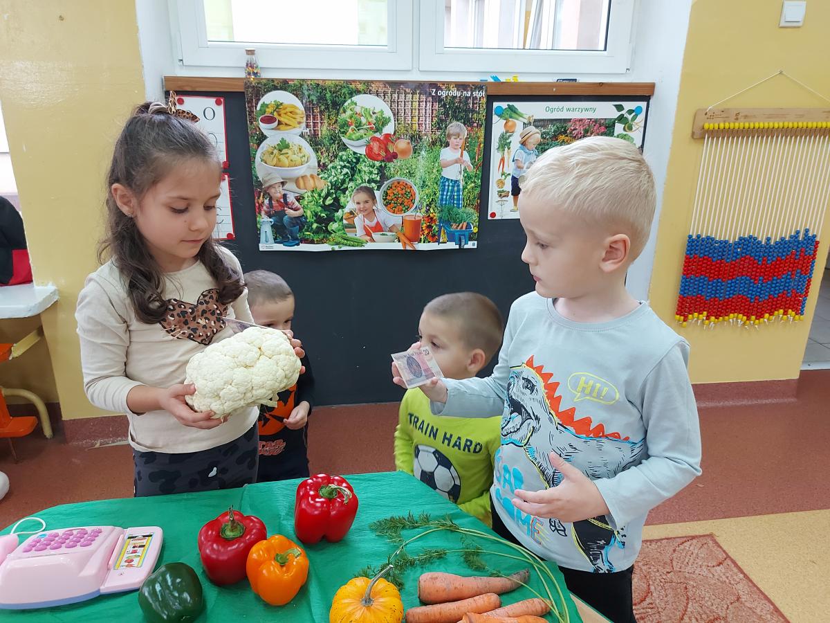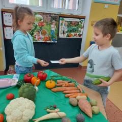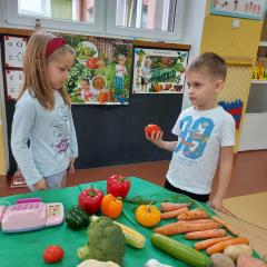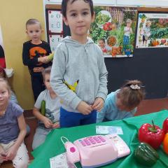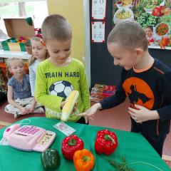 "Na straganie w dzień targowy takie słyszy się rozmowy..." . W ostatnim tygodniu motywem przewodnim naszych zajęć był wiersz Jana Brzechwy. Dzieci oglądały, nazywały, smakowały przyniesione do kącika przyrody warzywa. Dużą radość sprawiła zabawa w sklep i możliwość płacenia pieniędzmi.