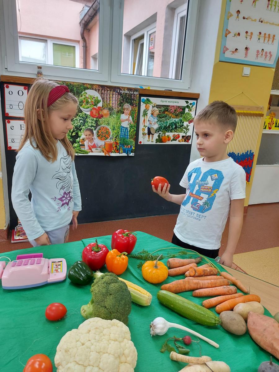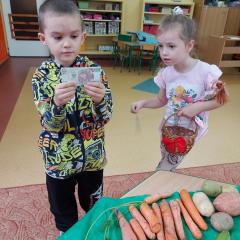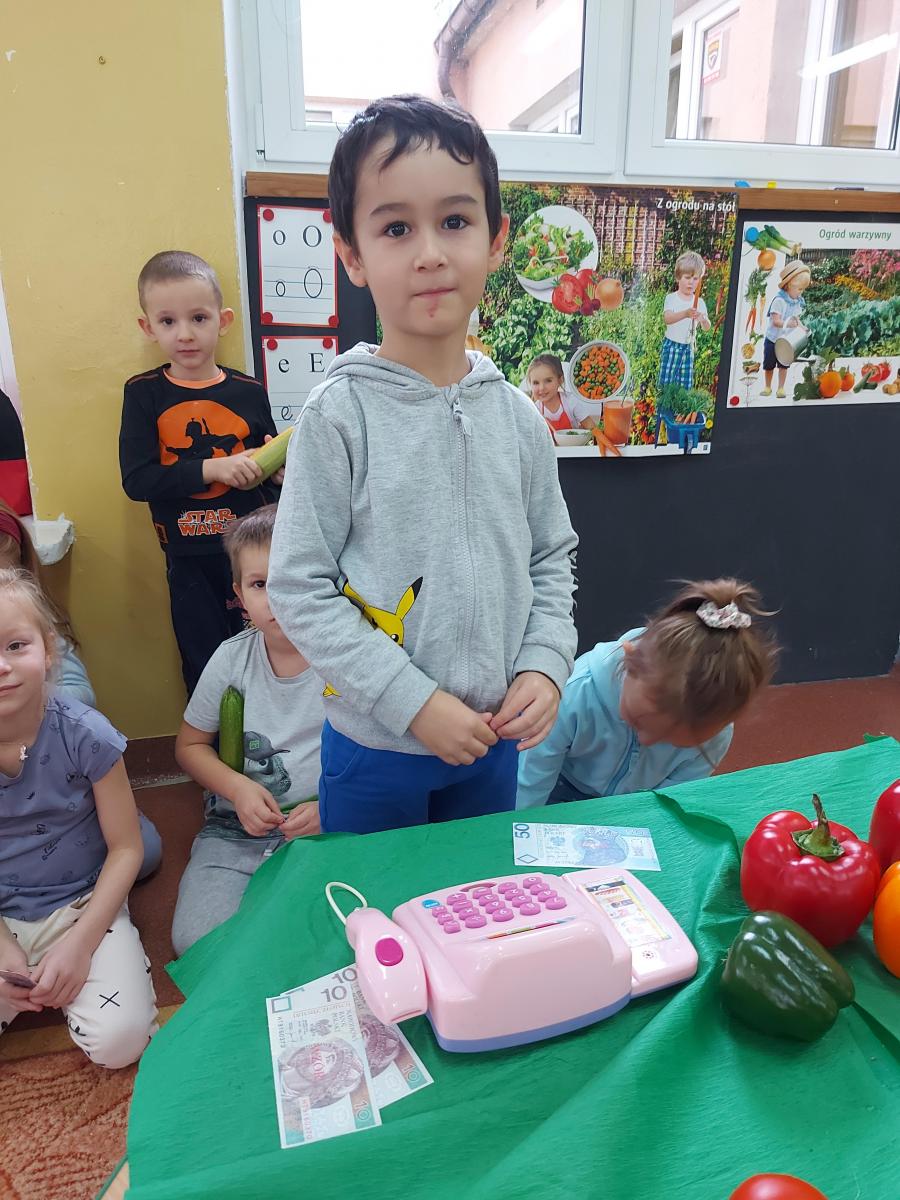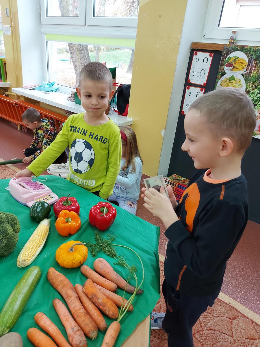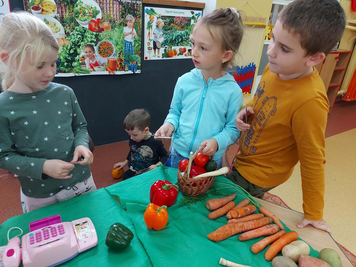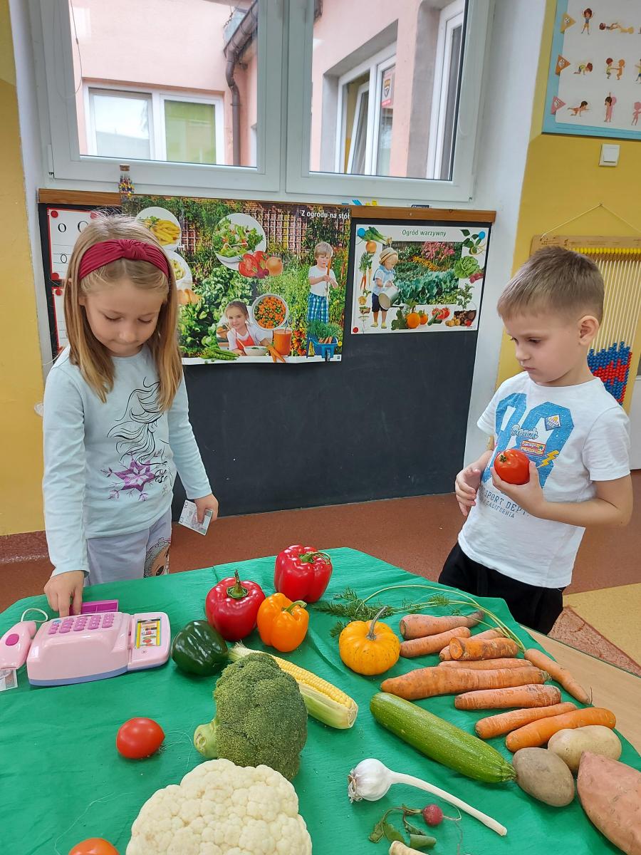 "Na straganie w dzień targowy takie słyszy się rozmowy..." . W ostatnim tygodniu motywem przewodnim naszych zajęć był wiersz Jana Brzechwy. Dzieci oglądały, nazywały, smakowały przyniesione do kącika przyrody warzywa. Dużą radość sprawiła zabawa w sklep i możliwość płacenia pieniędzmi.