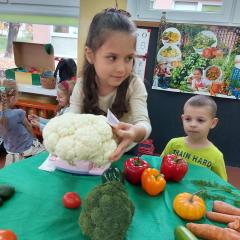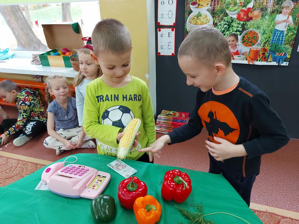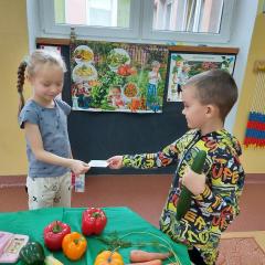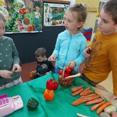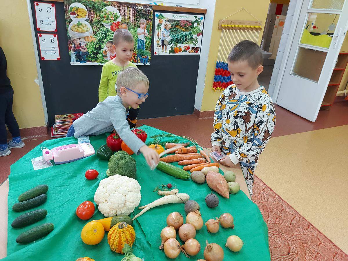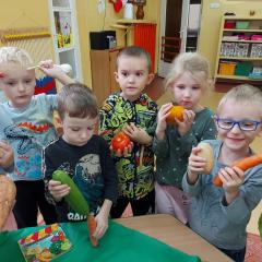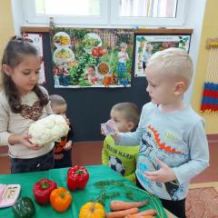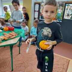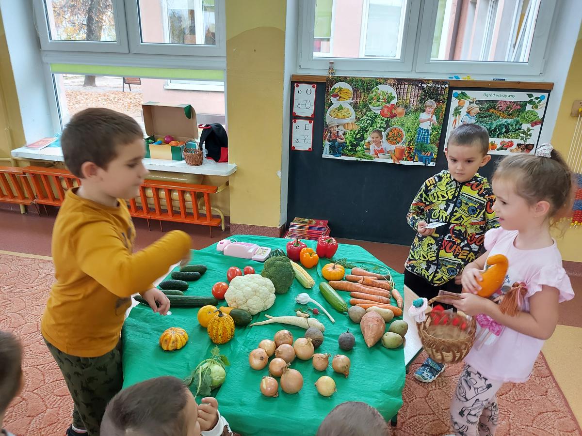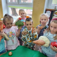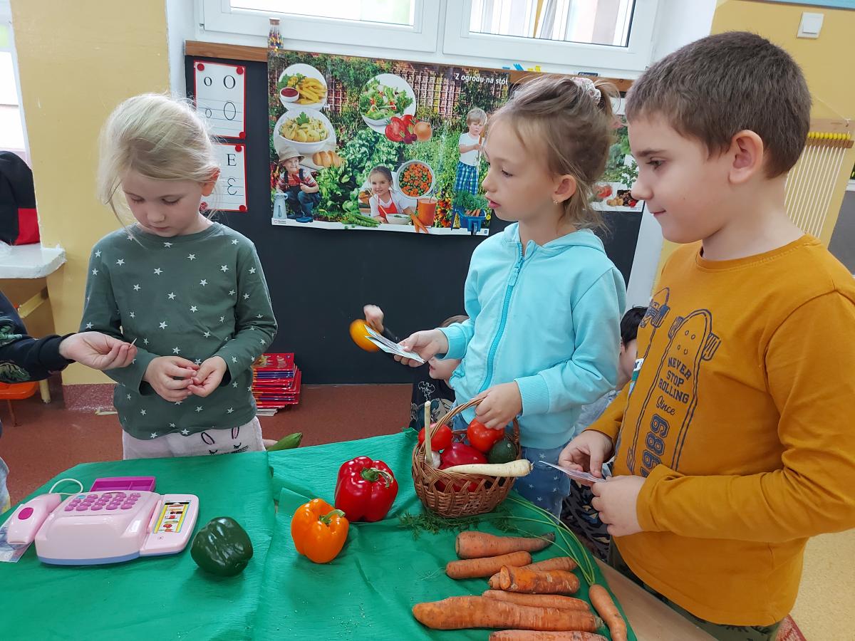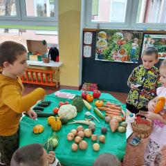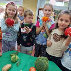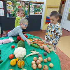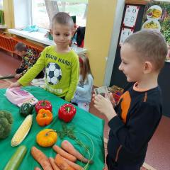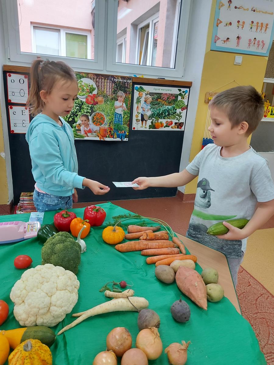 "Na straganie w dzień targowy takie słyszy się rozmowy..." . W ostatnim tygodniu motywem przewodnim naszych zajęć był wiersz Jana Brzechwy. Dzieci oglądały, nazywały, smakowały przyniesione do kącika przyrody warzywa. Dużą radość sprawiła zabawa w sklep i możliwość płacenia pieniędzmi.