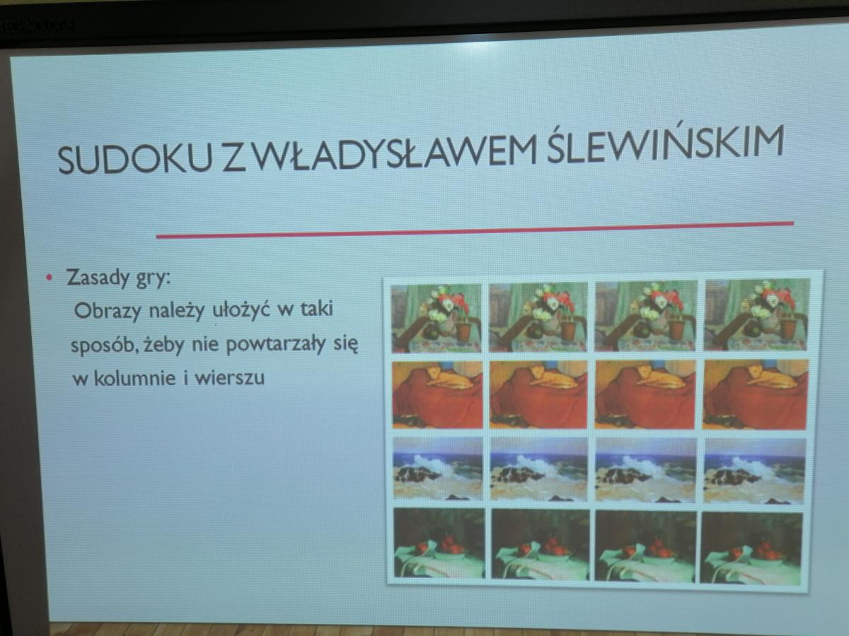 Dodane przez przedszkole22 - 25.02.2022 W ramach Ogólnopolskiego Projektu Edukacyjnego "Zabawy sztuką" Jeżyki wykonały zadanie "Sudoku z Władysławem Ślewińskim".