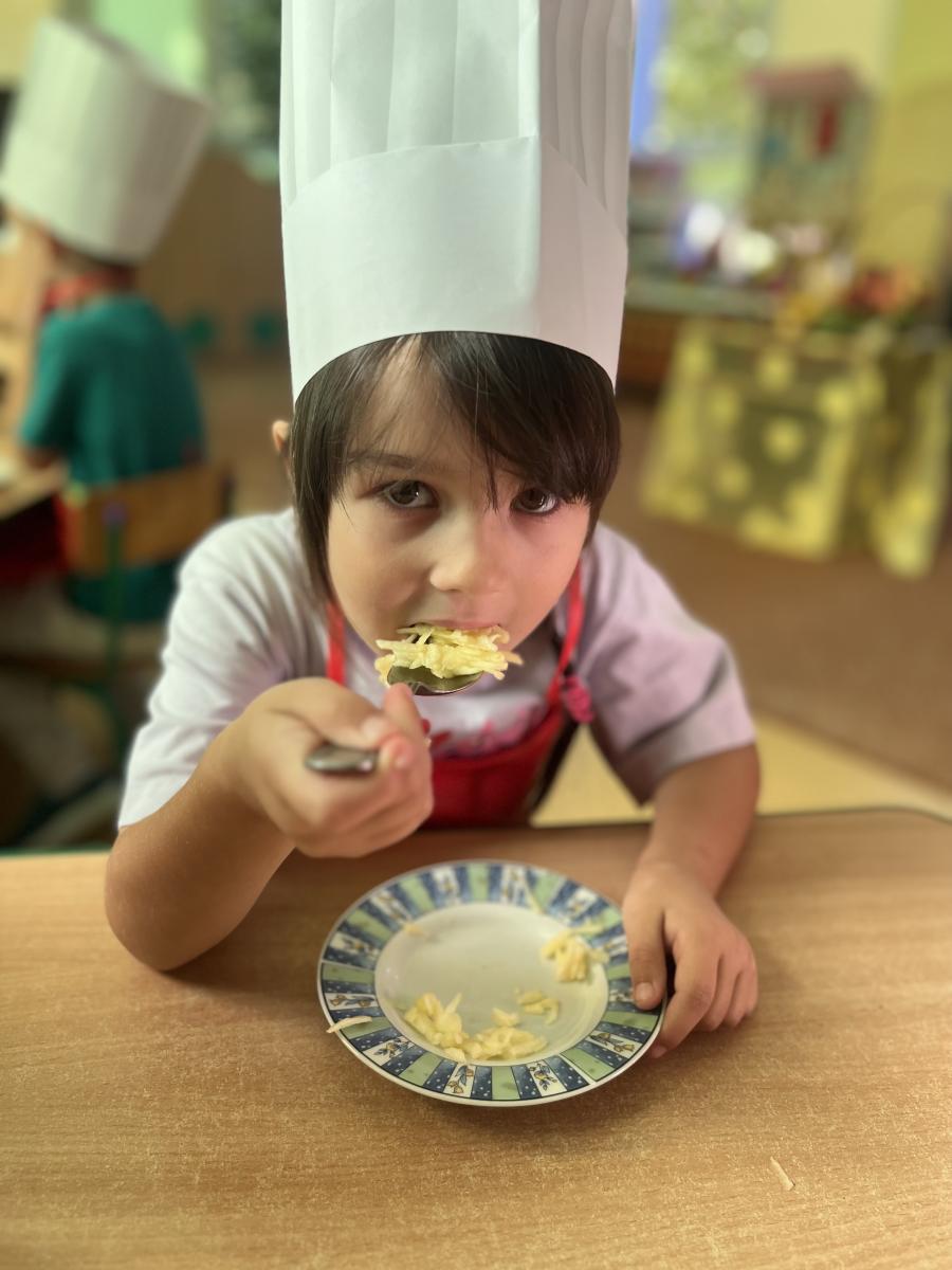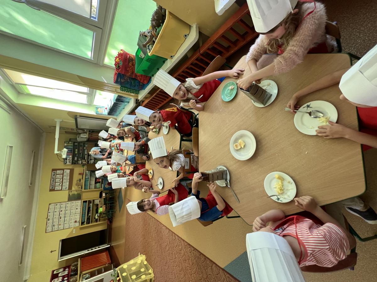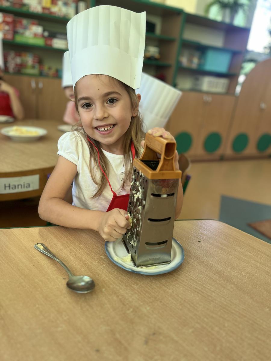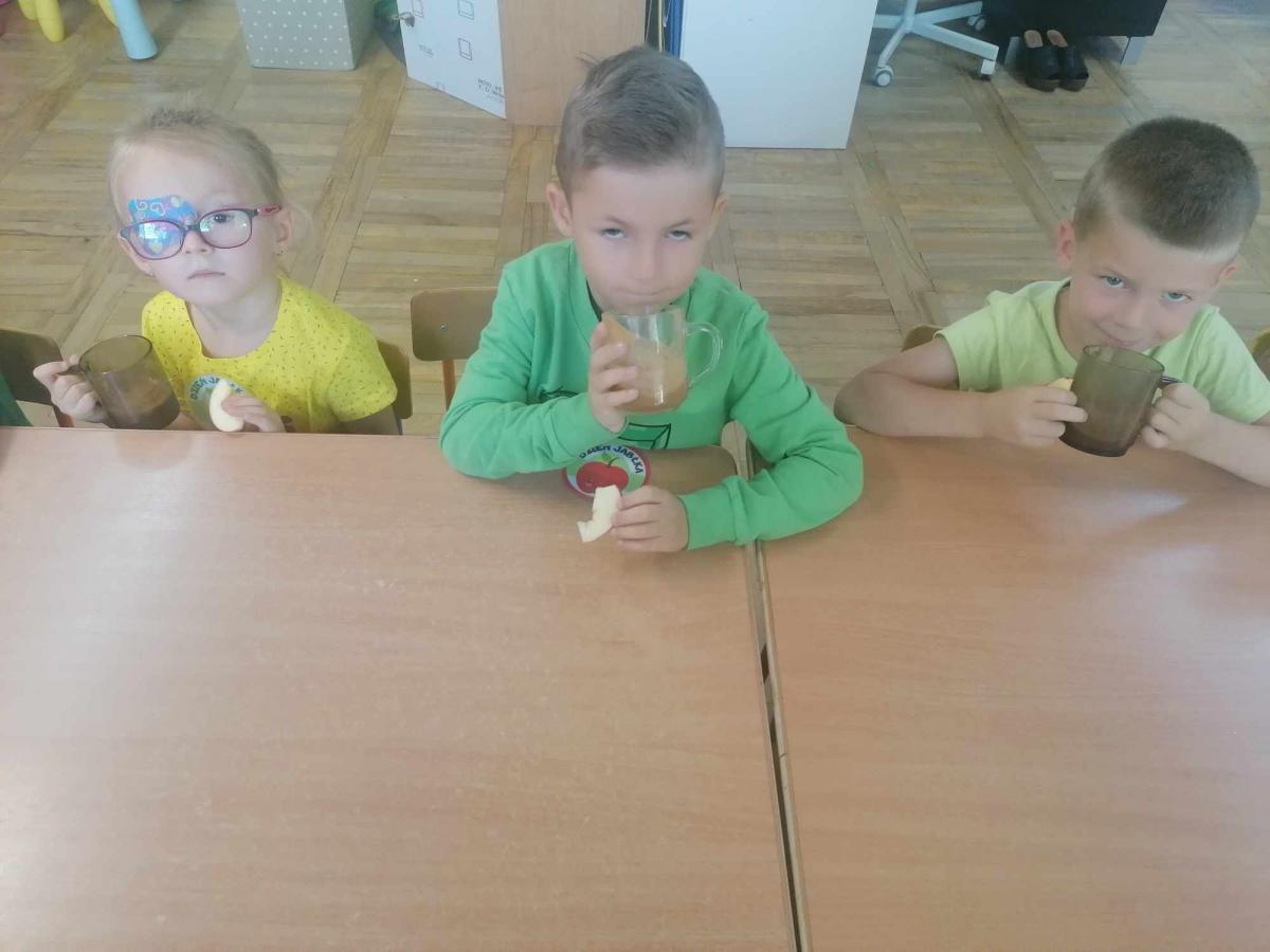 Tego dnia w przedszkolu przyrządzaliśmy jabłka pod każdą postacią. Był kompot, naturalnie wyciskany sok z jabłek, surówka z jabłka, jabłka pieczone z miodem i bakaliami oraz jabłka kosztowane na surowo.