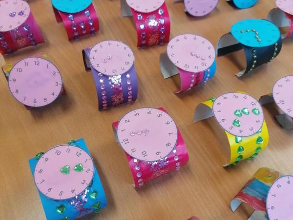 Dzieci wykonały zegarki z rolek po papierze. Każde dziecko ozdobiło swój zegarek według własnego pomysłu.