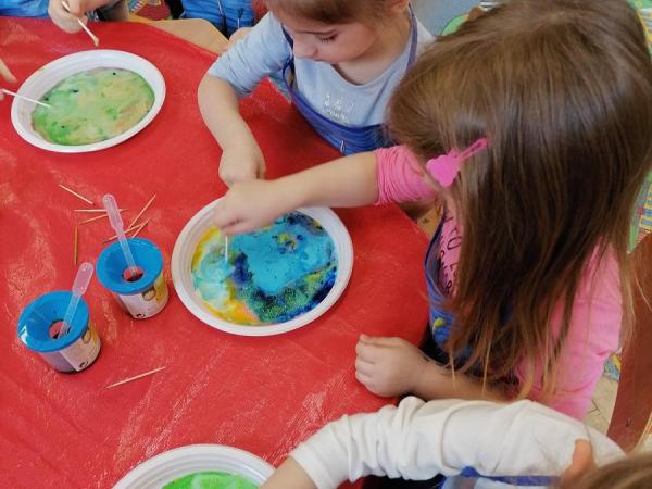 Obrazy Wojciecha Fangora były inspiracją do stworzenia galaktyki. Eksperymentując z mlekiem, barwnikami i płynem do mycia naczyń Jeżyki stworzyły ...
