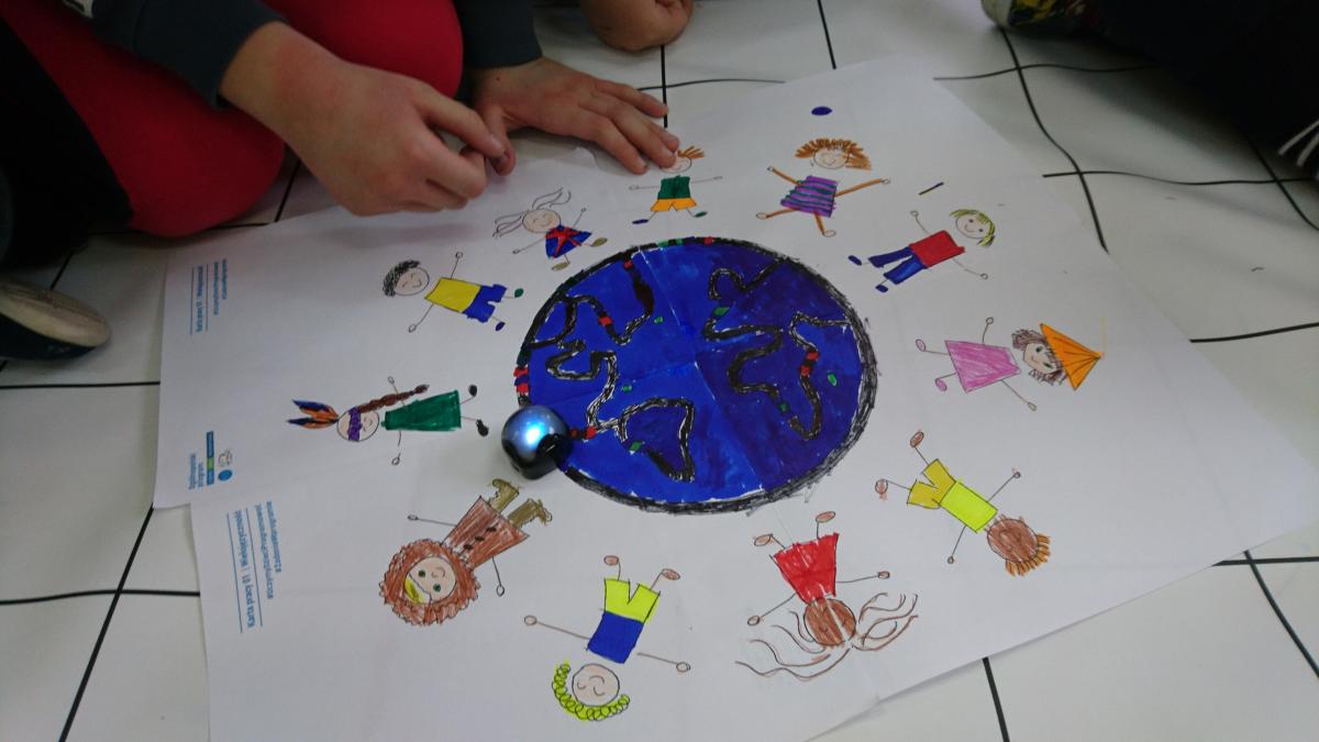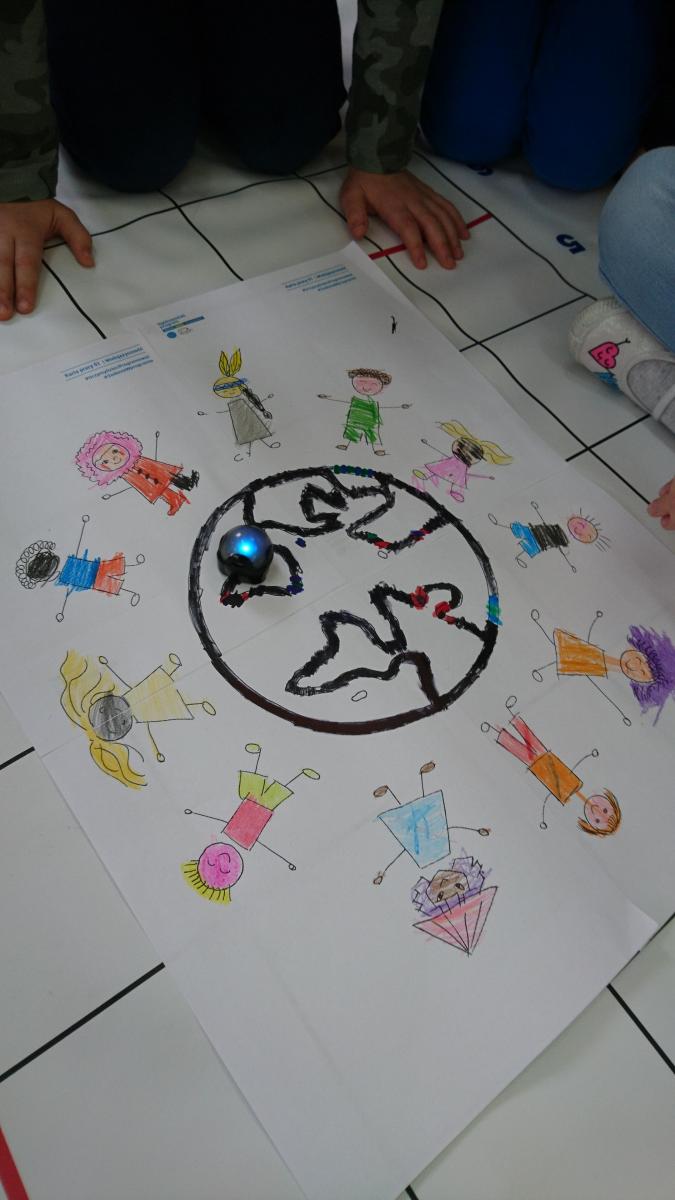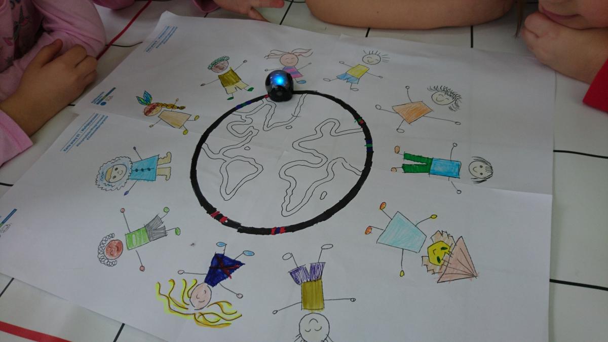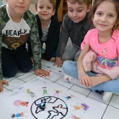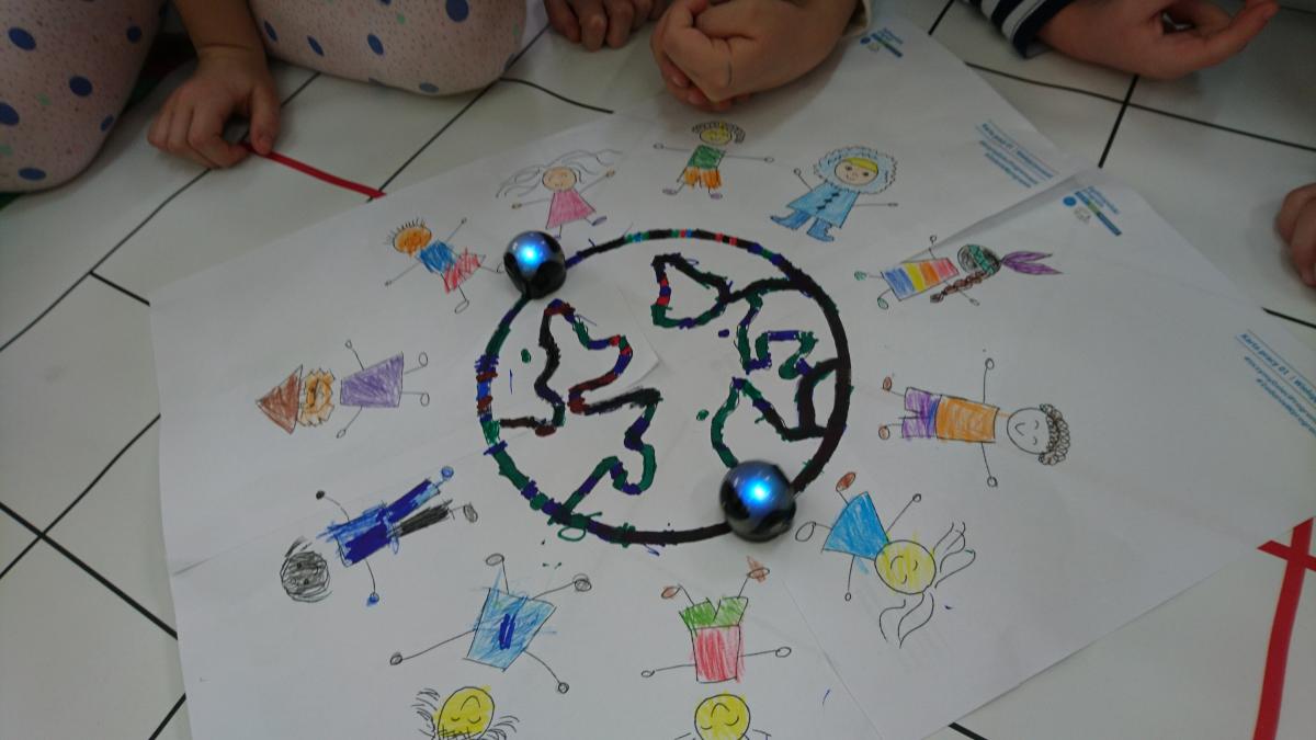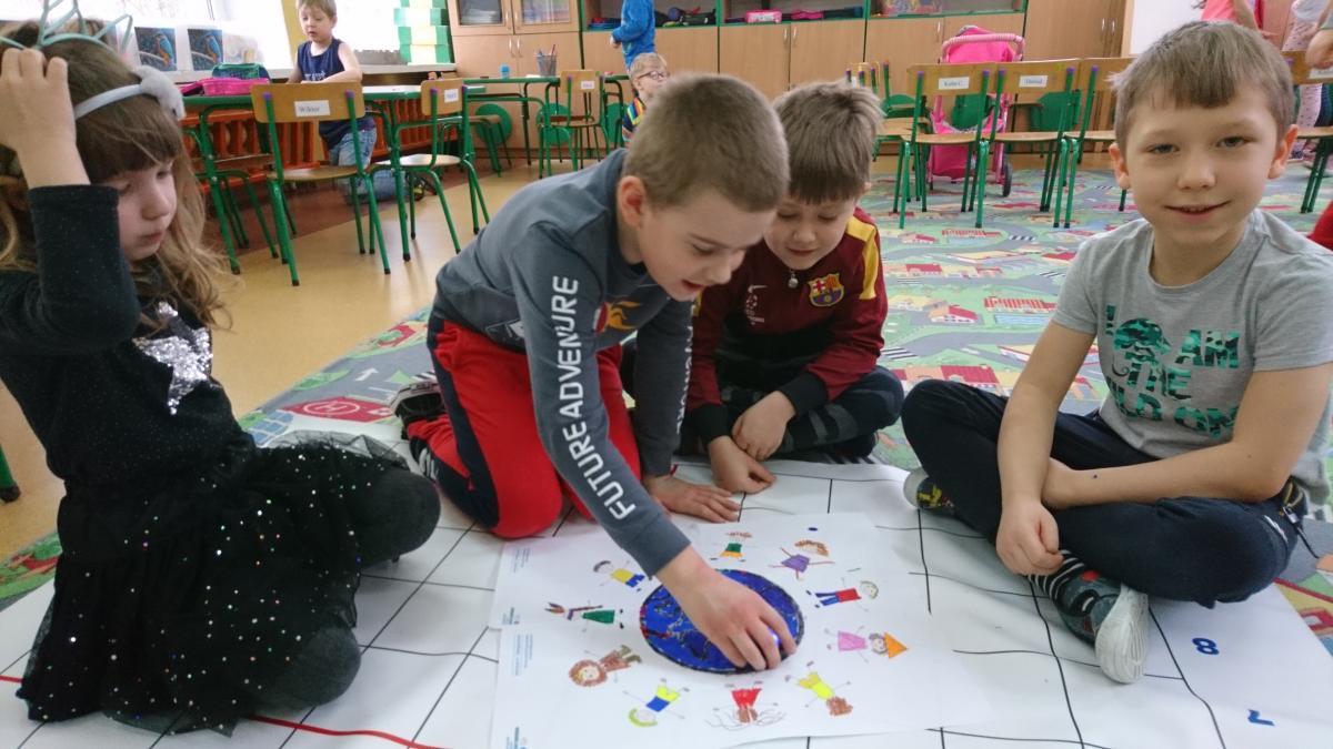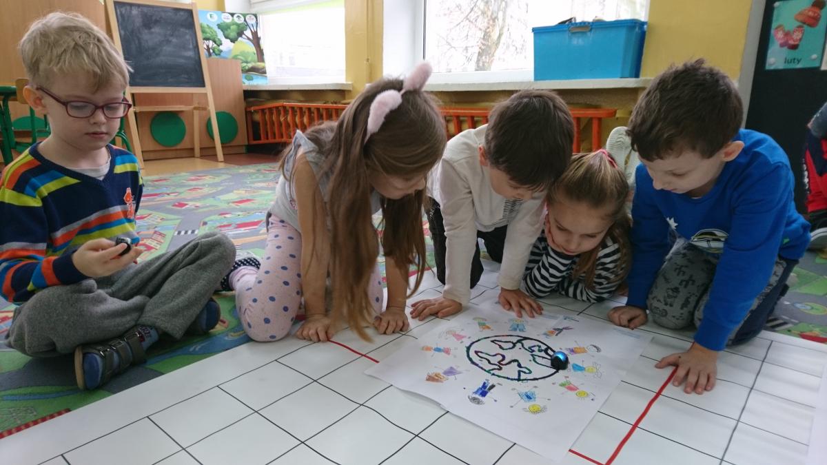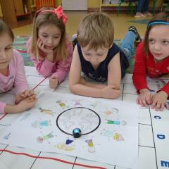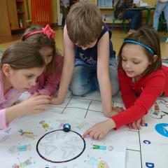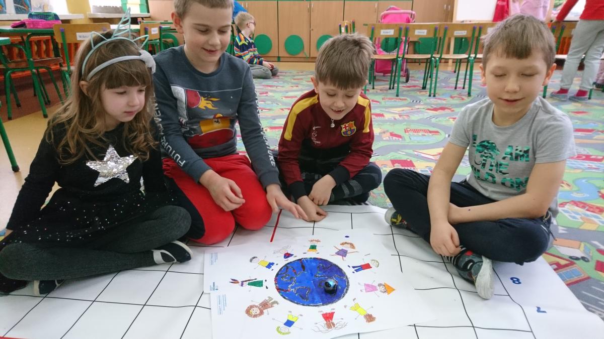 Wielojęzyczność to jedna z kompetencji kluczowych, które realizujemy w grupie Pszczółek. Na dzisiejszych zajęciach poznaliśmy dzieci zamieszkujące cały świat. Dzieci szukały na globusie Europy oraz poznawały wybrane kontynenty. Następnie pracowały z robotami - Ozobot, które okrążając kulę ziemską odwiedzały wszystkie dzieci świata. W drugiej części dnia ćwiczyliśmy koncentrację i spostrzegawczość. Na tablicy interaktywnej wyświetlone zostały flagi państw europejskich, a zadaniem dzieci było odnalezienie takich samych wśród krążków z tablicy kompetencji.