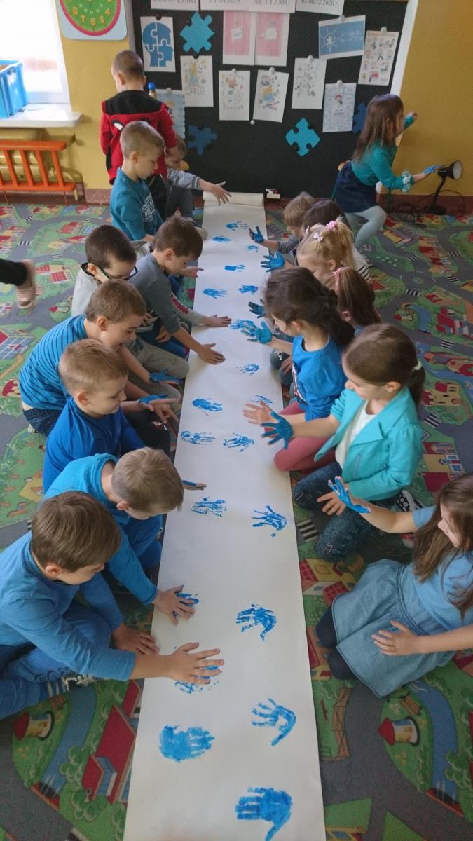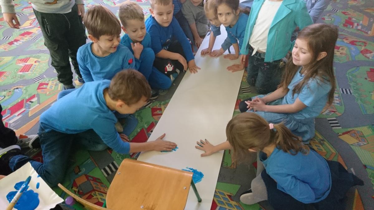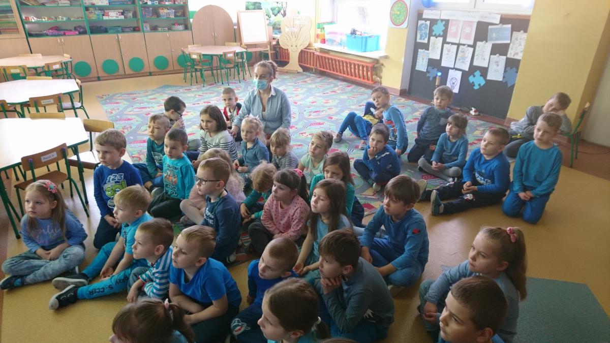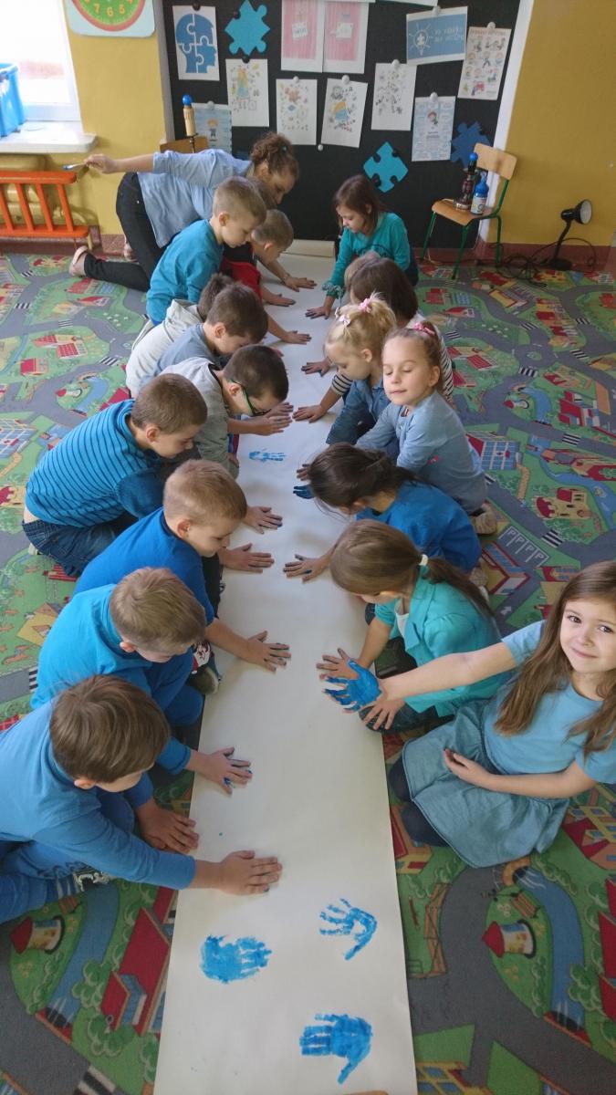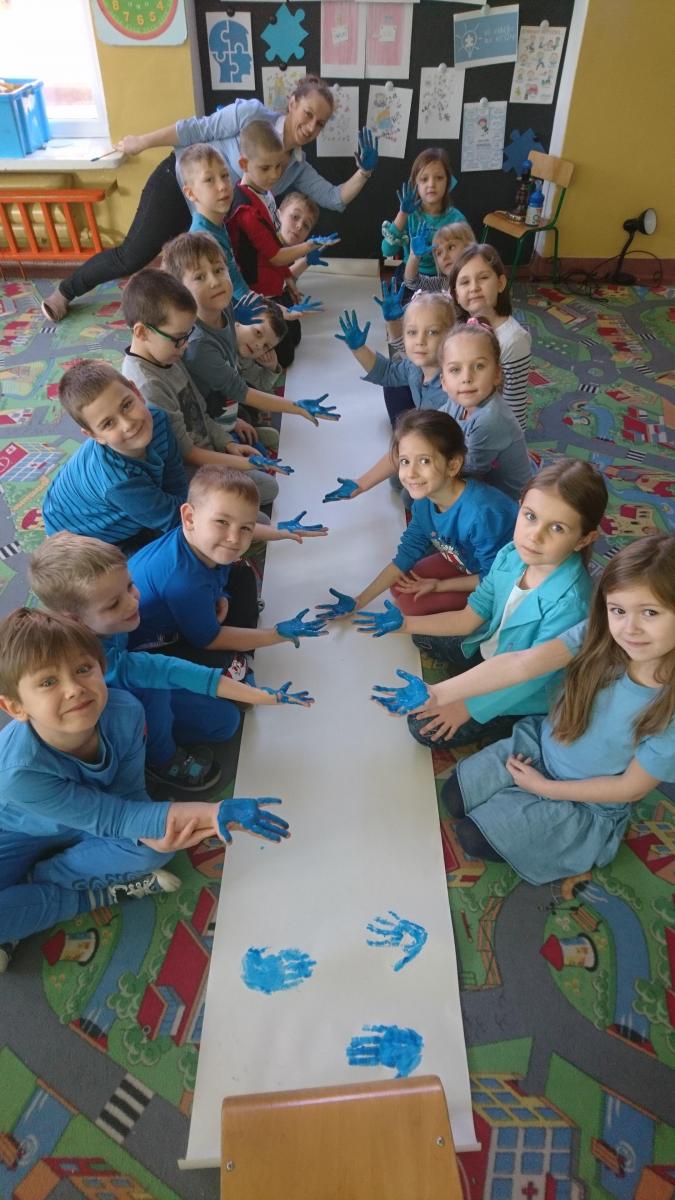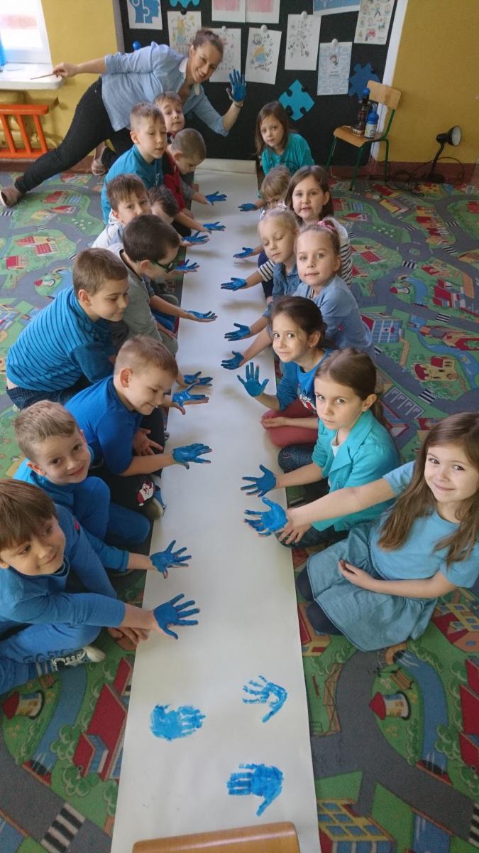 Dziś w grupie Pszczółek, w ramach Europejskiego Tygodnia Autyzmu, odbyły się zajęcia pt. Nam autyzm nie przeszkadza. Przedszkolaki na podstawie opowiadania Czarodziejka oraz filmu Amazing things Happy poznały spektrum objawów i zachowań charakterystycznych dla autyzmu oraz utrwaliły znaczenie słowa tolerancja. Pszczółki odcisnęły swoja niebieską dłoń, deklarując w ten sposób życzliwość i zrozumienie dla osób z autyzmem. Podczas dzisiejszego dnia towarzyszył nam niebieski kolor.