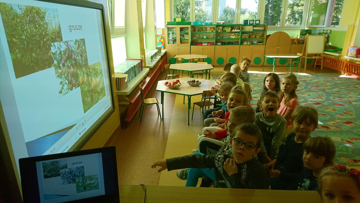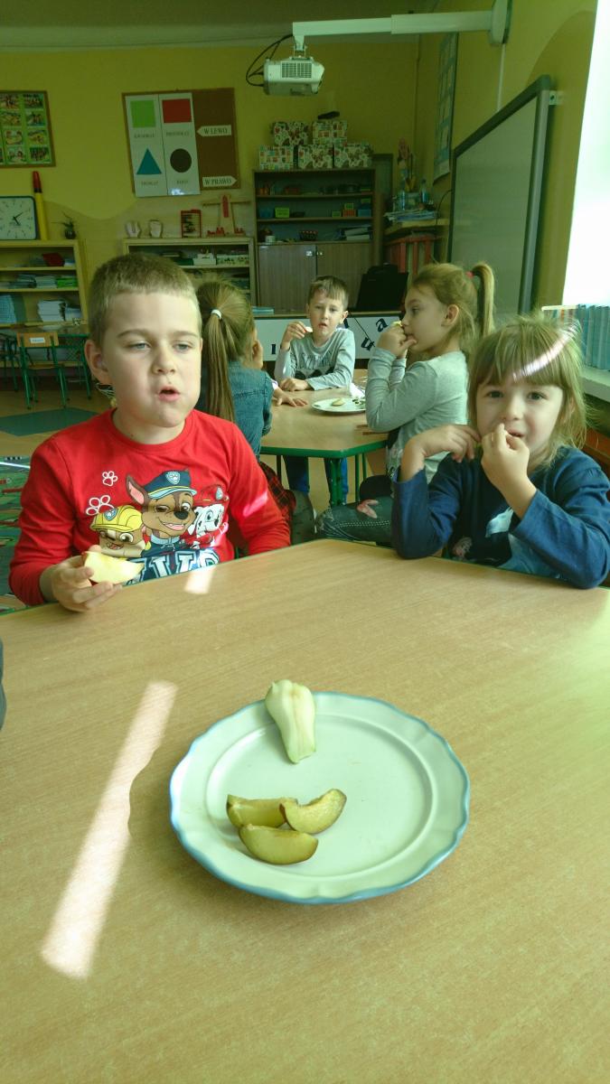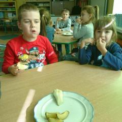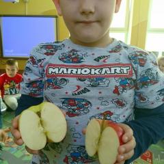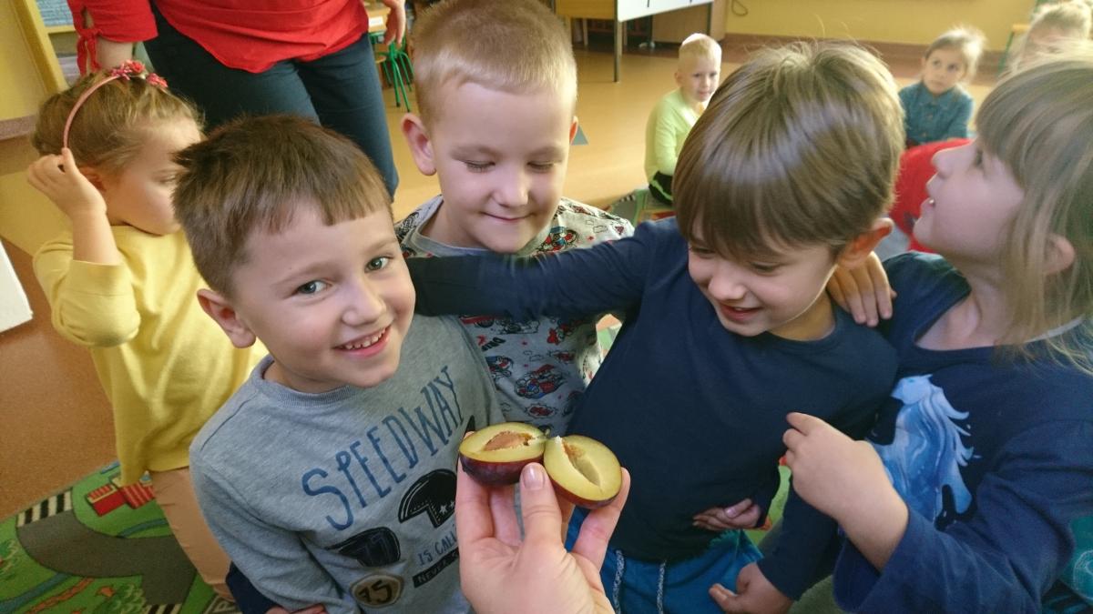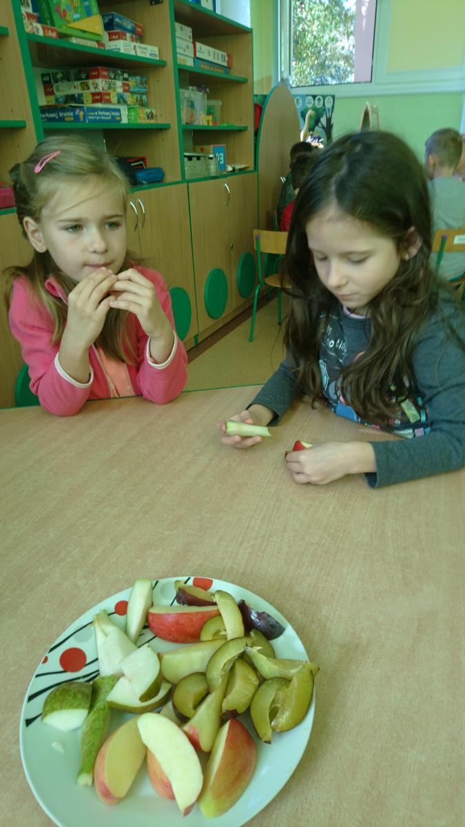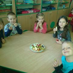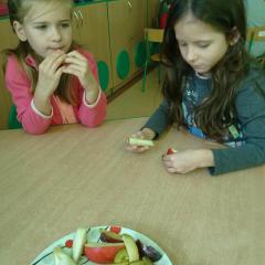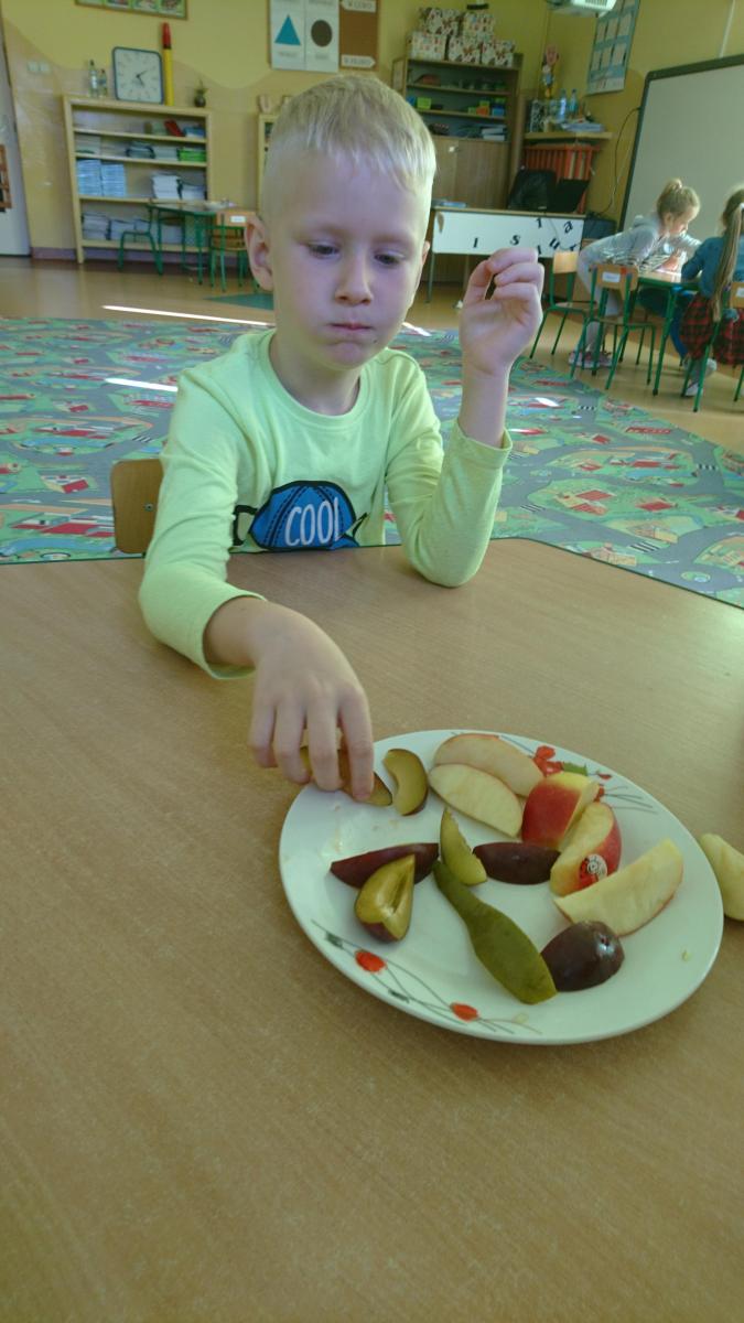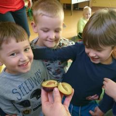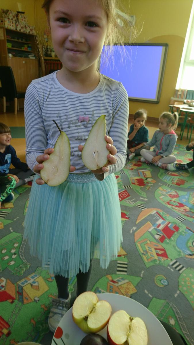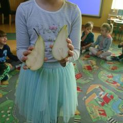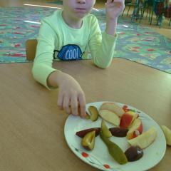 W tym tygodniu tematem naszych zajęć są owoce. Na dzisiejszych zajęciach obejrzeliśmy prezentację "Drzewa owocowe", omówiliśmy wygląd gruszki, jabłka i śliwki. Dzieci pytały swoich kolegów "Jaki owoc masz?, Powiedz czy go znasz." Następnie dzieci degustowały i określały jaki owoc jedzą. Poznaliśmy nowe słowa: sad, jabłoń, grusza, śliwa.