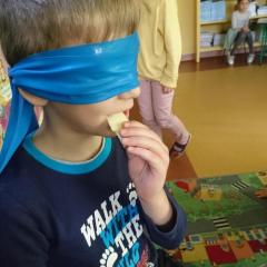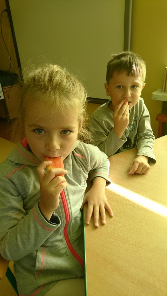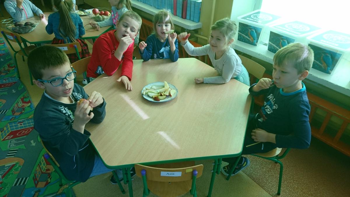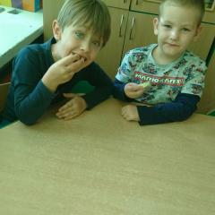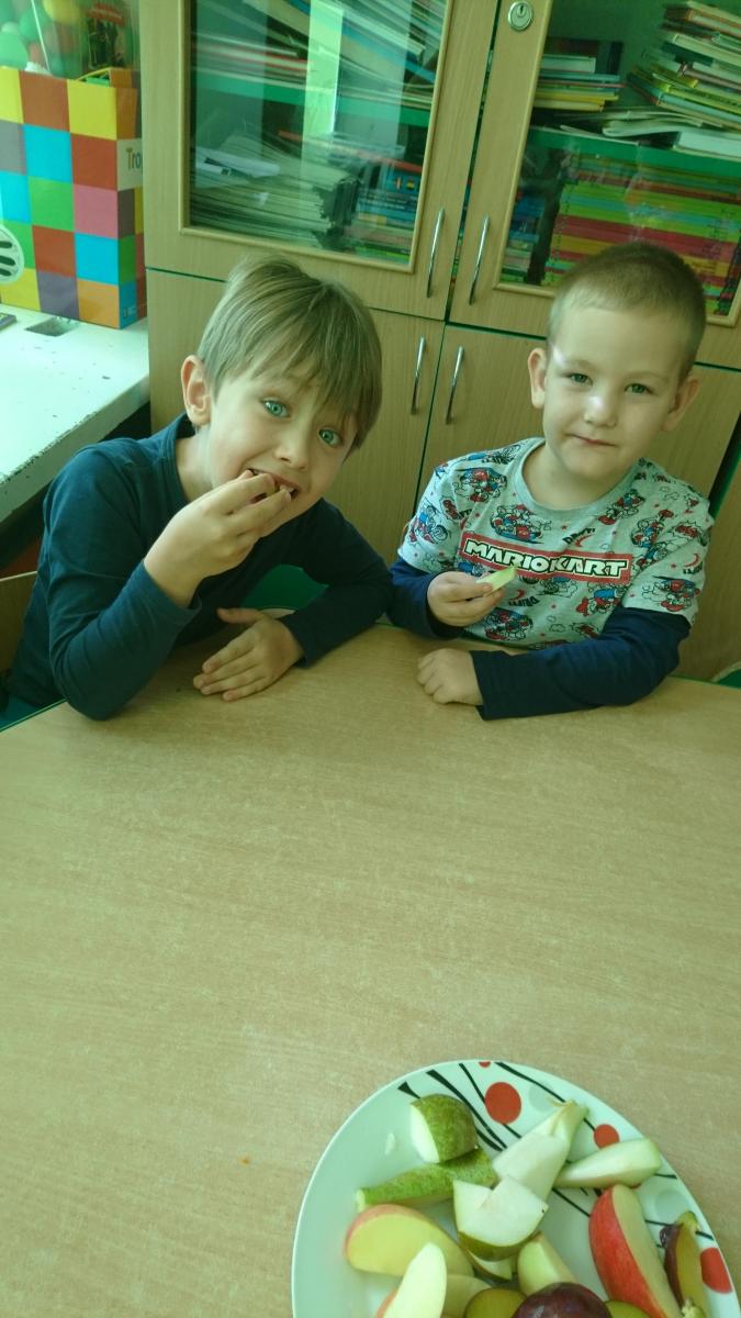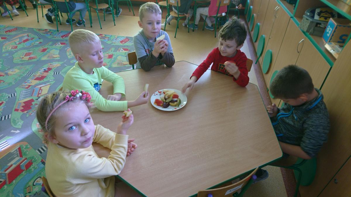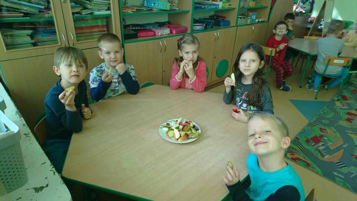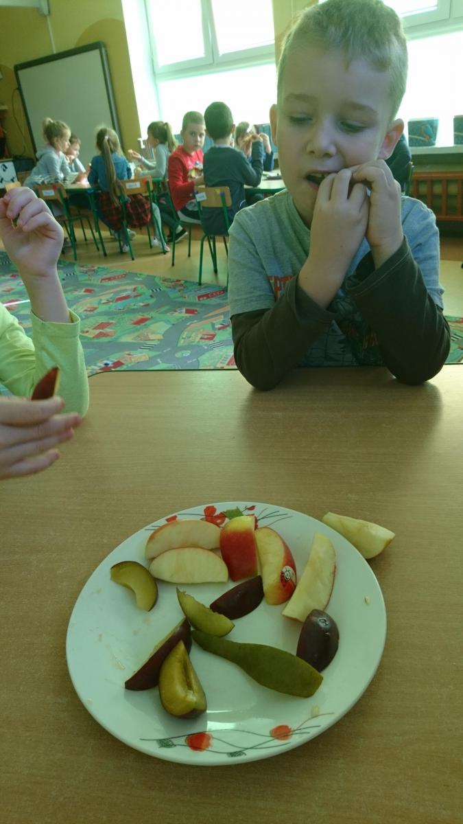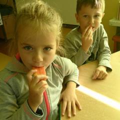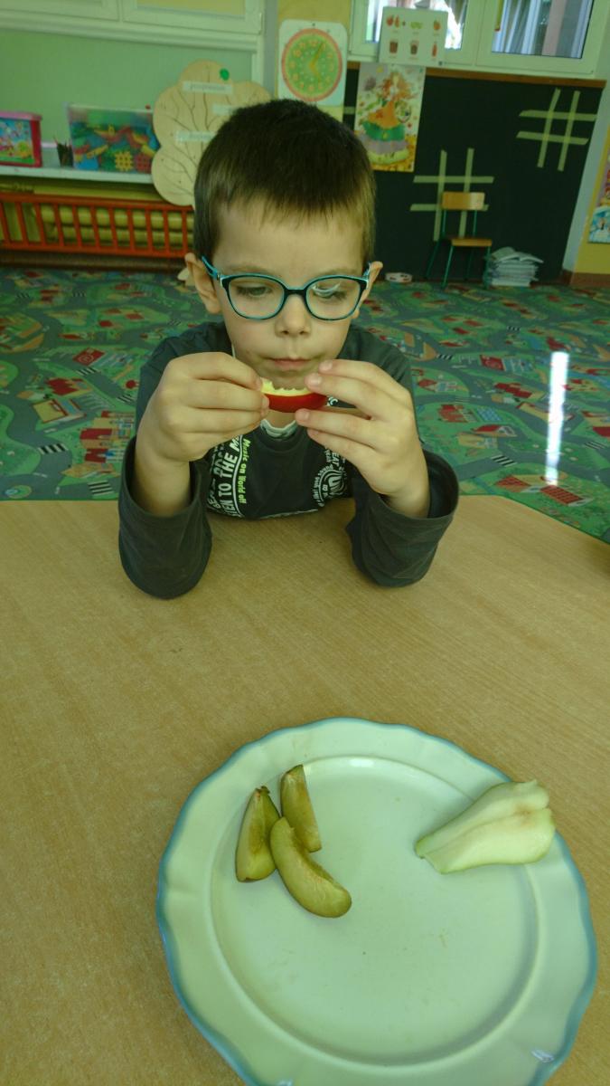 W tym tygodniu tematem naszych zajęć są owoce. Na dzisiejszych zajęciach obejrzeliśmy prezentację "Drzewa owocowe", omówiliśmy wygląd gruszki, jabłka i śliwki. Dzieci pytały swoich kolegów "Jaki owoc masz?, Powiedz czy go znasz." Następnie dzieci degustowały i określały jaki owoc jedzą. Poznaliśmy nowe słowa: sad, jabłoń, grusza, śliwa.
