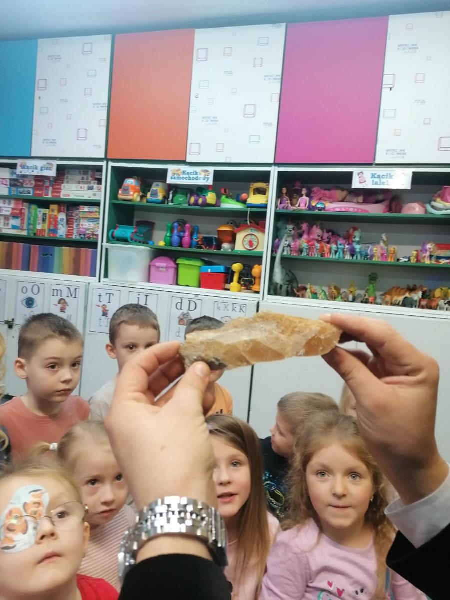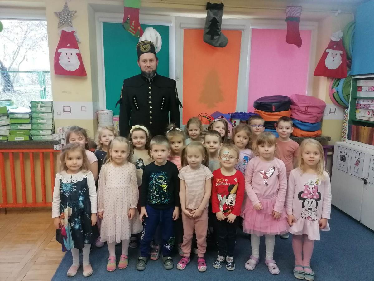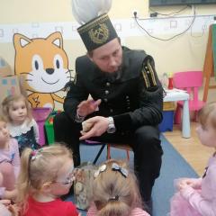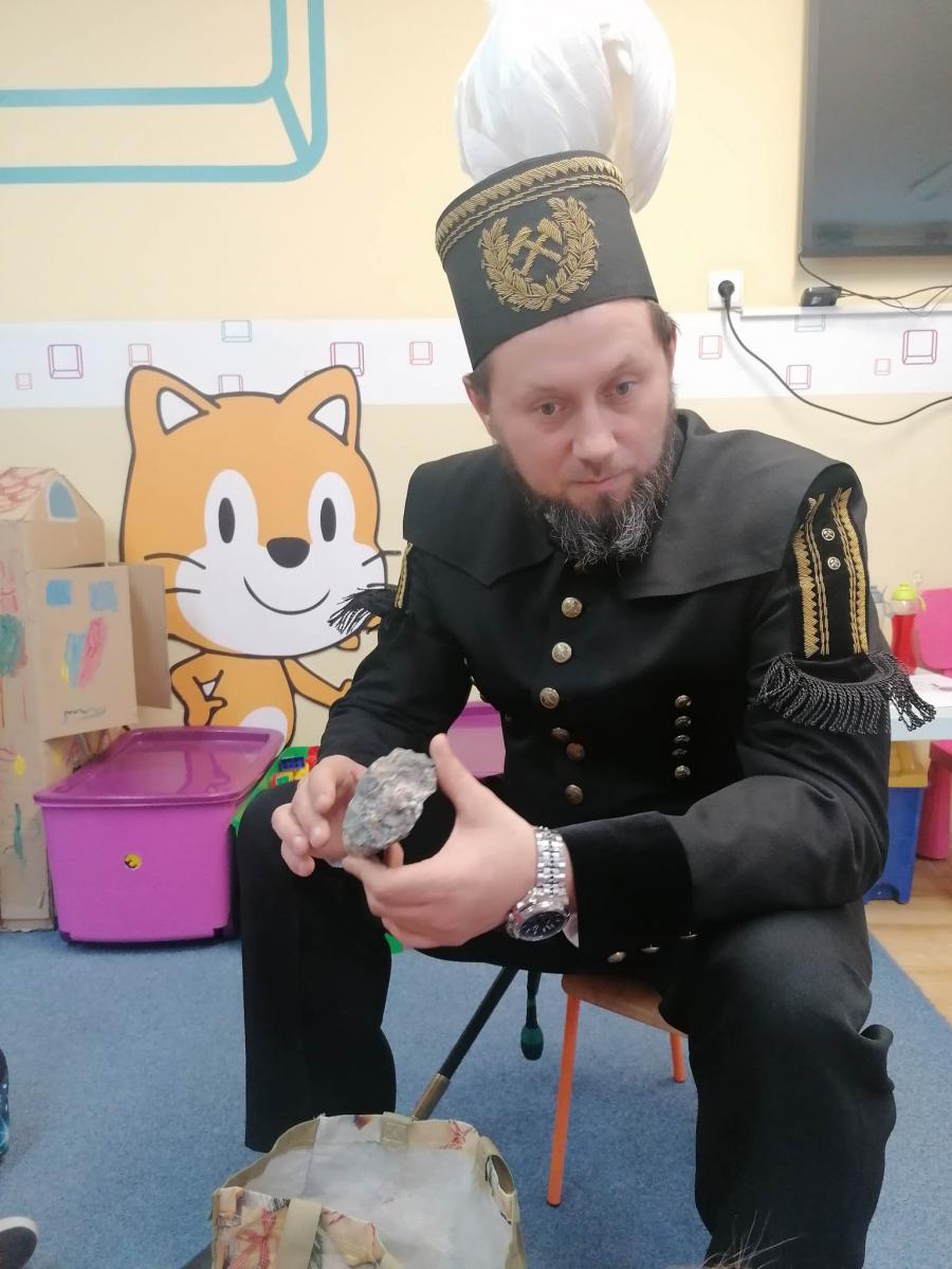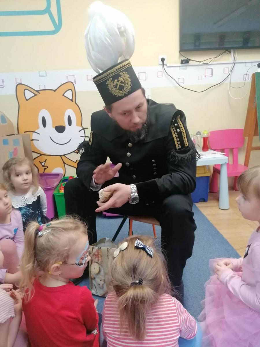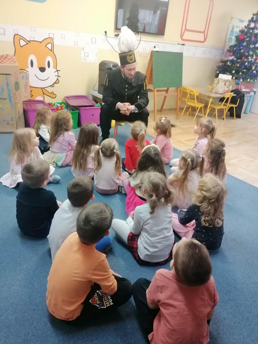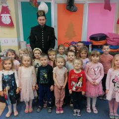 4 grudnia obchodzimy Dzień Górnika potocznie zwany Barbórką. Chcąc przybliżyć dzieciom trudną i odpowiedzialną pracę w kopalni, zaprosiliśmy do przedszkola Kierownika Ruchu Zakładu Górniczego Kopalni Gipsu ,,Leszcze" Pana Daniela. Nasz gość ubrany w galowy mundur opowiedział dzieciom o kopalniach odkrywkowych jak i podziemnych. Szczegółowo opisał swój strój, czapkę - czako z górniczym godłem - kupla. Na czako widnieje pyrlik, który leży na żelazku. To narzędzia którymi posługiwali się górnicy. Pióropusze występujące w kolorach białym, zielonym, czarnym, czerwonym, oraz kordzik- honorowa szpada górnicza. Pan Daniel wyjaśnił dzieciom czym są naszyte na czarnym aksamicie na rękawach dystynkcje- stopnie górnicze. Nasz gość pokazał przedszkolakom rodzaje kruszyw jakie możemy wydobywać w kopalniach. Na konie dzieci zakodowały czapkę górniczą - czako z biały pióropuszem.