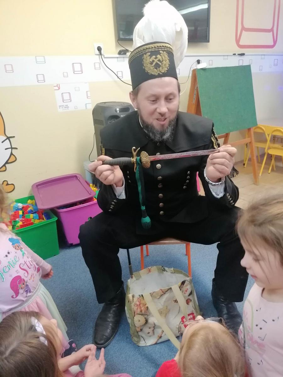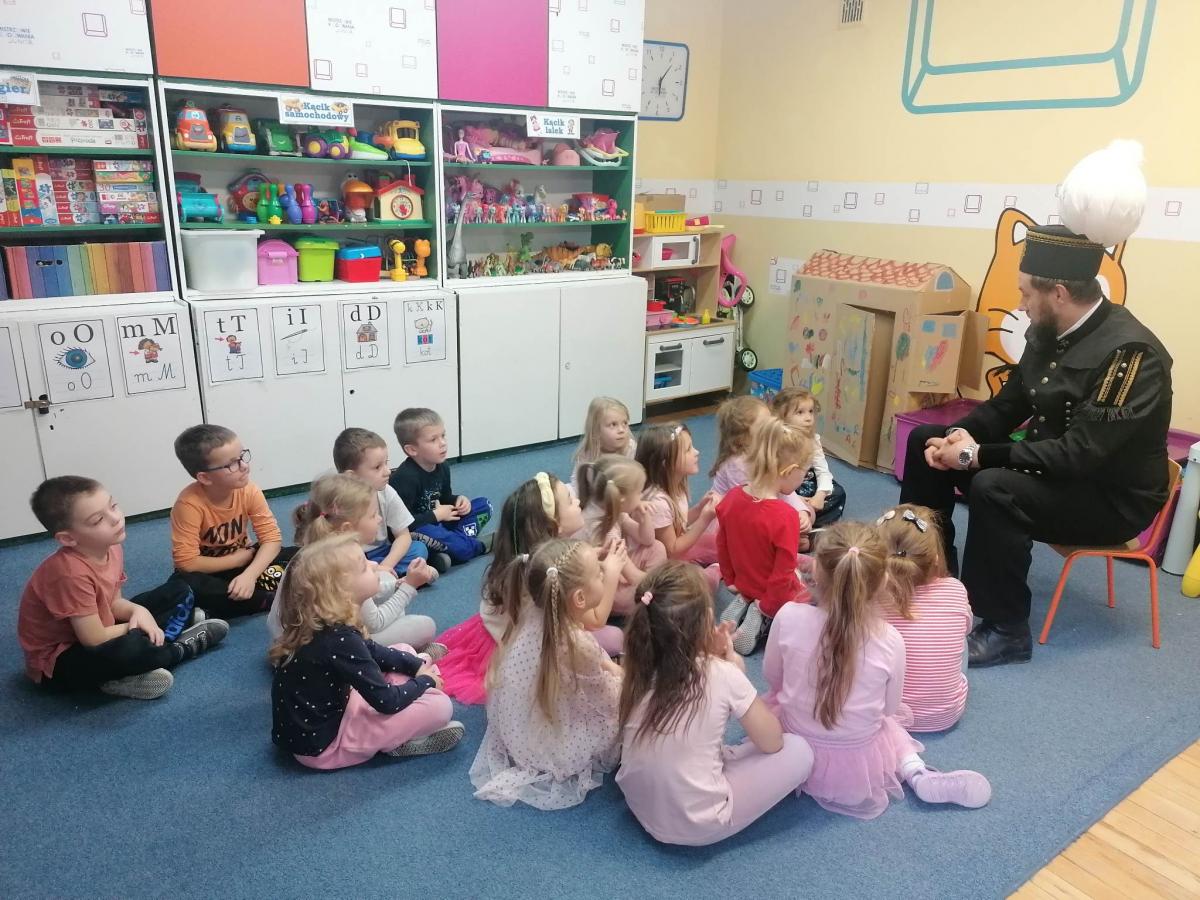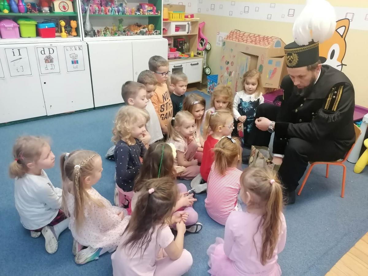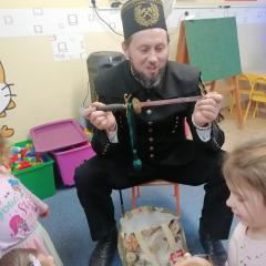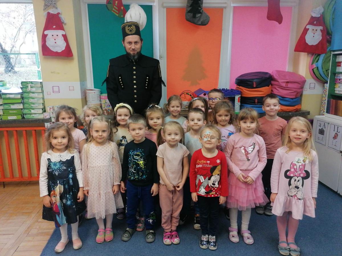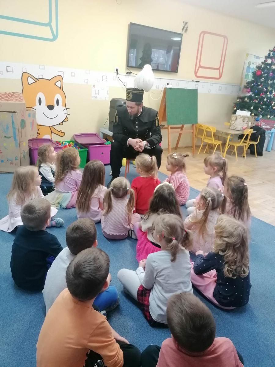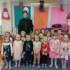 4 grudnia obchodzimy Dzień Górnika potocznie zwany Barbórką. Chcąc przybliżyć dzieciom trudną i odpowiedzialną pracę w kopalni, zaprosiliśmy do przedszkola Kierownika Ruchu Zakładu Górniczego Kopalni Gipsu ,,Leszcze" Pana Daniela. Nasz gość ubrany w galowy mundur opowiedział dzieciom o kopalniach odkrywkowych jak i podziemnych. Szczegółowo opisał swój strój, czapkę - czako z górniczym godłem - kupla. Na czako widnieje pyrlik, który leży na żelazku. To narzędzia którymi posługiwali się górnicy. Pióropusze występujące w kolorach białym, zielonym, czarnym, czerwonym, oraz kordzik- honorowa szpada górnicza. Pan Daniel wyjaśnił dzieciom czym są naszyte na czarnym aksamicie na rękawach dystynkcje- stopnie górnicze. Nasz gość pokazał przedszkolakom rodzaje kruszyw jakie możemy wydobywać w kopalniach. Na konie dzieci zakodowały czapkę górniczą - czako z biały pióropuszem.