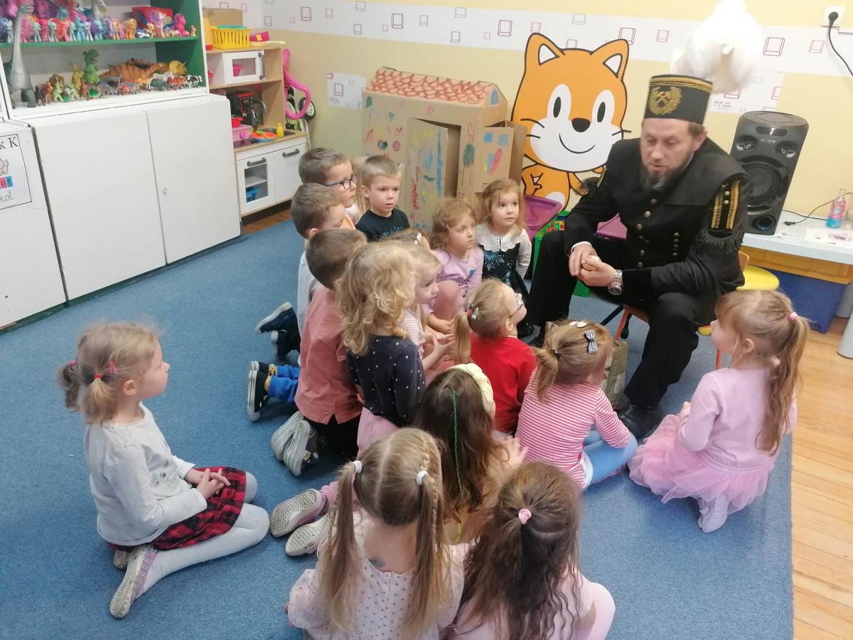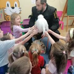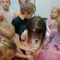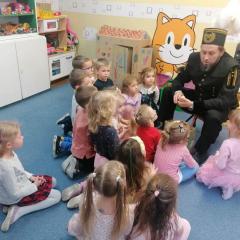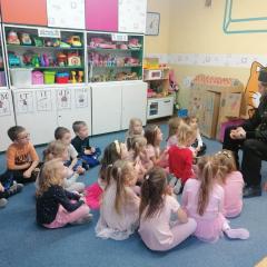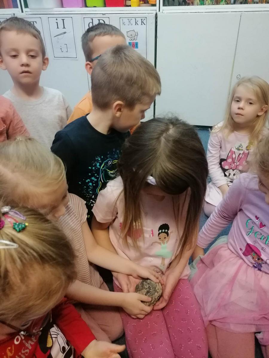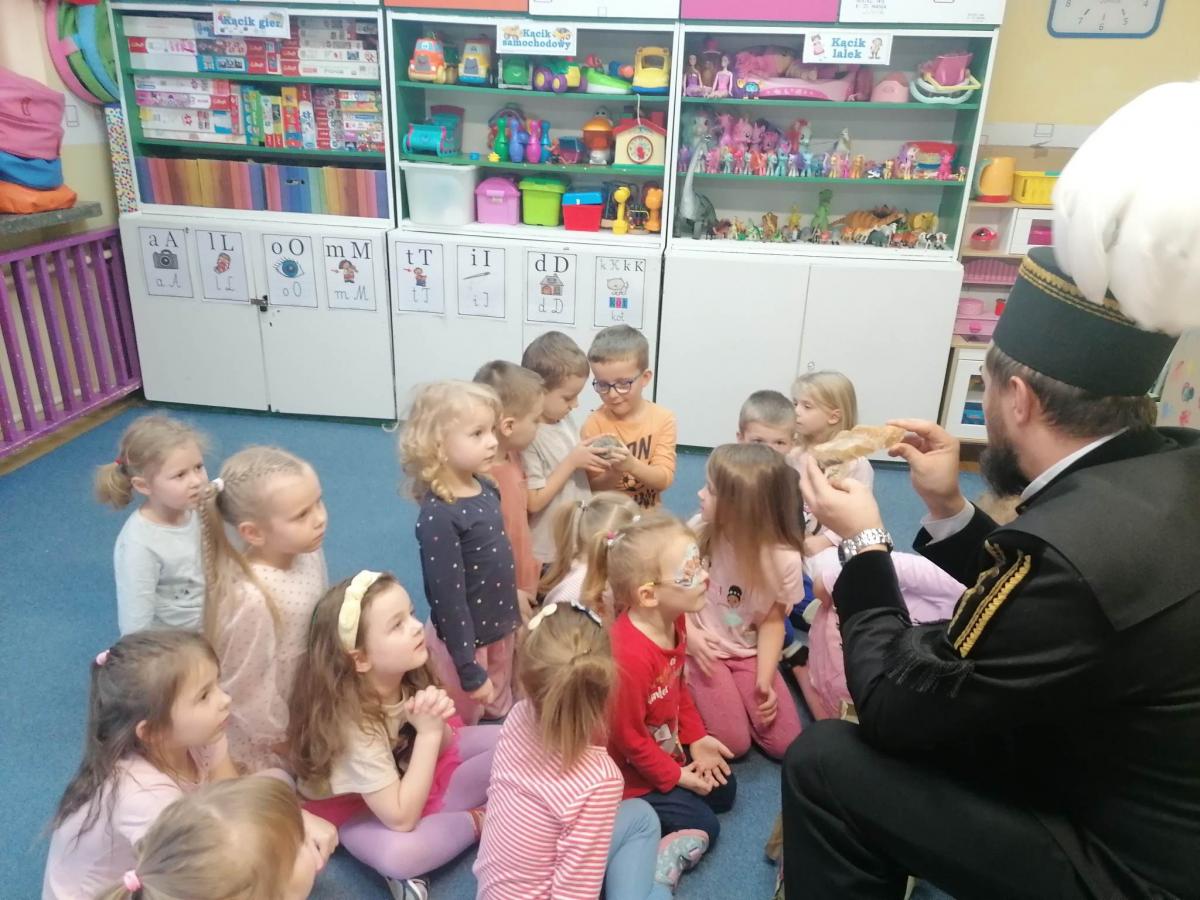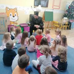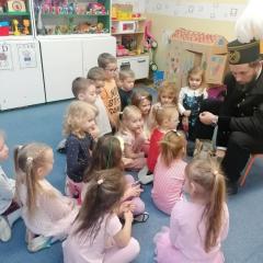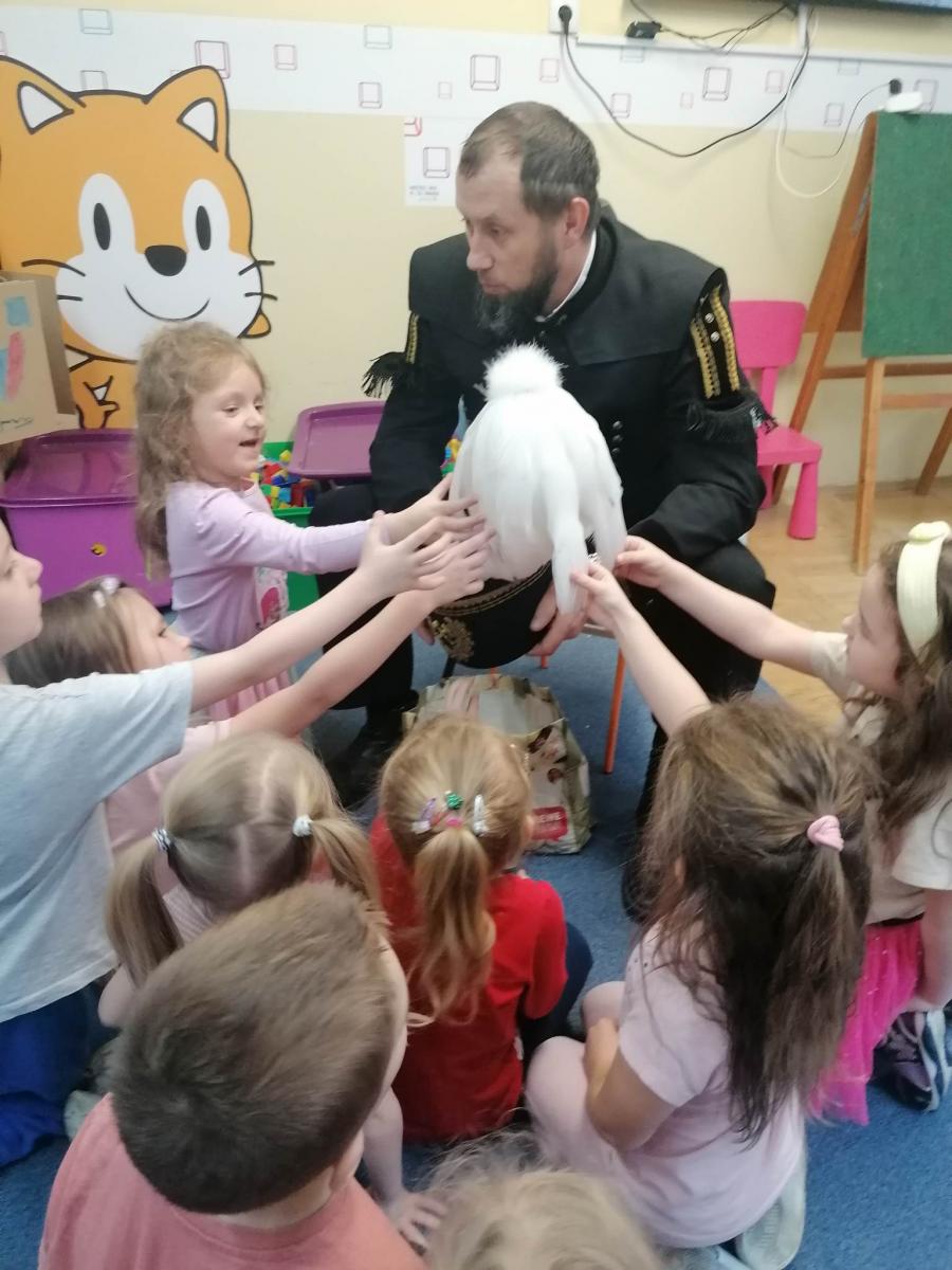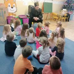 4 grudnia obchodzimy Dzień Górnika potocznie zwany Barbórką. Chcąc przybliżyć dzieciom trudną i odpowiedzialną pracę w kopalni, zaprosiliśmy do przedszkola Kierownika Ruchu Zakładu Górniczego Kopalni Gipsu ,,Leszcze" Pana Daniela. Nasz gość ubrany w galowy mundur opowiedział dzieciom o kopalniach odkrywkowych jak i podziemnych. Szczegółowo opisał swój strój, czapkę - czako z górniczym godłem - kupla. Na czako widnieje pyrlik, który leży na żelazku. To narzędzia którymi posługiwali się górnicy. Pióropusze występujące w kolorach białym, zielonym, czarnym, czerwonym, oraz kordzik- honorowa szpada górnicza. Pan Daniel wyjaśnił dzieciom czym są naszyte na czarnym aksamicie na rękawach dystynkcje- stopnie górnicze. Nasz gość pokazał przedszkolakom rodzaje kruszyw jakie możemy wydobywać w kopalniach. Na konie dzieci zakodowały czapkę górniczą - czako z biały pióropuszem.