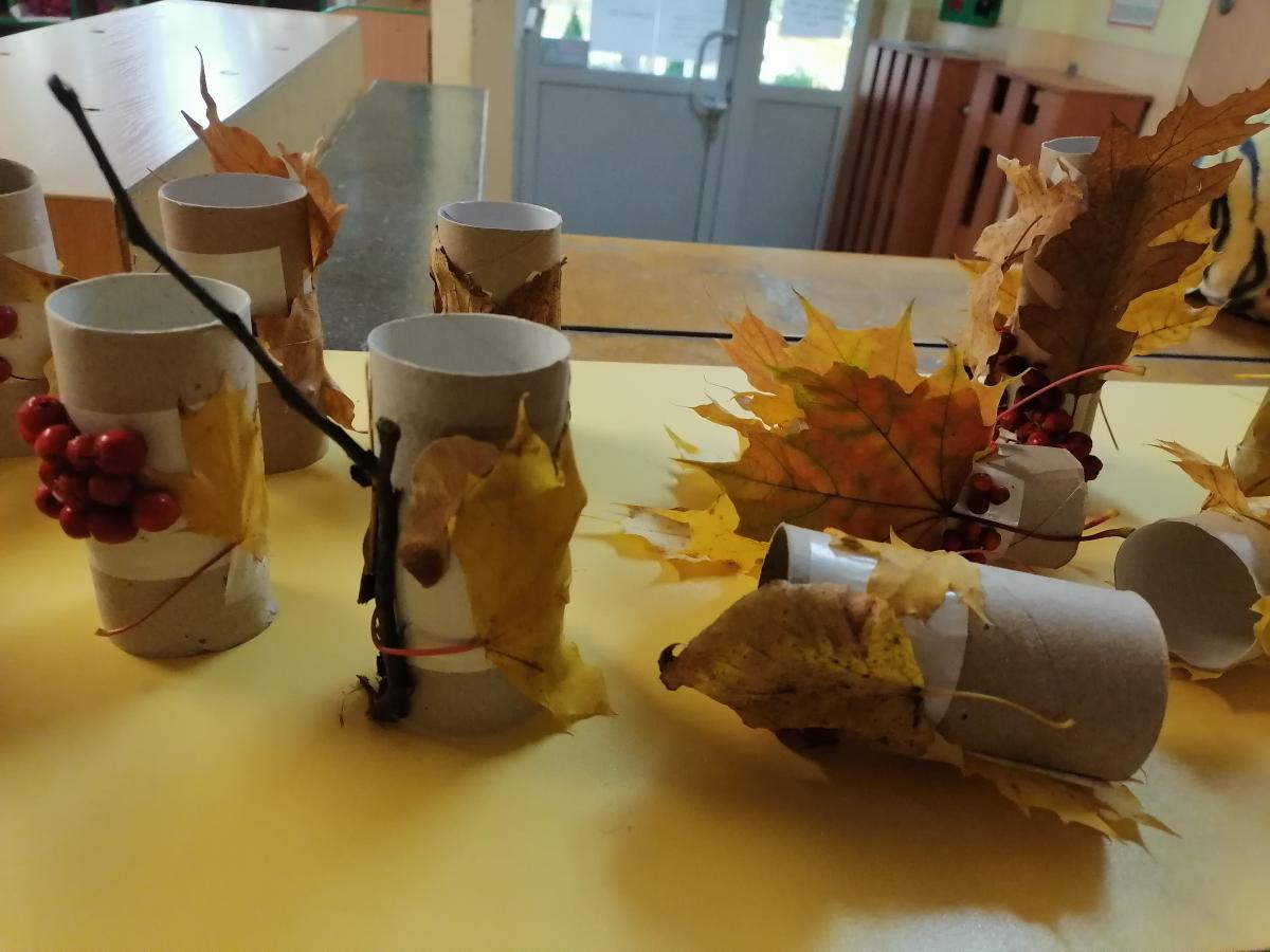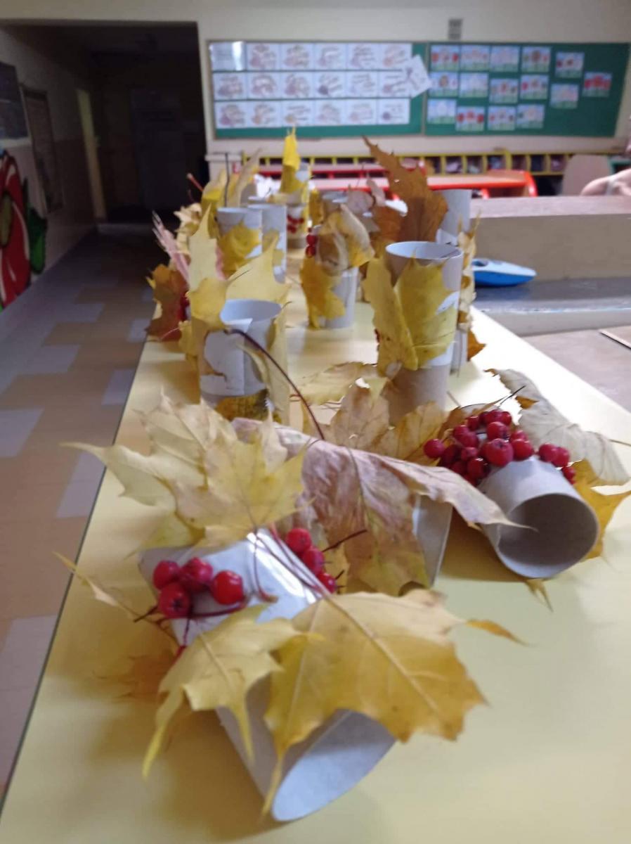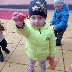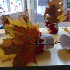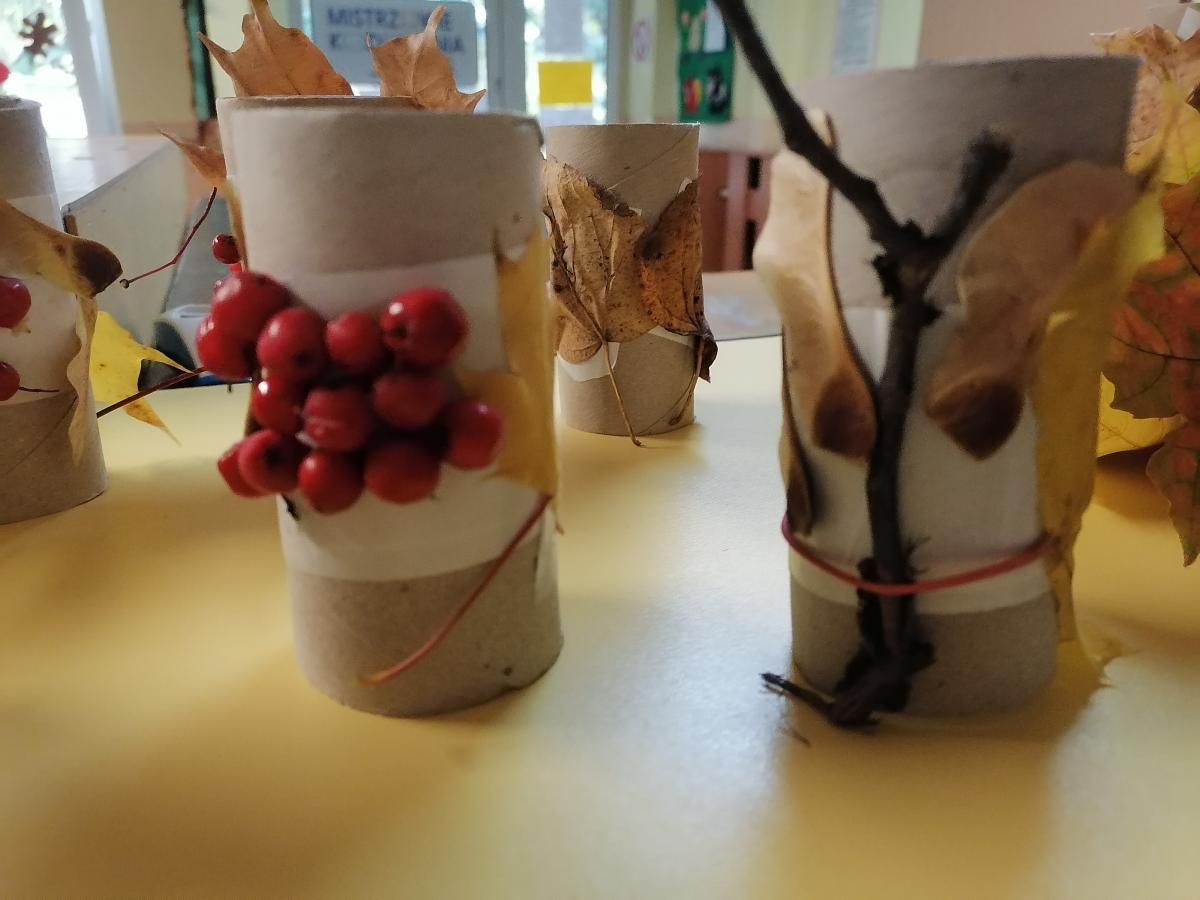W ramach ogólnopolskiego projektu "Z darami natury świat nie jest ponury" Jeżyki wykonały zadanie ,,Rolka po papierze na spacer się wybierze ". Naszym pomysłem na zrealizowanie go było stworzenie kompozycji z darów jesieni. Maluszki otrzymały rolki z przyklejoną taśmą dwustronną , do której przytwierdzały listki, korale jarzębiny, noski klonu i małe patyczki. ???