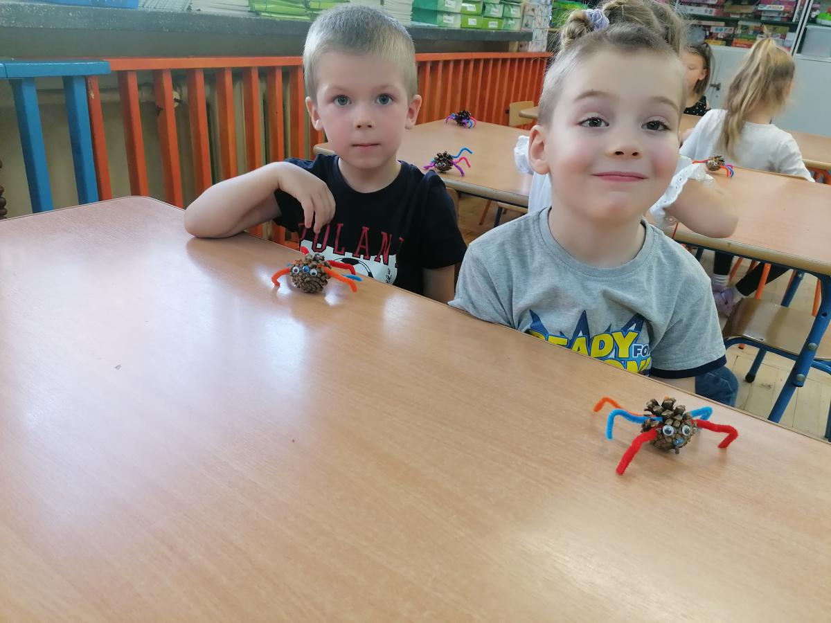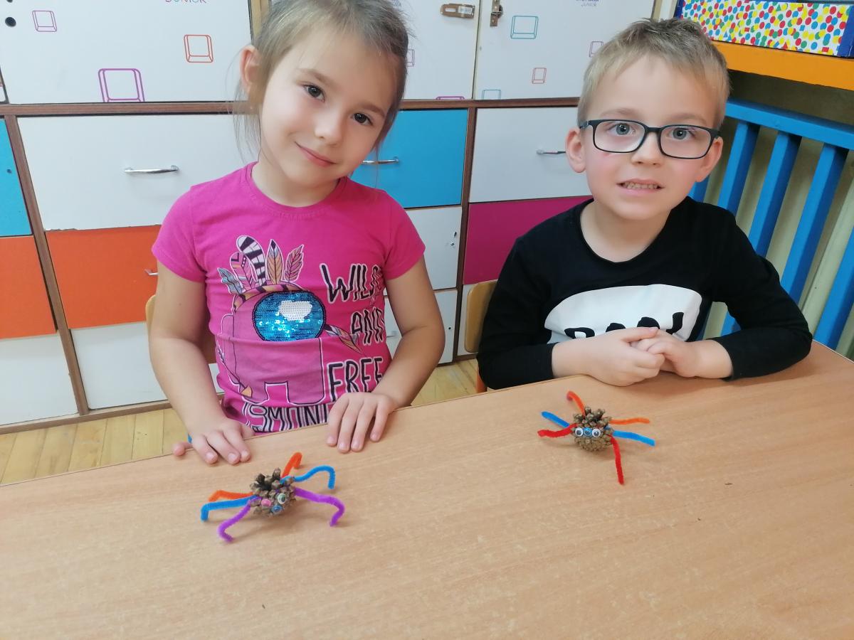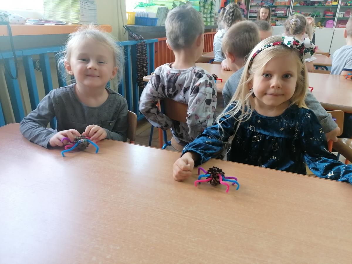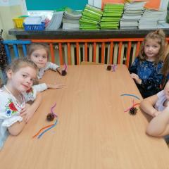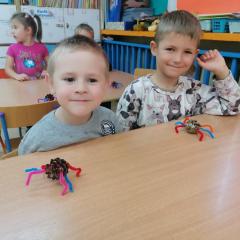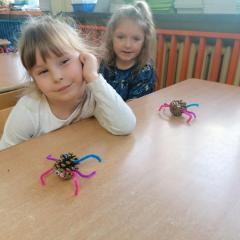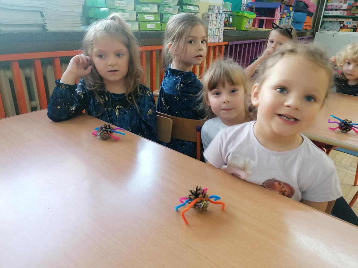 W ramach Projektu edukacyjnego ,,Z darami natury świat nie jest ponury" Żabki wykonały zadanie Szyszkowy zawrót głowy. Dzieci zrobiły szyszkowe pajączki.