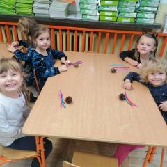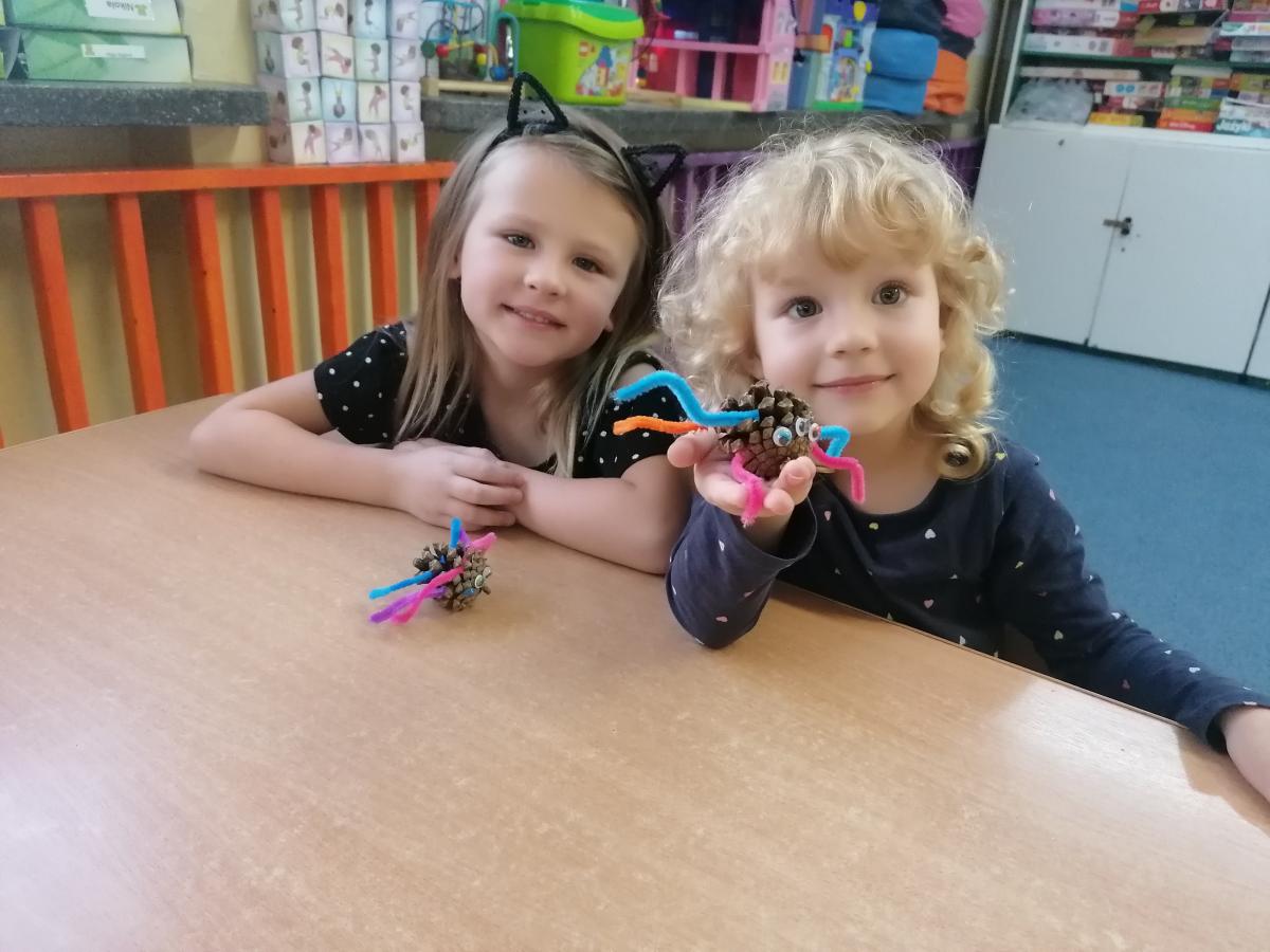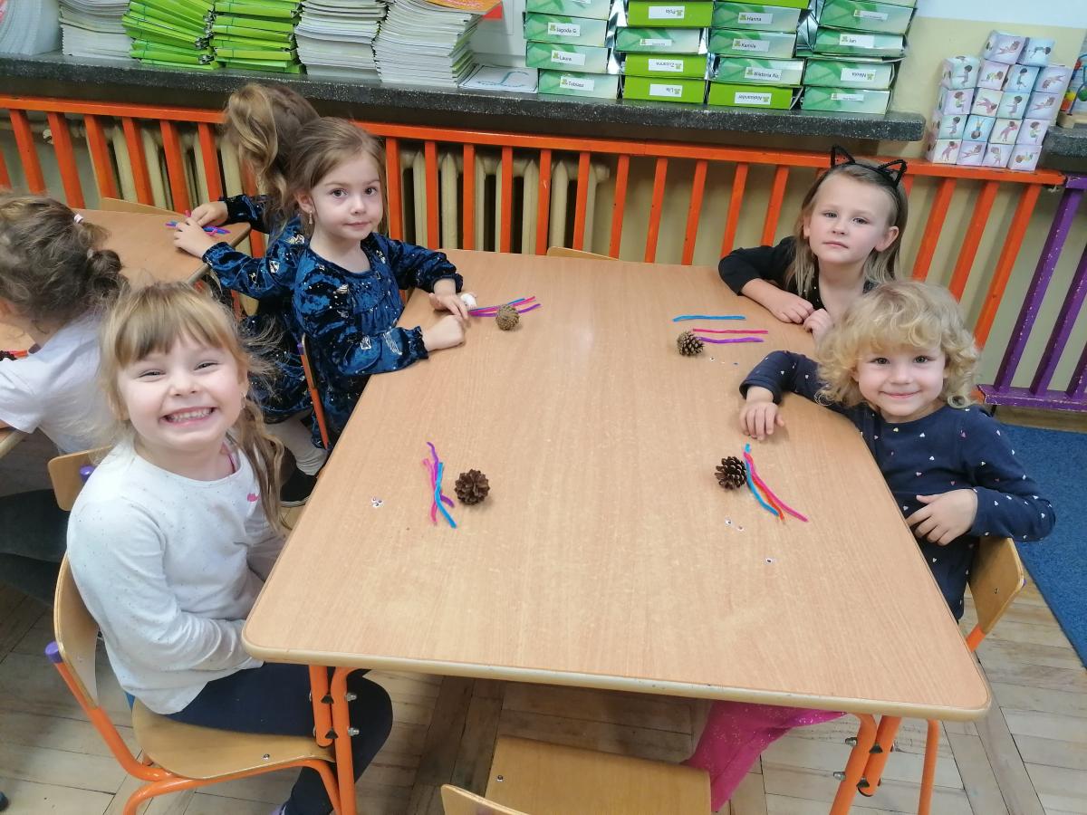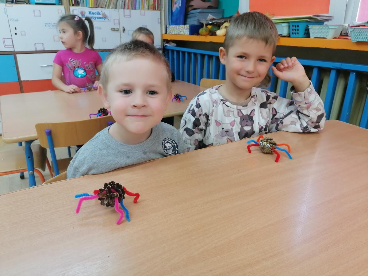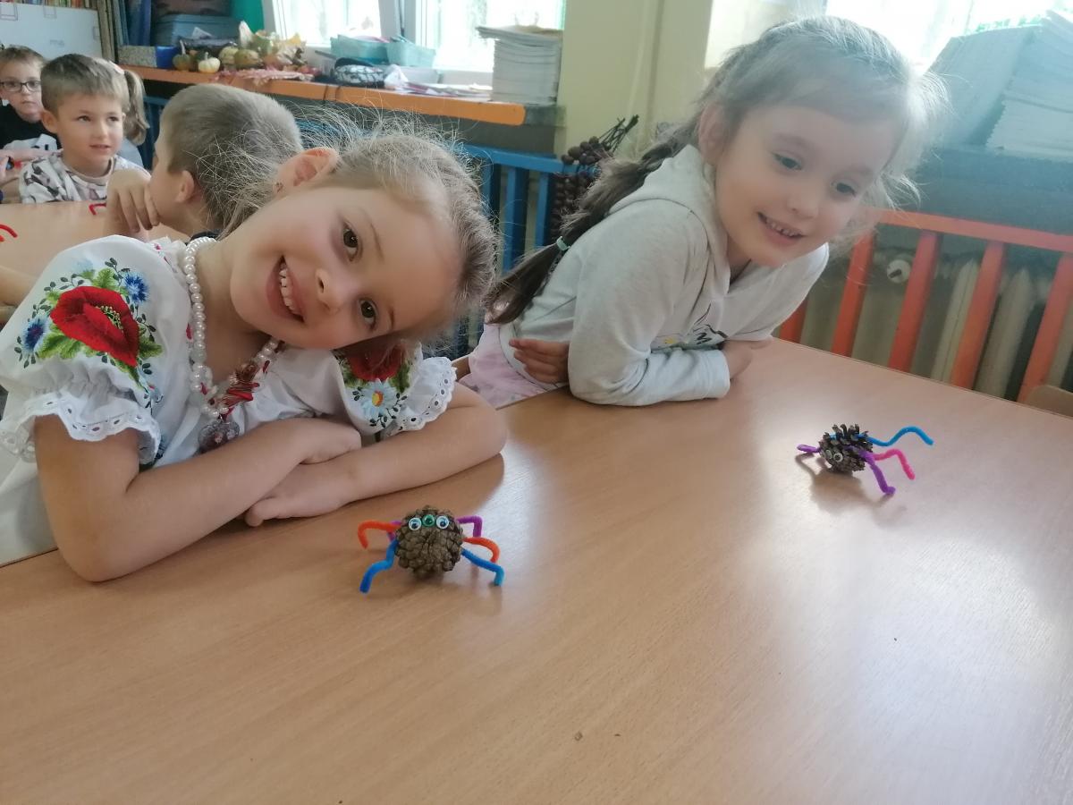 W ramach Projektu edukacyjnego ,,Z darami natury świat nie jest ponury" Żabki wykonały zadanie Szyszkowy zawrót głowy. Dzieci zrobiły szyszkowe pajączki.