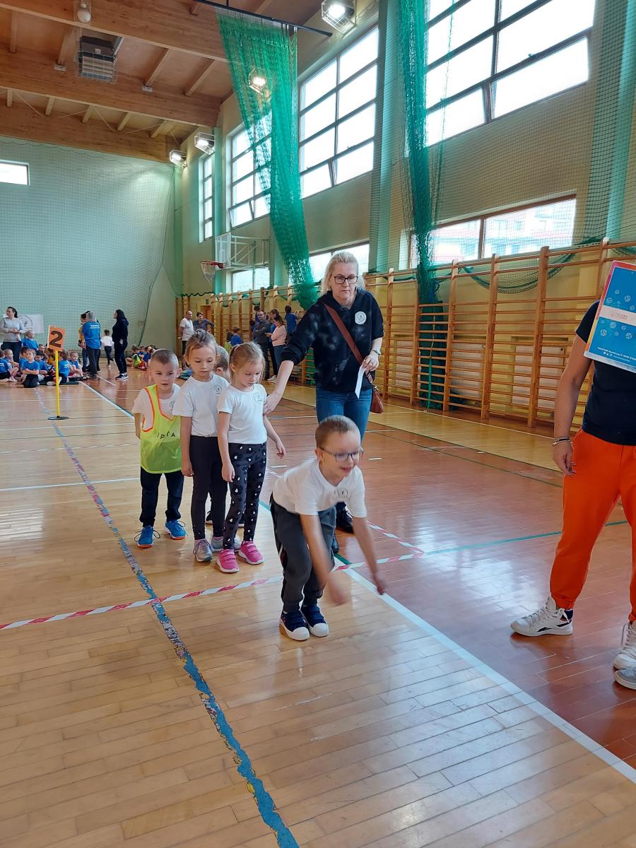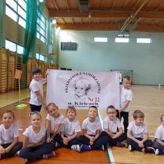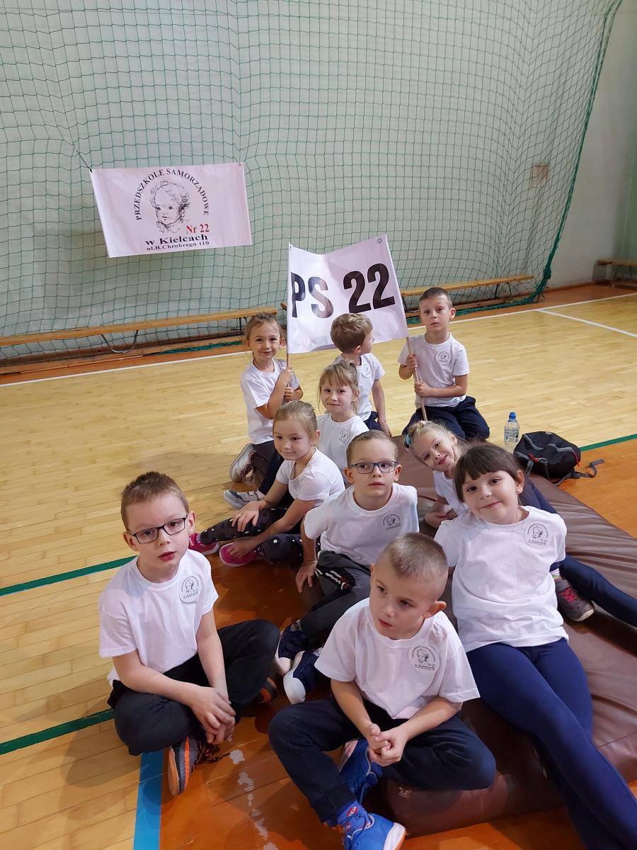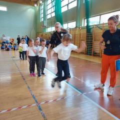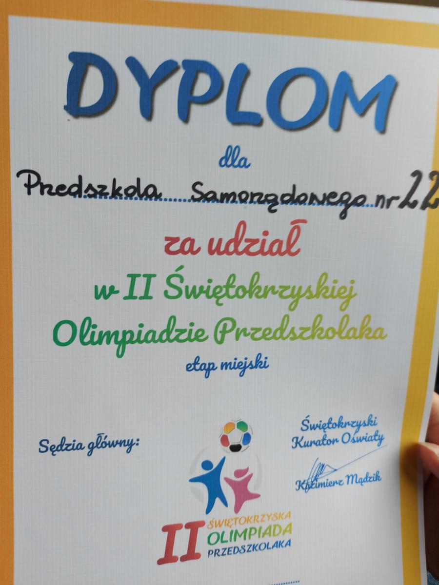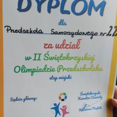 10 dzieci z najstarszych grup reprezentowało naszą placówkę w II Świętokrzyskiej Olimpiadzie Przedszkolaka. Dzieci miały do pokonania cztery konkurencję: bieg z pałeczką sztafetową, tor przeszkód, skok w dal, rzut woreczkiem do koła hula hop. Wszyscy świetnie się bawiliśmy, przedszkolaki otrzymały pamiątkowy dyplom oraz słodki poczęstunek.