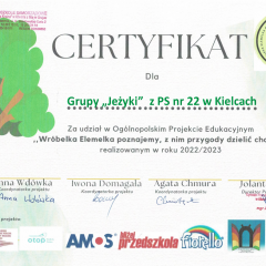 Grupa Jeżyki w roku szkolnym 2022/23 realizowała ogólnopolski projekt edukacyjny "Wróbelka Elemelka poznajemy z nim przygody dzielić chcemy"