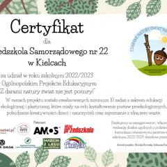 Cel projektu to kształtowanie postaw proekologicznych, pobudzanie kreatywności dzieci i nauczycieli oraz zapoznanie z ideą zero waste. Projekt realizowany w grupach: Żabki, Jeżyki i Biedronki.