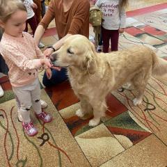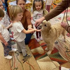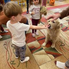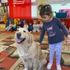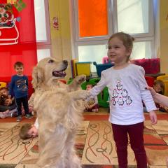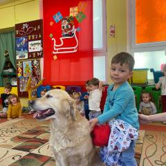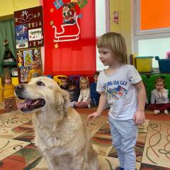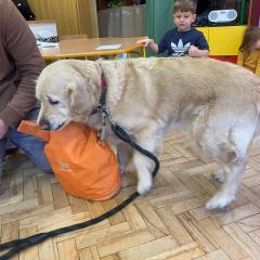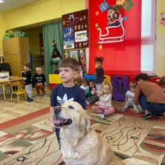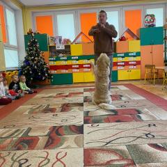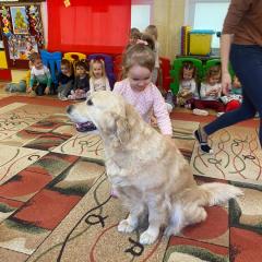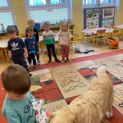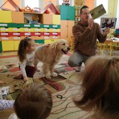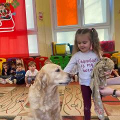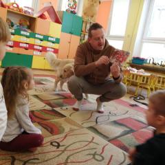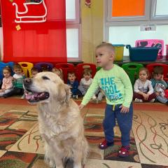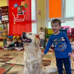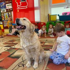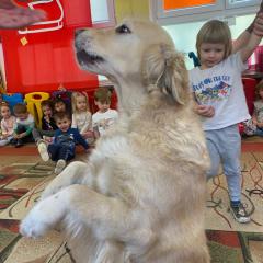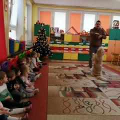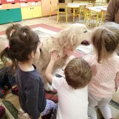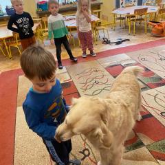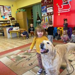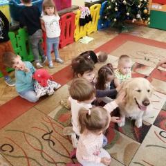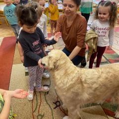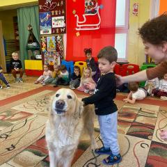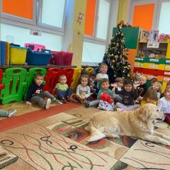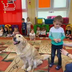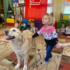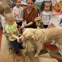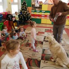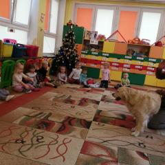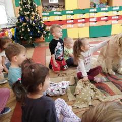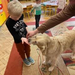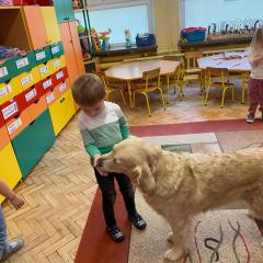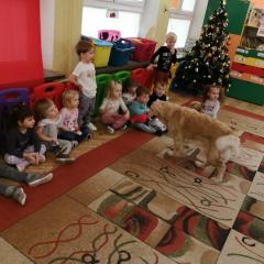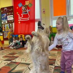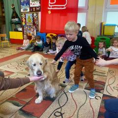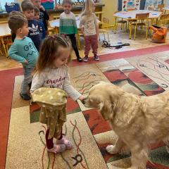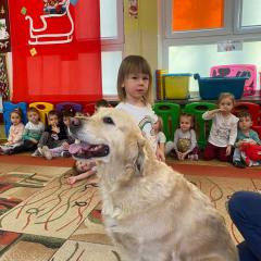 W piątek 9 grudnia, grupę „Misie” odwiedził w przedszkolu pies terapeuta „KARMEN”, rasy Golden Retriever wraz ze swoim opiekunem – p. Bartłomiejem Wołczykiem. Takie spotkanie niesie wiele korzyści. Maluchy uczą się współpracy i nawiązywania relacji a sam kontakt z psem wywołuje u dzieci pozytywne emocje – o czym mogły przekonać się nasze „Misie”. Dziecko u którego pies na początku zajęć wzbudził lekkie zakłopotanie, późniejszy kontakt sprawił, iż jako pierwsze chciało pogłaskać czy nakarmić czworonoga. Obecność psa na zajęciach wywołała u dzieci spontaniczną radość i otwartość – maluchy weszły z prowadzącym w niekończącą się dyskusję - dowiedziały się zarazem; jakie potrzeby ma pies a jakie obowiązki jego właściciel? Co jest wskazane a czego powinniśmy unikać w diecie psa? Dlaczego mówimy, że to „przyjaciel człowieka”? Jakie ważne funkcje w życiu, można powierzyć psu? Dodatkowo - jak należy bezpiecznie zachowywać się w kontakcie ze zwierzątkiem.