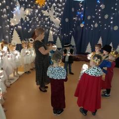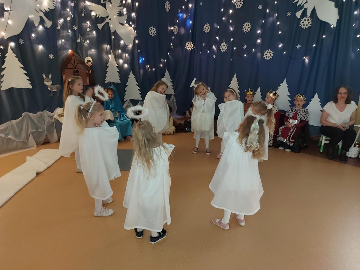 Przedstawienie jasełkowe w wykonaniu grupy Jeżyki. Było wyjątkowym świątecznym spektaklem, który rozpromienił oblicza zarówno dzieci jak i rodziców. Jeżyki w pięknych kostiumach bożonarodzeniowych, z ogromnym zaangażowaniem opowiedziały historię narodzin Jezusa. Jednym z rekwizytów były lampiony przygotowane wspólnie z dziećmi.