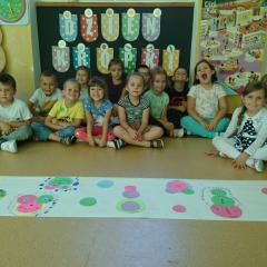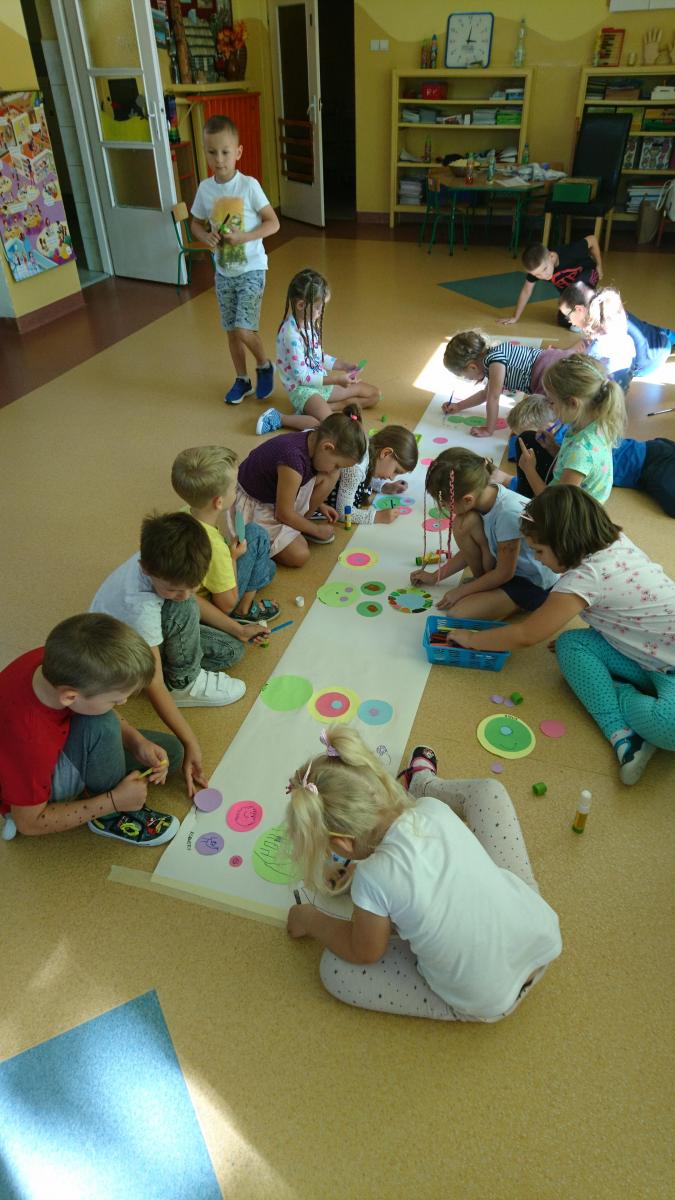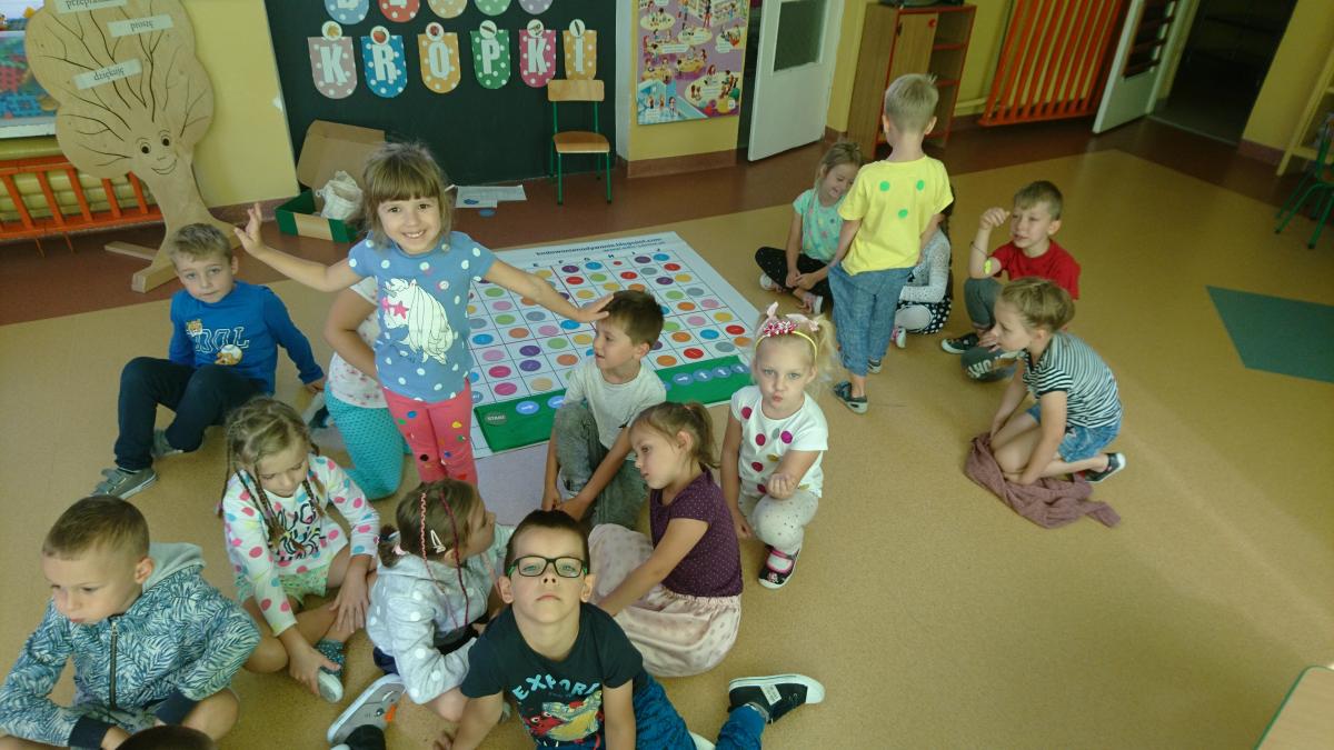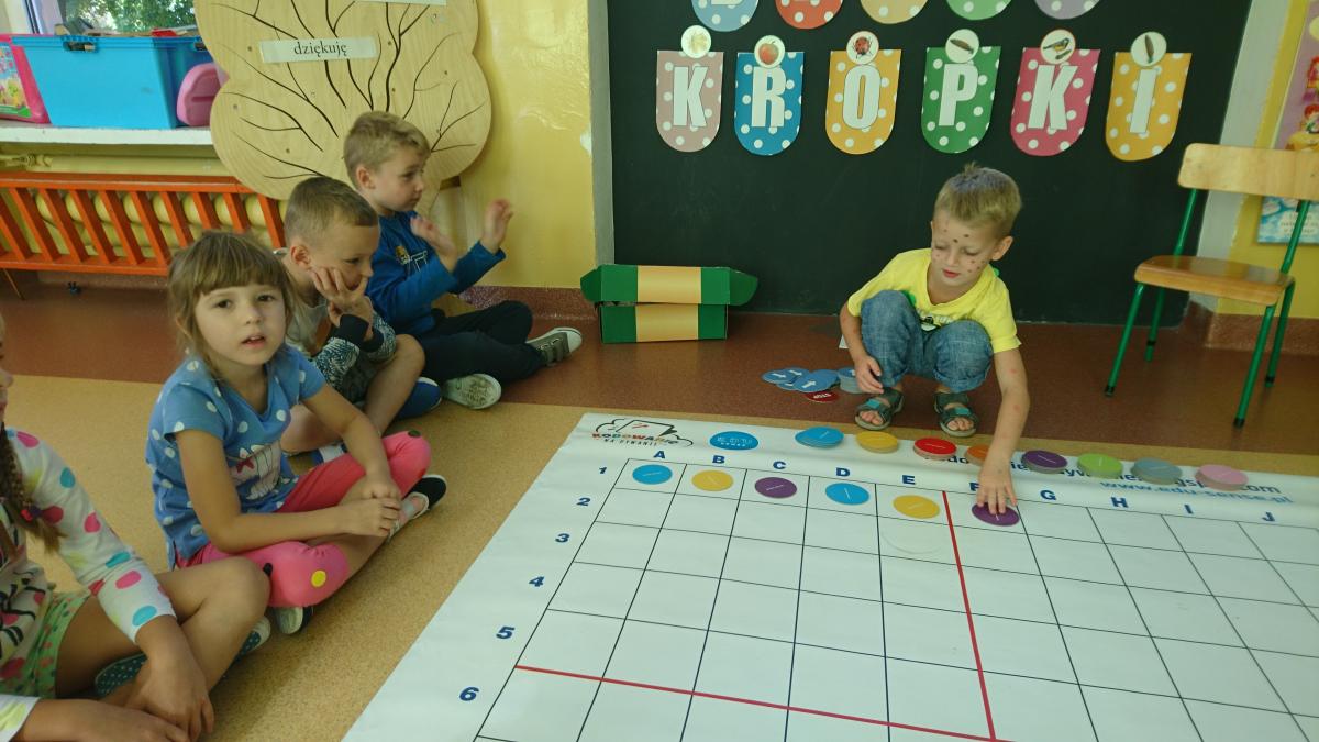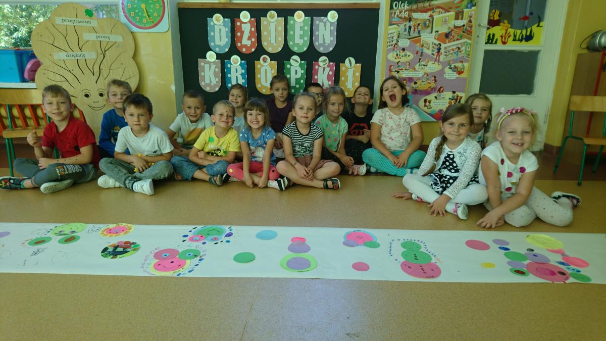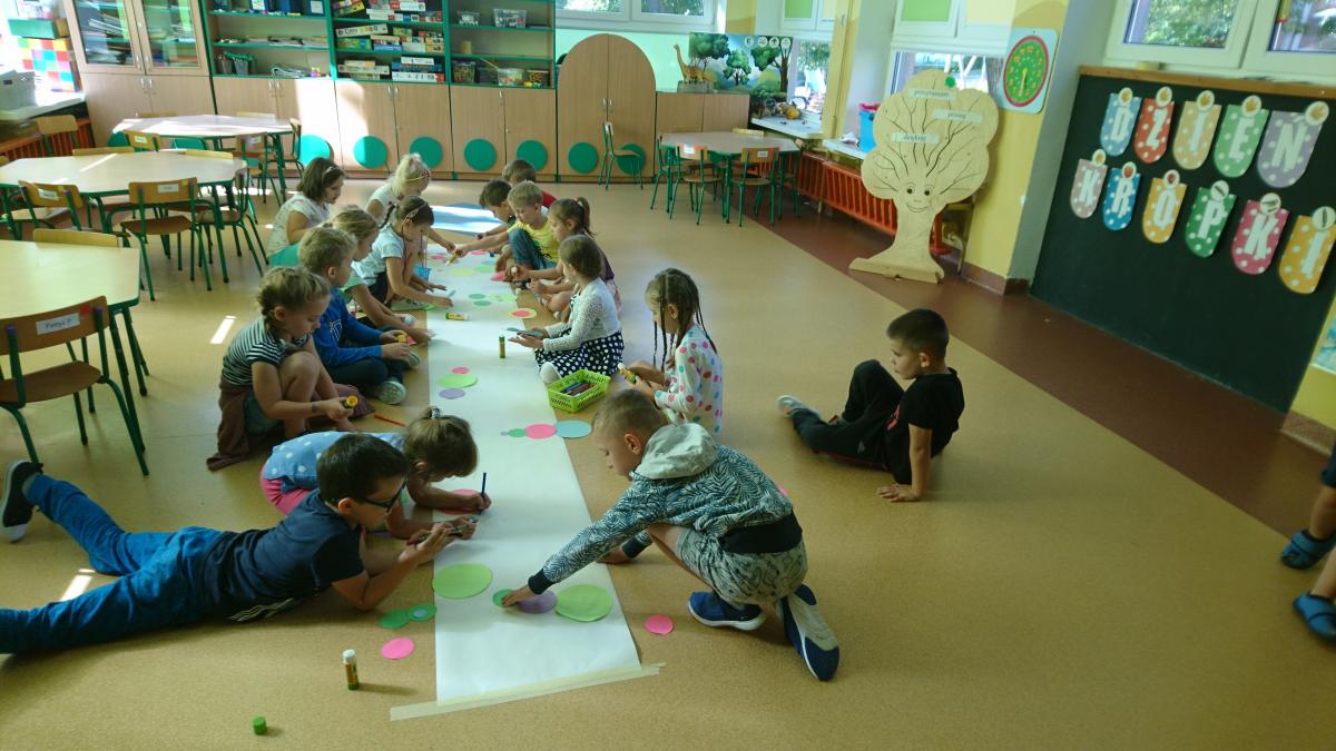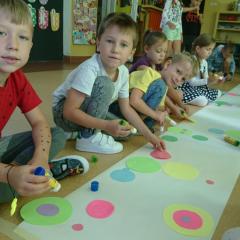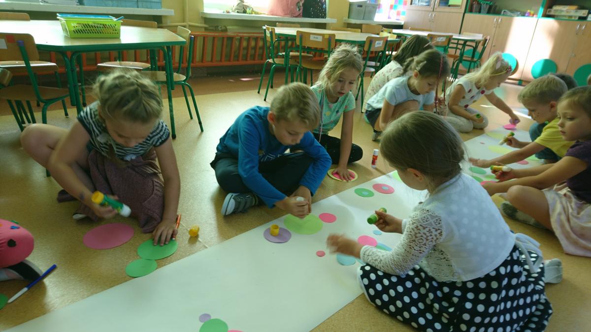 15 września obchodzimy Międzynarodowy Dzień Kropki. Z tej okazji dzieci z grupy Pszczółek poznały historię Vashti, małej dziewczynki która nie wierzyła w swoje możliwości. Układały rytmy na macie do kodowania, następnie kod do kropki przy użyciu strzałek kierunkowych. Dzieci stworzyły wspólną pracę plastyczną, w której punktem wyjściowym była kropka, inspirująca i skłaniająca do refleksji.