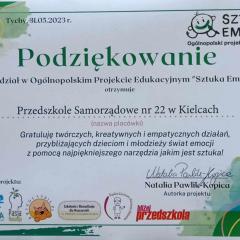 Ogólnopolski projekt edukacyjny „Sztuka emocji”, to projekt realizowany w grupie Smerfy w roku szkolnym 2022/2023. Miał on na celu skierować uwagę i działania nauczycieli oraz dzieci w obszar emocji, wykorzystując do tego sztukę pod jej wszelakimi postaciami. Realizacja projektu to przeprowadzenie co miesiąc minimum jednych zajęć/aktywności/ćwiczeń z użyciem wybranej dziedziny sztuki, odnoszącej się do przypisanej w danym miesiącu emocji.