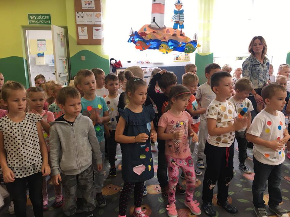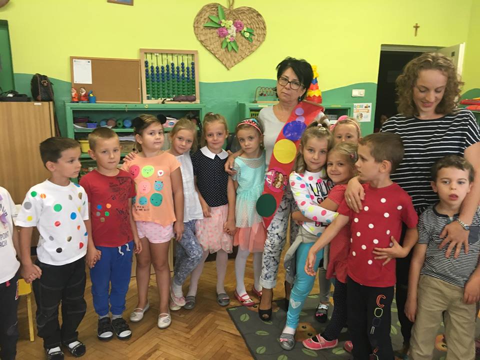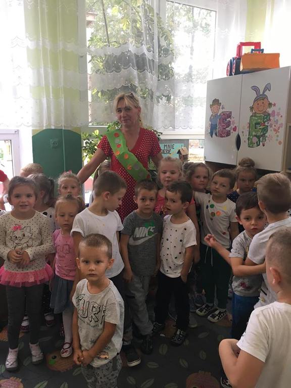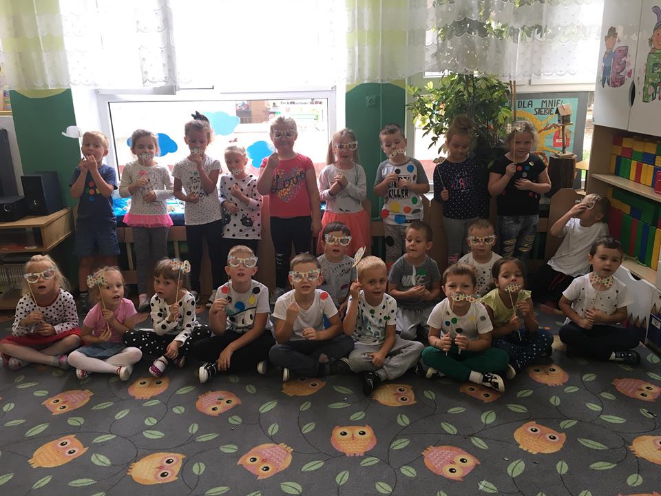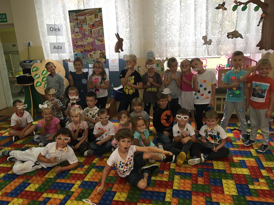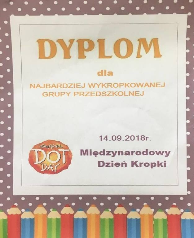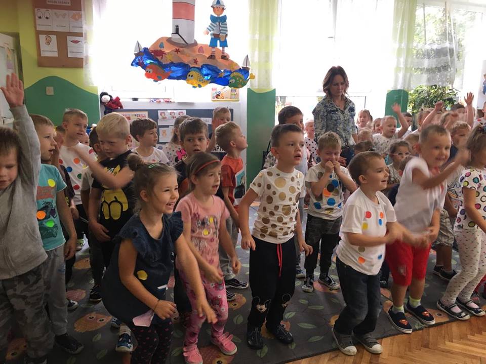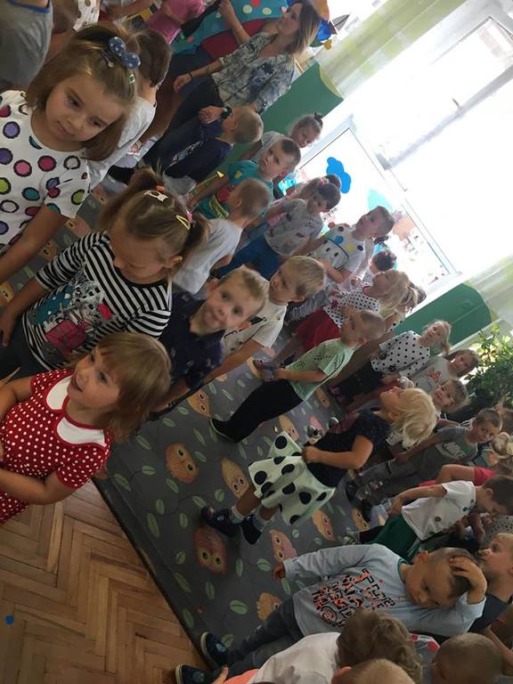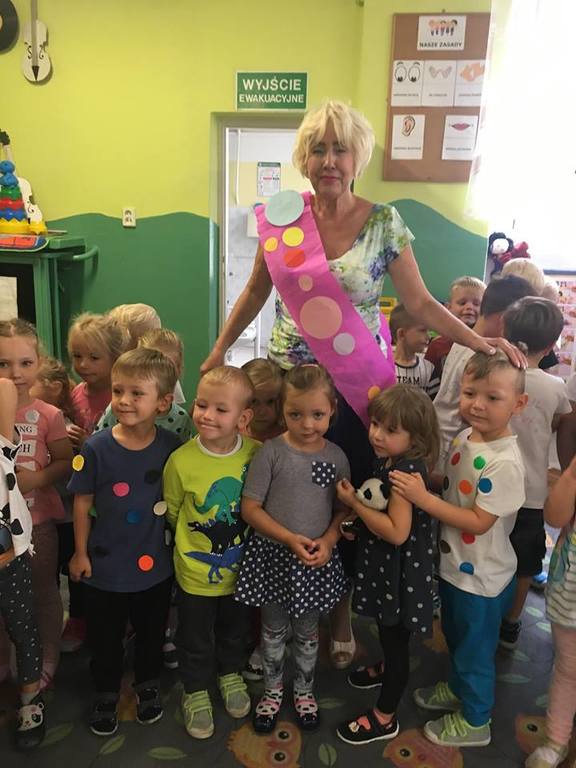 Tak świętowaliśmy wspólnie Dzien Kropki! Żabki w swoje sali gościły dziś całe przedszkole ? Uroczystość rozpoczęliśmy powitaniem wszystkich dzieci śpiewając piosenkę w języku angielskim. Następnie rozwiązywaliśmy zagadkę, która wprowadzała w tematykę dzisiejszego dnia. Przybliżyliśmy dzieciom ideę Dnia Kropki oraz opowiedziałyśmy historie o małej Vashti. Następnie wszyscy chwalili się swoimi talentami. Pani Sara zaśpiewała piosenkę „Biedroneczki są w kropeczki”, do której dzieci wspaniale zatańczyły. Kolejnym zadaniem było udekorowanie swojej Pani, wyklejając kolorowymi kropeczkami szal z bibuły. Wszyscy bardzo się starali, by ich Pani wyglądała najpiękniej w całym przedszkolu ? Kolejno przyszedł czas na odgadywanie jakie super moce i talenty mają ulubieni bajkowi bohaterowie naszych milusińskich. Po wykonanym zadaniu wręczone zostały dyplomy dla najbardziej „wykropkowanej” grupy w całym przedszkolu. Na zakończenie odtańczyliśmy wspólnie Hamster Dance. Dzieci pozowały do zdjęć z kropeczkowymi gadżetami oraz wykonały prace plastyczna - mandale. Dziękujemy ślicznie za tak staranne przygotowanie dzieci do dzisiejszej uroczystości! Brawo dla Państwa! ??