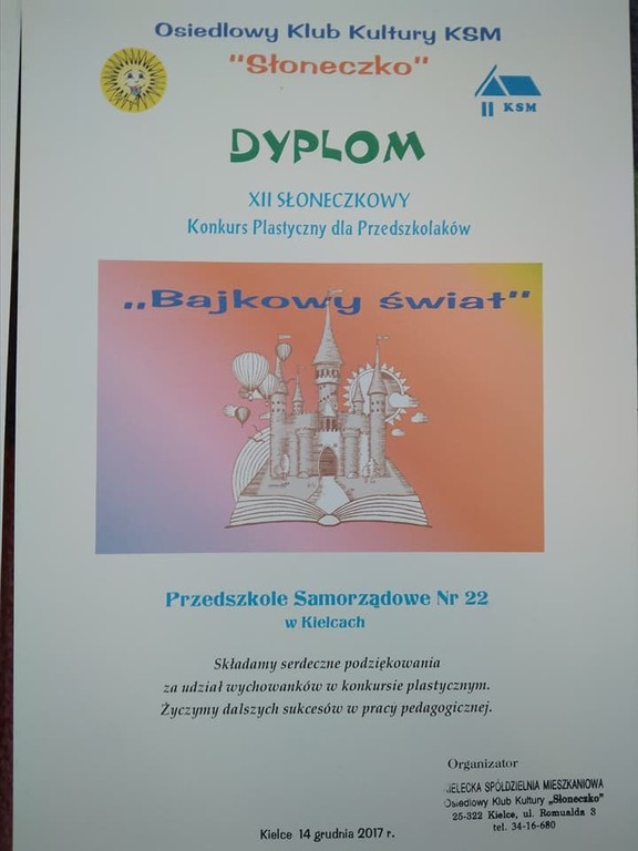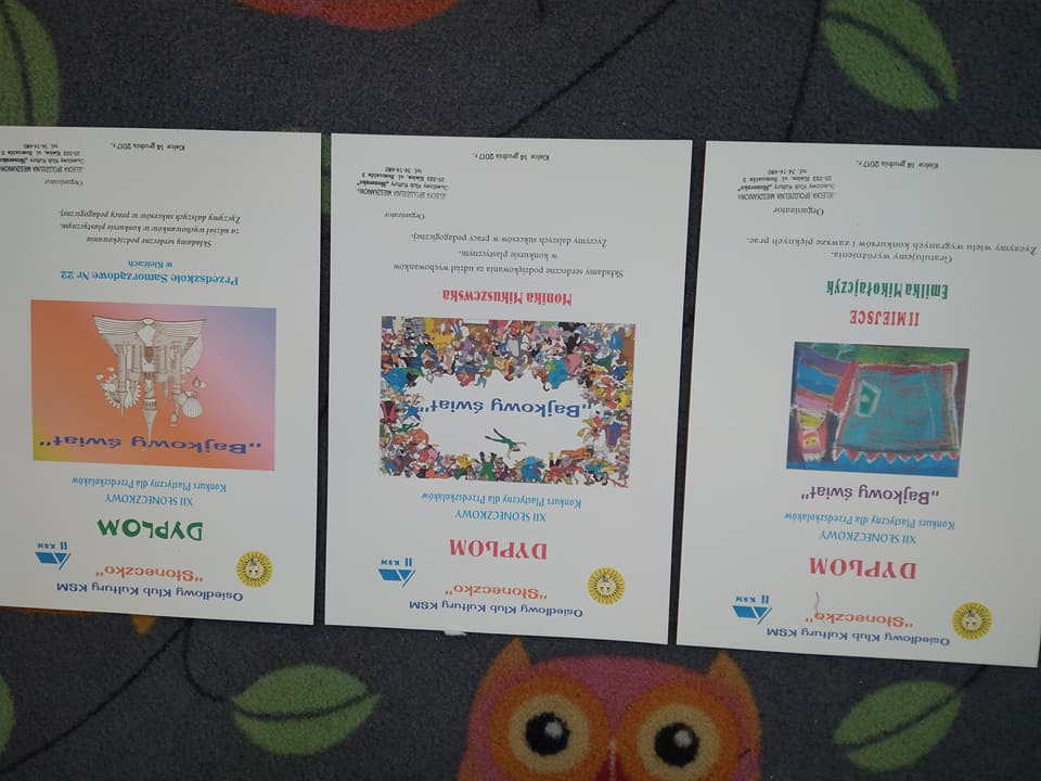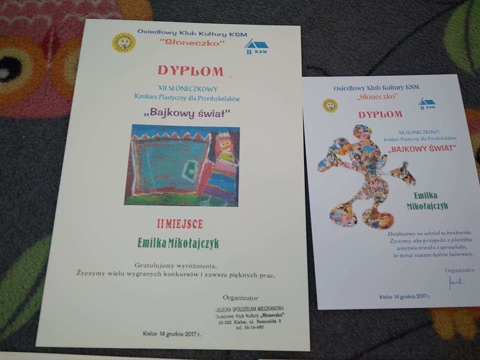 Dzieci z grupy Tropicieli brały udział w konkursie plastycznym "Bajkowy świat" zorganizowanym przez Osiedlowy Dom Kultury KSM. II miejsce zdobyła Emilka Mikołajczyk, a pozostałe dzieci otrzymały pamiątkowe dyplomy. Brawo Tropiciele!