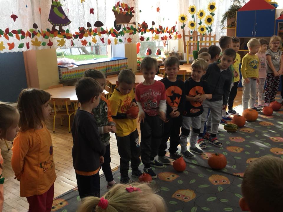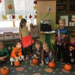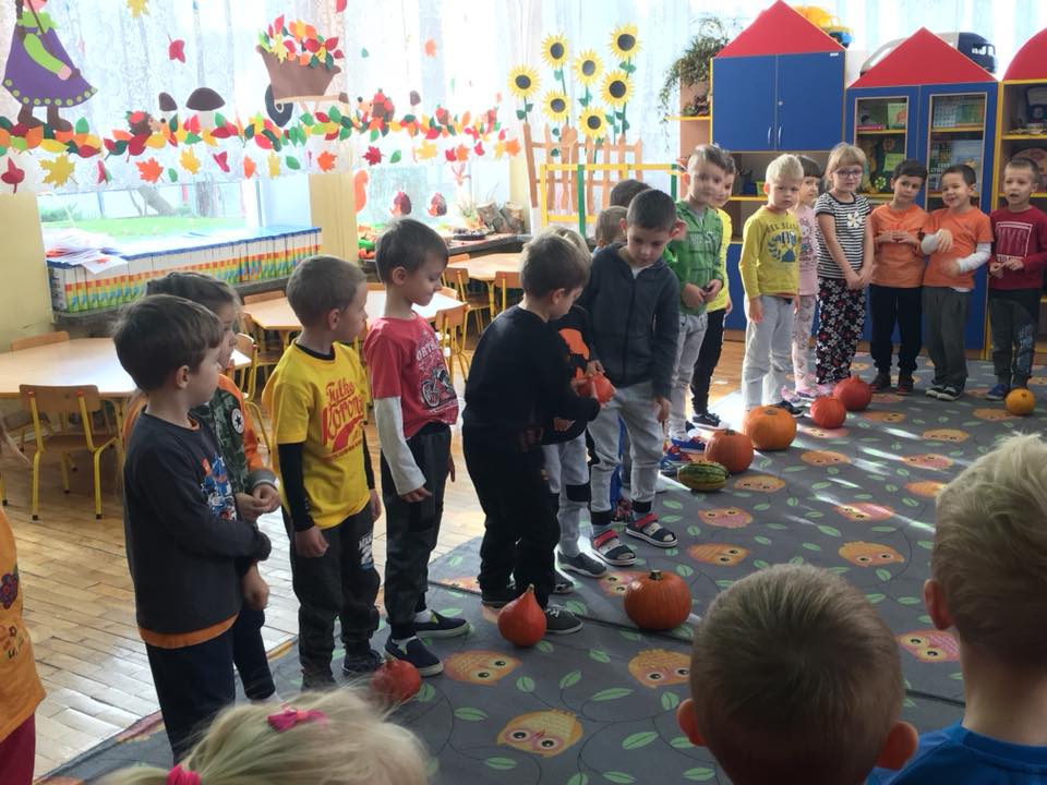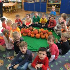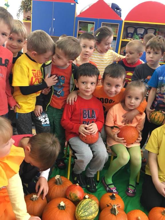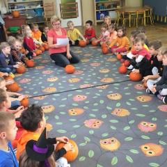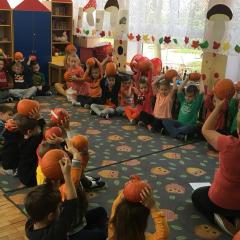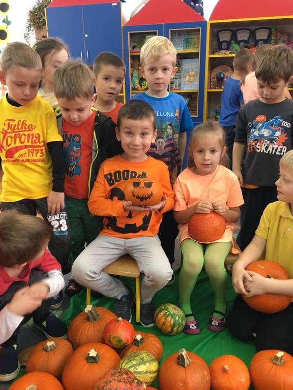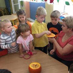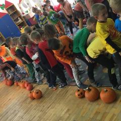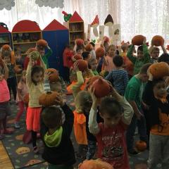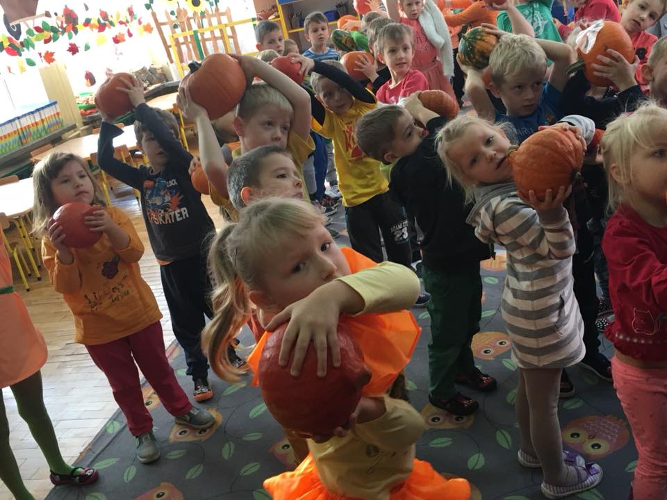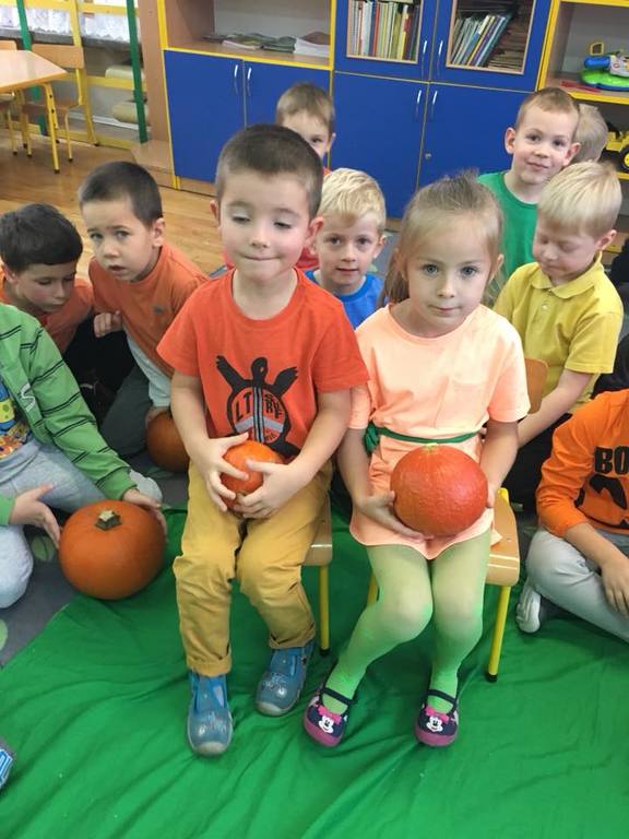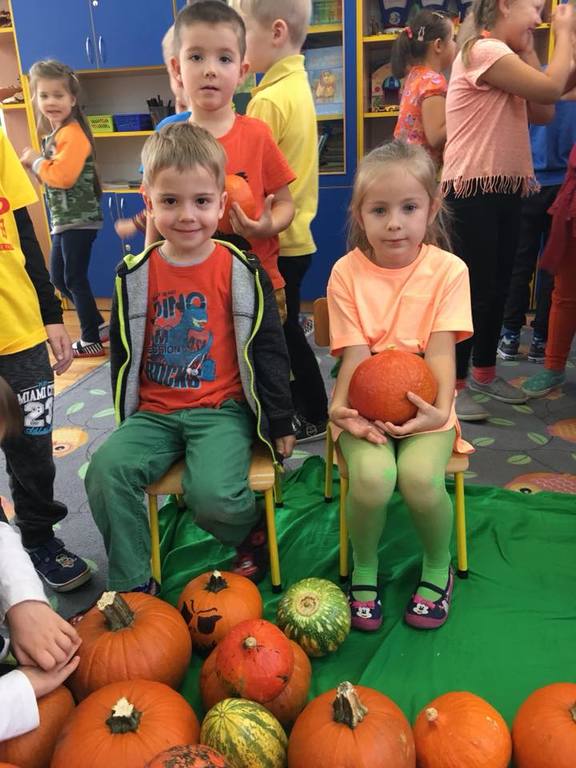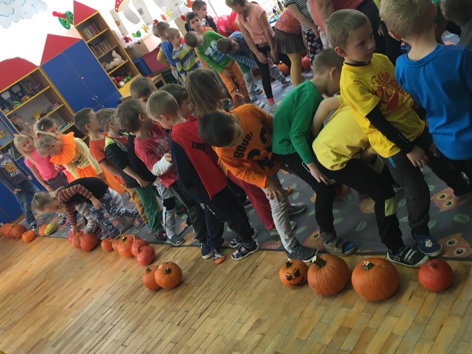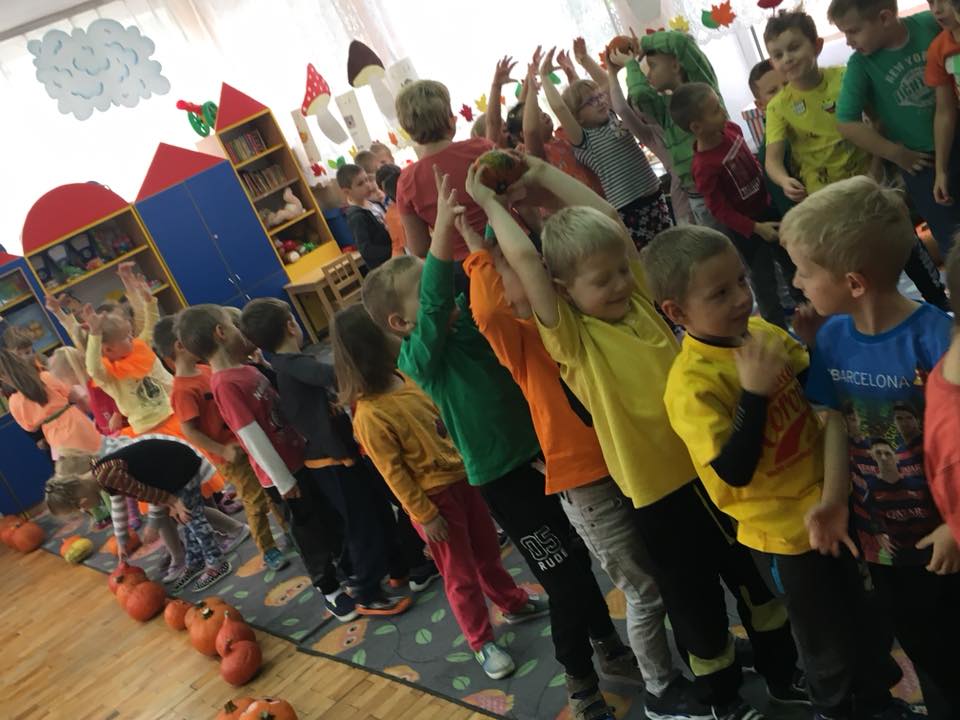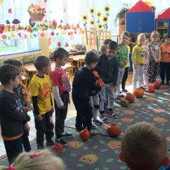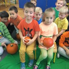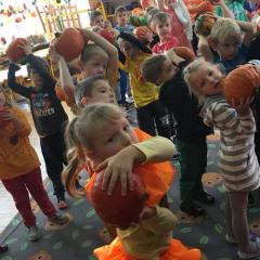 W poniedziałek w przedszkolu obchodziliśmy „Święto Dyni”. Dzieci przyniosły dynie, z którą bawiły się podczas naszego świętowania Uczyły się wierszyka o bohaterce dnia, tańczyły z dynią i wokół dyni.Przedszkolaki wymieniały jakie potrawy można z niej przyrządzić, uczestniczyły w konkurencjach sportowych: toczenie dyni do celu, podawanie dyni koledze lub koleżance stojąc w rozkroku między swoimi nogami oraz nad głowami. Wybrani oczywiście zostali król i królowa dyniowego święta.Na zakończenie sprawdzaliśmy co dynia kryje w środku.