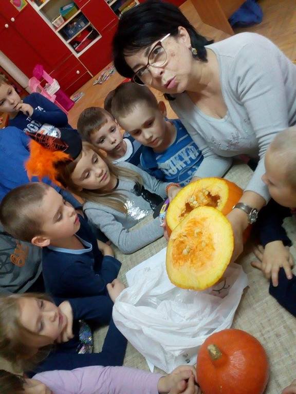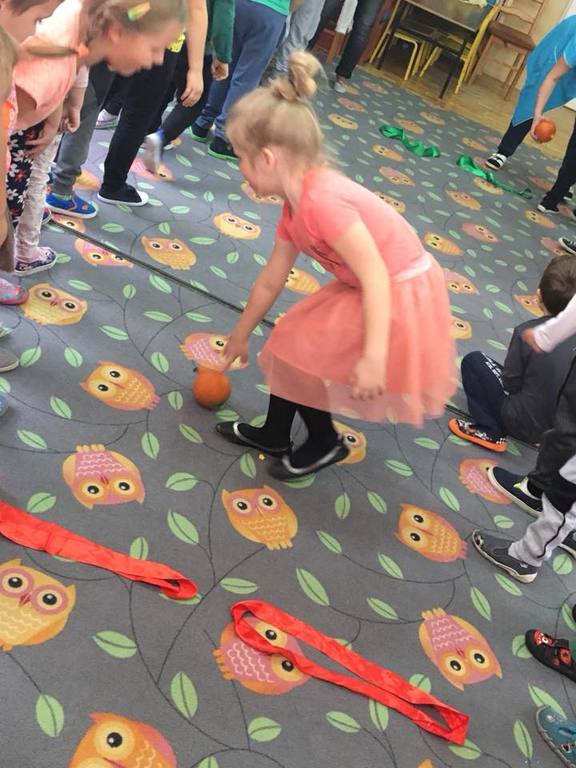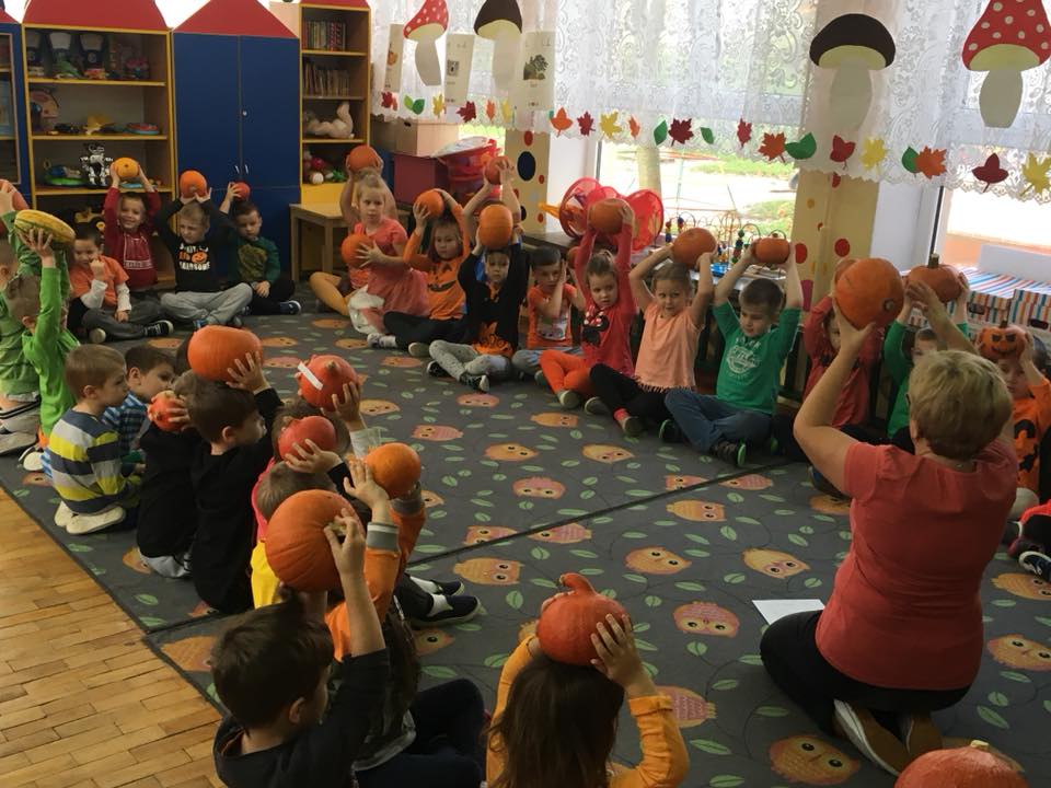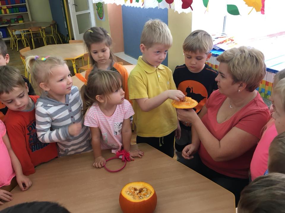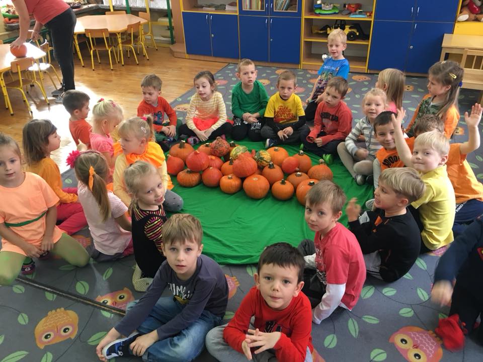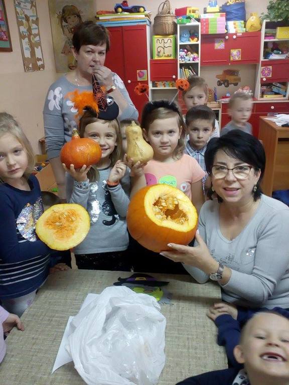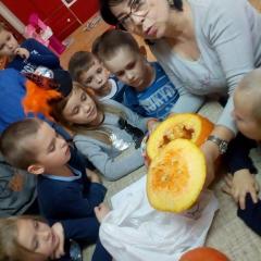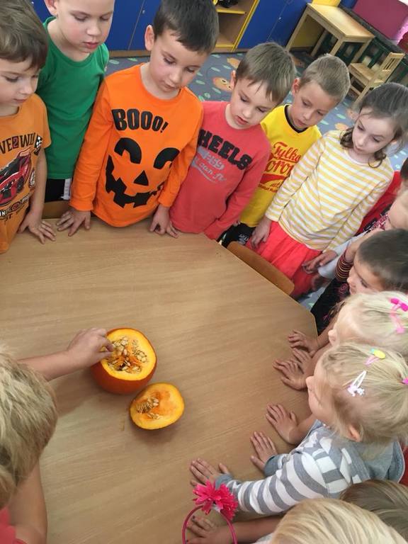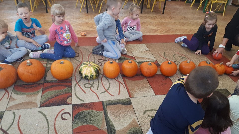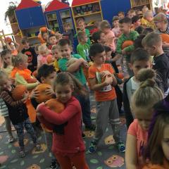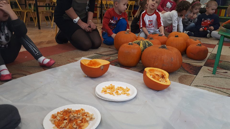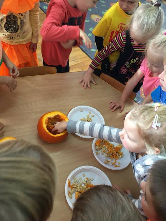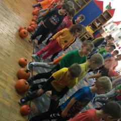 W poniedziałek w przedszkolu obchodziliśmy „Święto Dyni”. Dzieci przyniosły dynie, z którą bawiły się podczas naszego świętowania Uczyły się wierszyka o bohaterce dnia, tańczyły z dynią i wokół dyni.Przedszkolaki wymieniały jakie potrawy można z niej przyrządzić, uczestniczyły w konkurencjach sportowych: toczenie dyni do celu, podawanie dyni koledze lub koleżance stojąc w rozkroku między swoimi nogami oraz nad głowami. Wybrani oczywiście zostali król i królowa dyniowego święta.Na zakończenie sprawdzaliśmy co dynia kryje w środku.