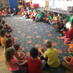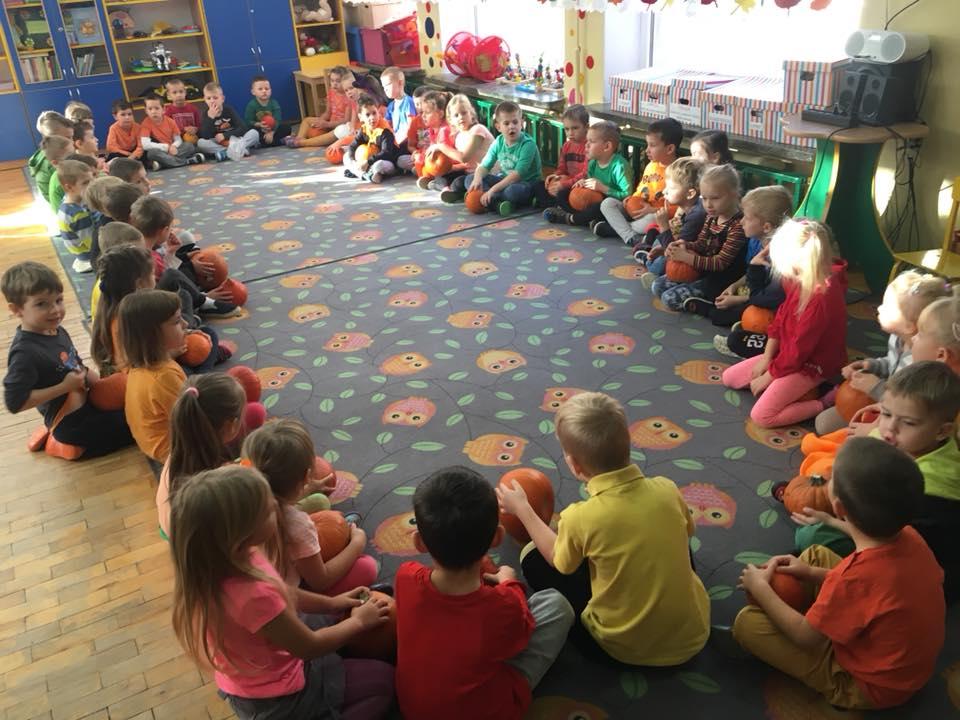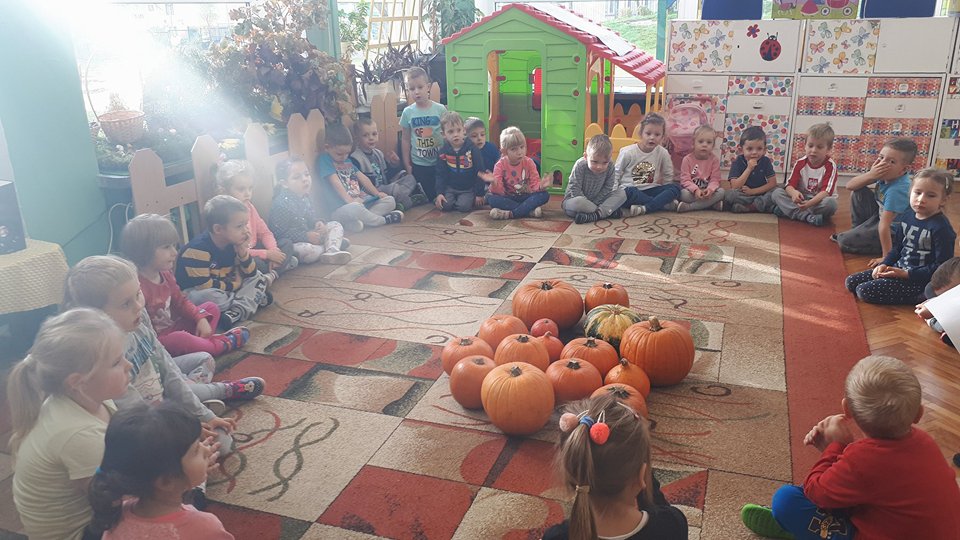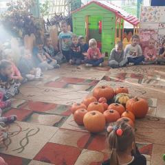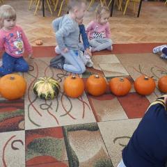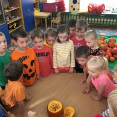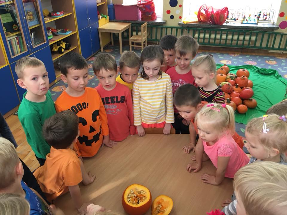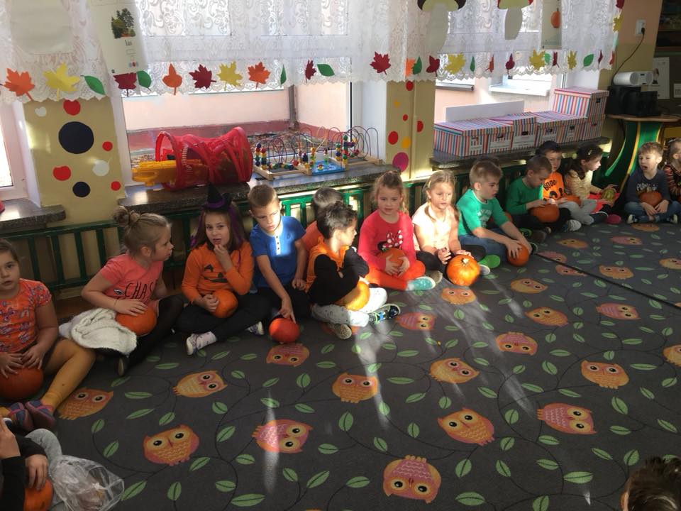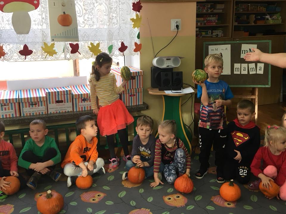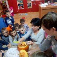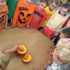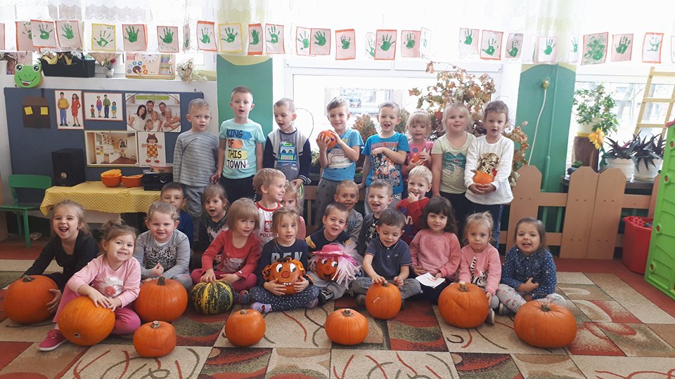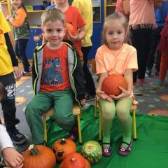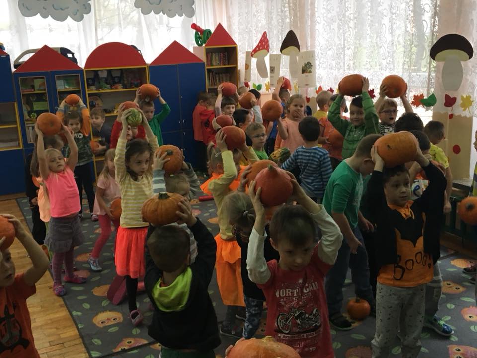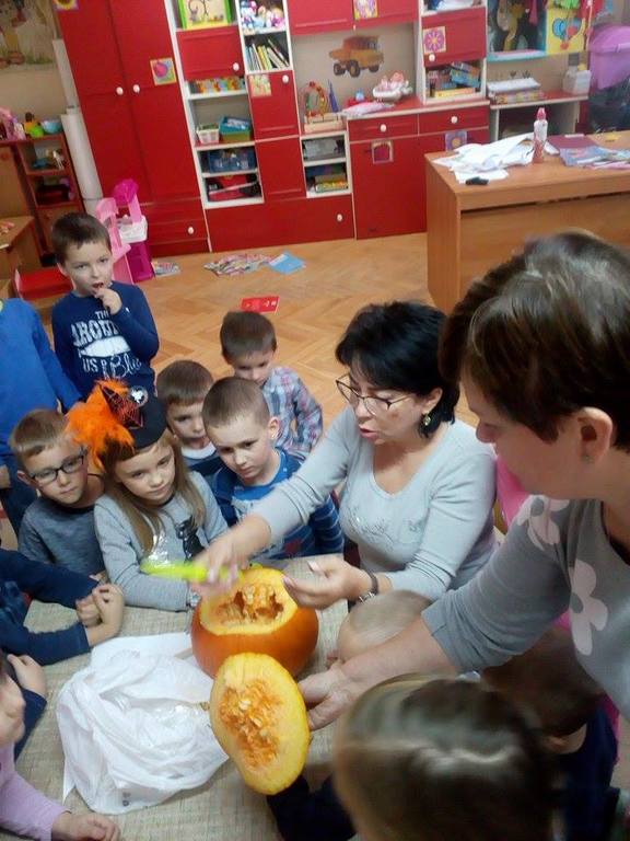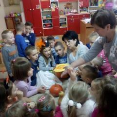 W poniedziałek w przedszkolu obchodziliśmy „Święto Dyni”. Dzieci przyniosły dynie, z którą bawiły się podczas naszego świętowania Uczyły się wierszyka o bohaterce dnia, tańczyły z dynią i wokół dyni.Przedszkolaki wymieniały jakie potrawy można z niej przyrządzić, uczestniczyły w konkurencjach sportowych: toczenie dyni do celu, podawanie dyni koledze lub koleżance stojąc w rozkroku między swoimi nogami oraz nad głowami. Wybrani oczywiście zostali król i królowa dyniowego święta.Na zakończenie sprawdzaliśmy co dynia kryje w środku.