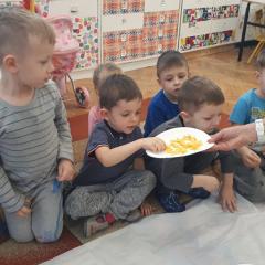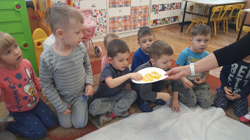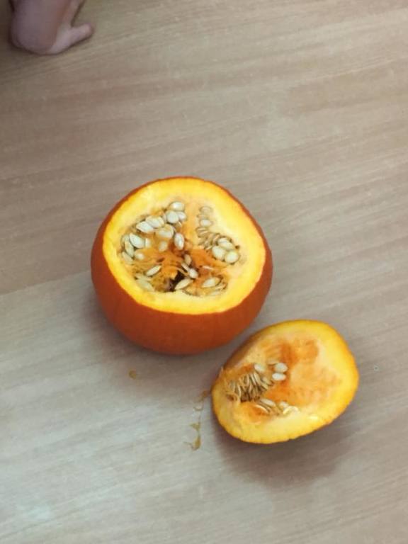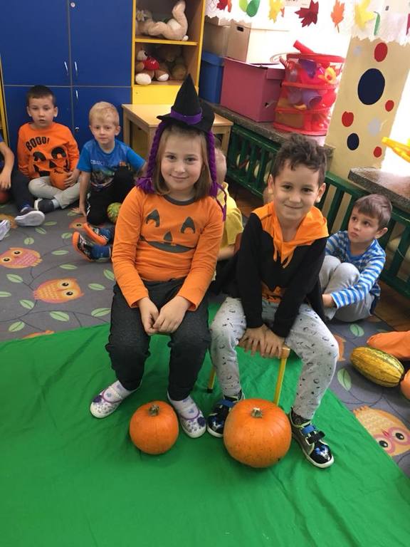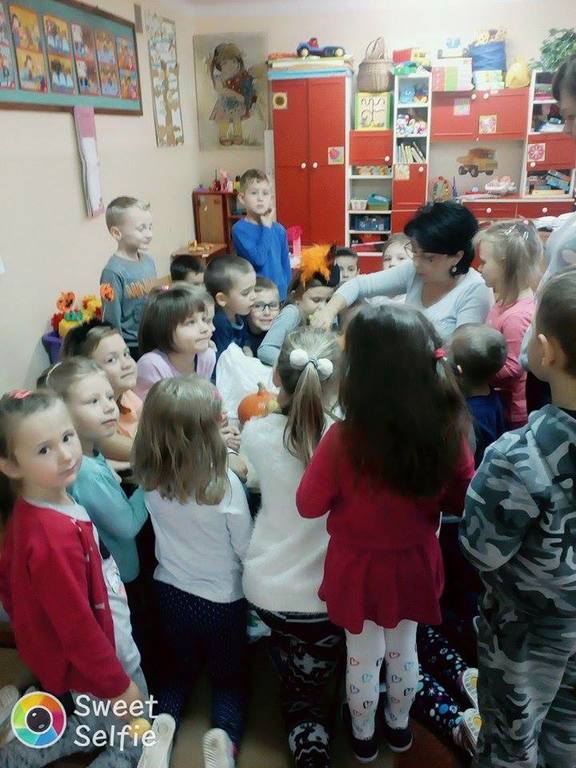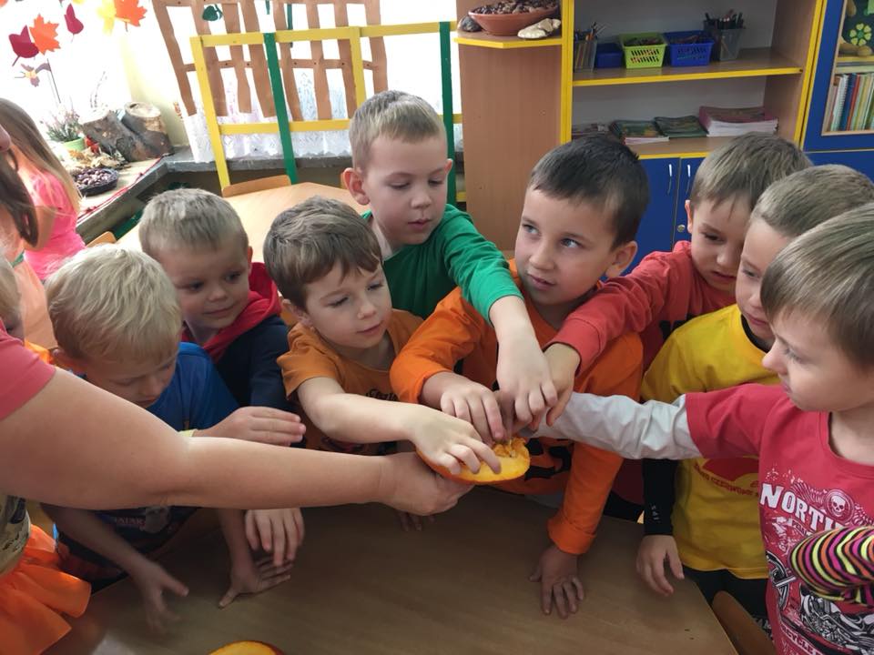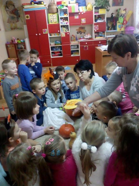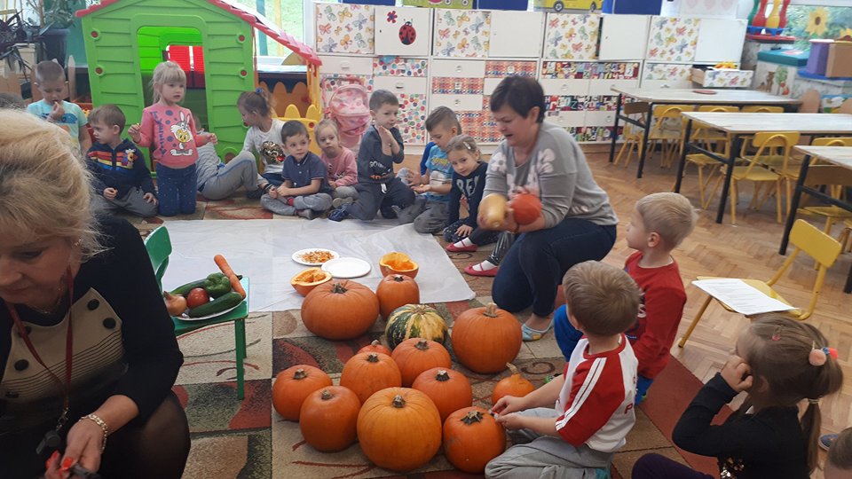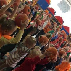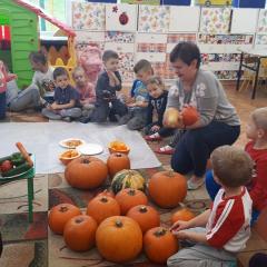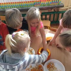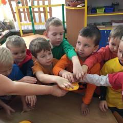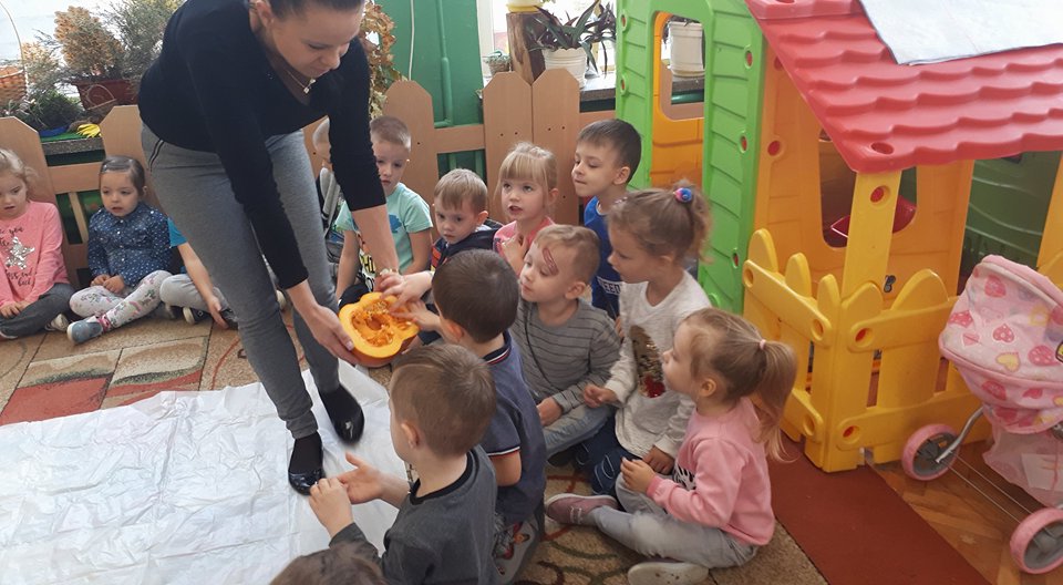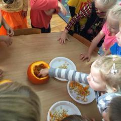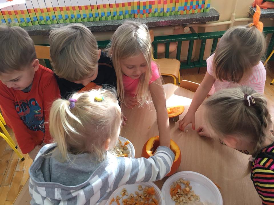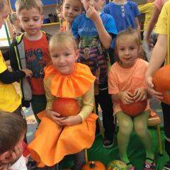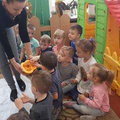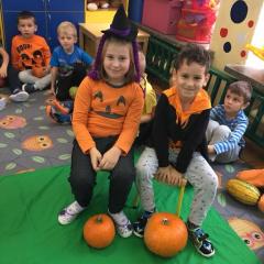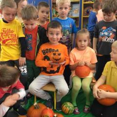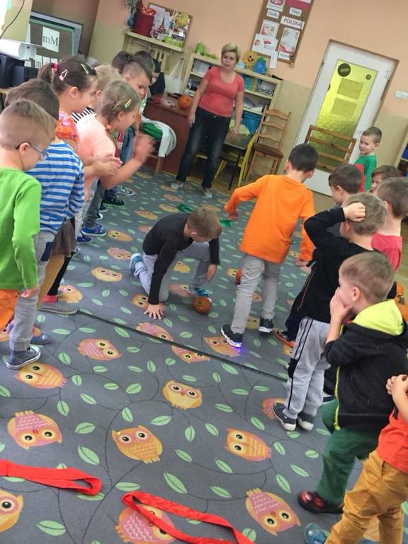 W poniedziałek w przedszkolu obchodziliśmy „Święto Dyni”. Dzieci przyniosły dynie, z którą bawiły się podczas naszego świętowania Uczyły się wierszyka o bohaterce dnia, tańczyły z dynią i wokół dyni.Przedszkolaki wymieniały jakie potrawy można z niej przyrządzić, uczestniczyły w konkurencjach sportowych: toczenie dyni do celu, podawanie dyni koledze lub koleżance stojąc w rozkroku między swoimi nogami oraz nad głowami. Wybrani oczywiście zostali król i królowa dyniowego święta.Na zakończenie sprawdzaliśmy co dynia kryje w środku.