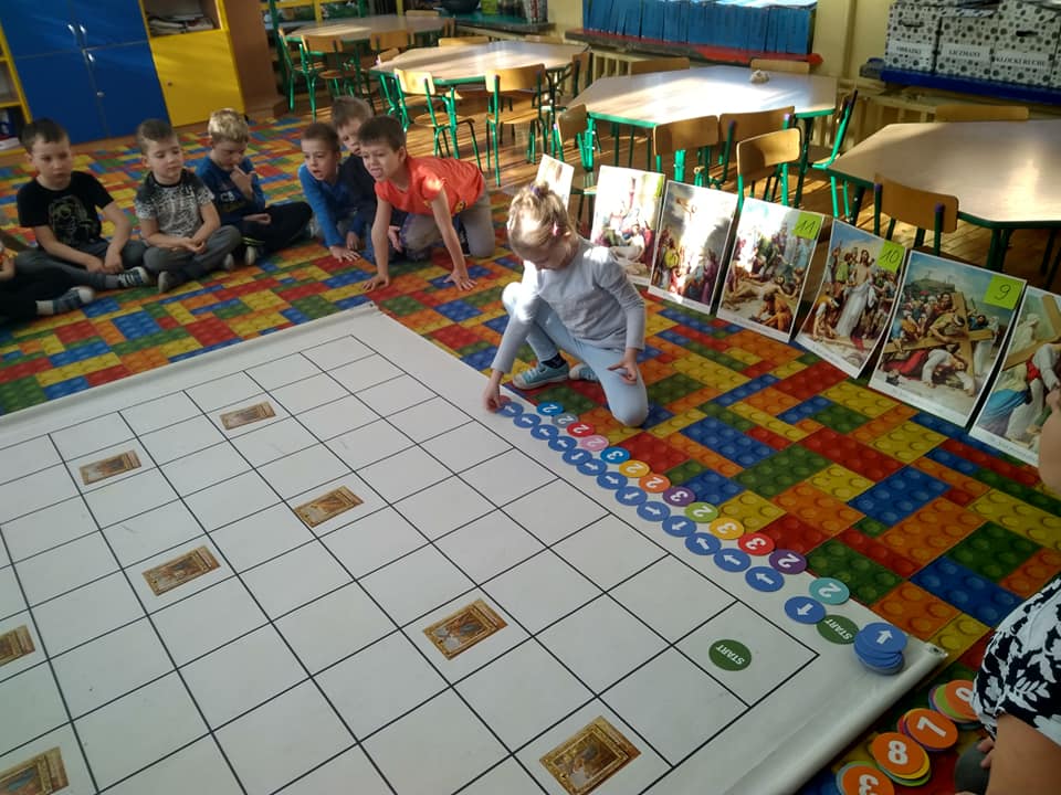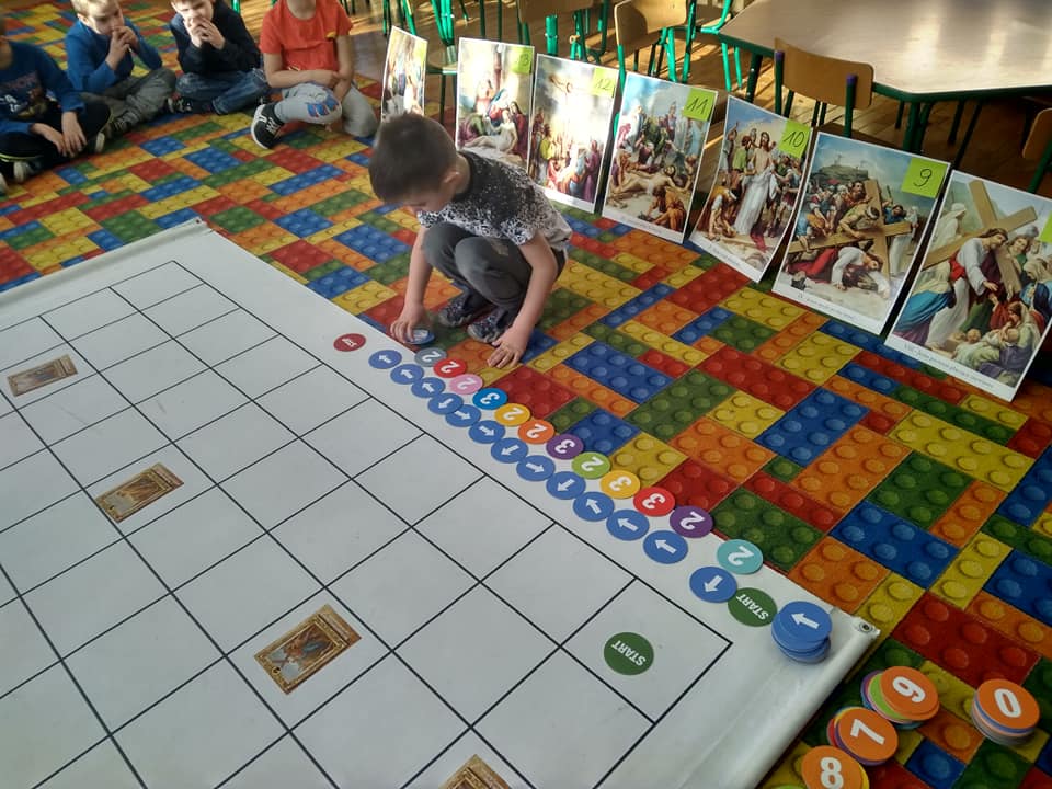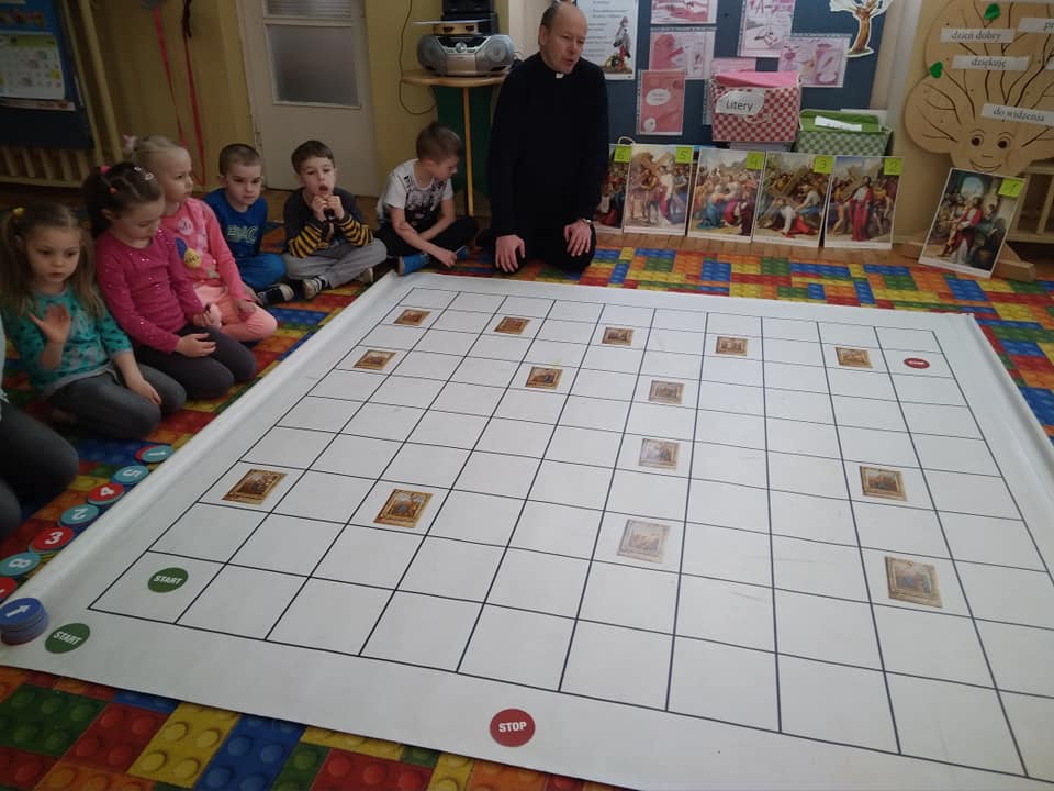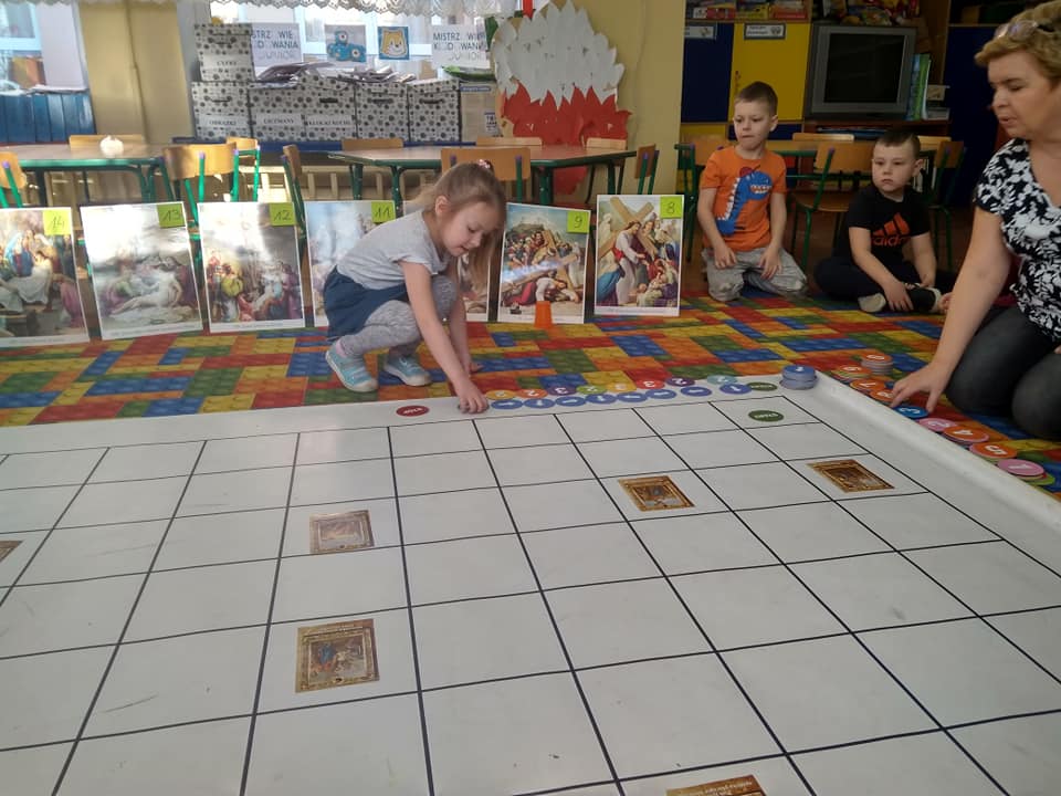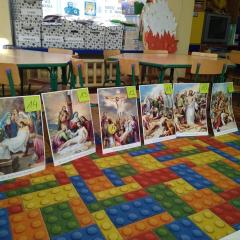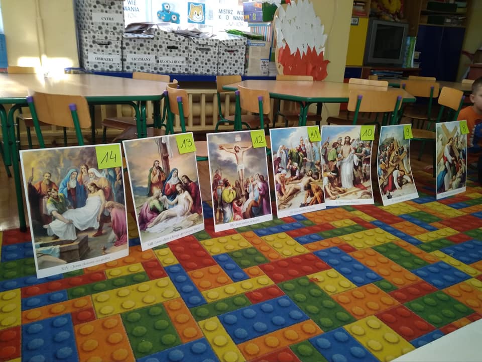 Oczywiście, że można dzisiejsze zajęcia w grupie Tropicieli to udowodniły. Przygotowane przez księdza obrazki przedstawiające poszczególne stacje drogi krzyżowej były ponumerowane, duże ilustracje ustawione wokół tak, by były dobrze widoczne dla wszystkich. Małe odpowiedniki znalazły się na macie. Dzieci miały ułożyć skrypt drogi od startu do mety, przechodząc kolejne stacje. O każdej ksiądz króciutko opowiadał.Tropiciele pięknie pracowały i z zaciekawieniem słuchały.