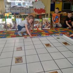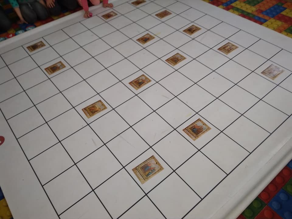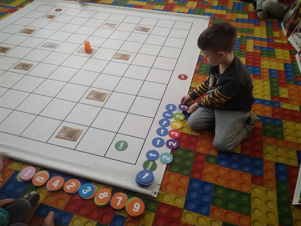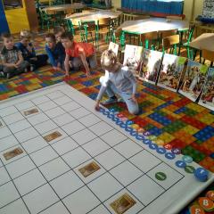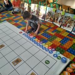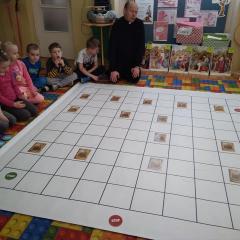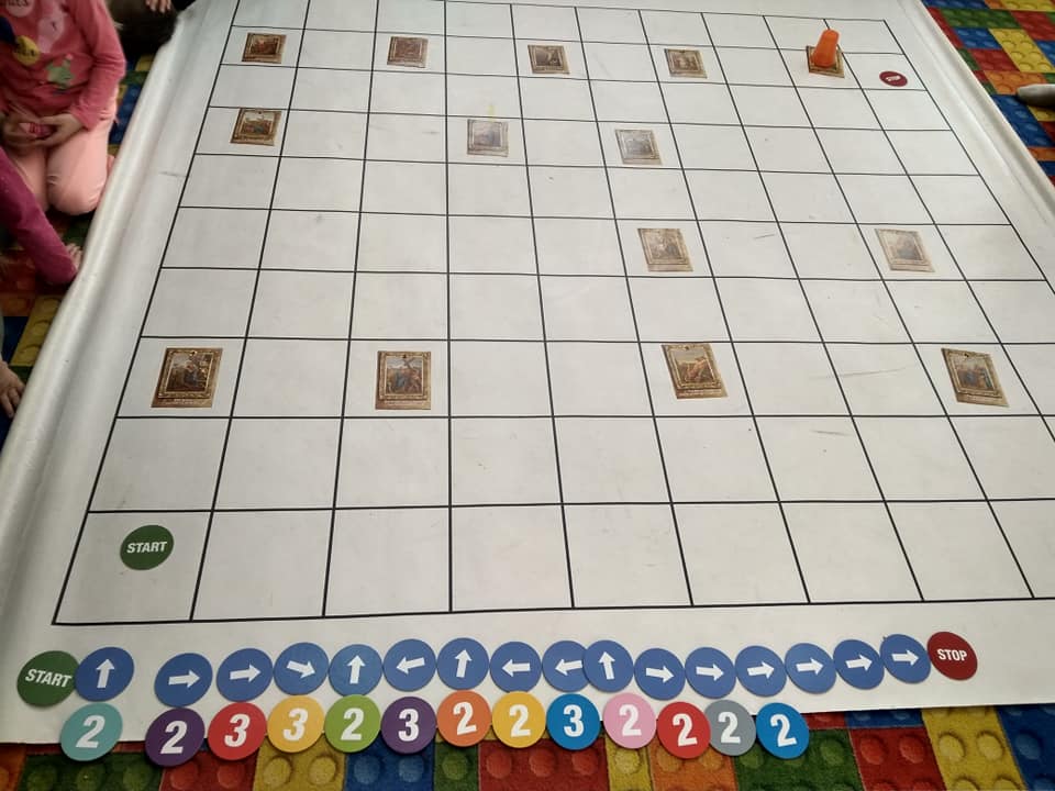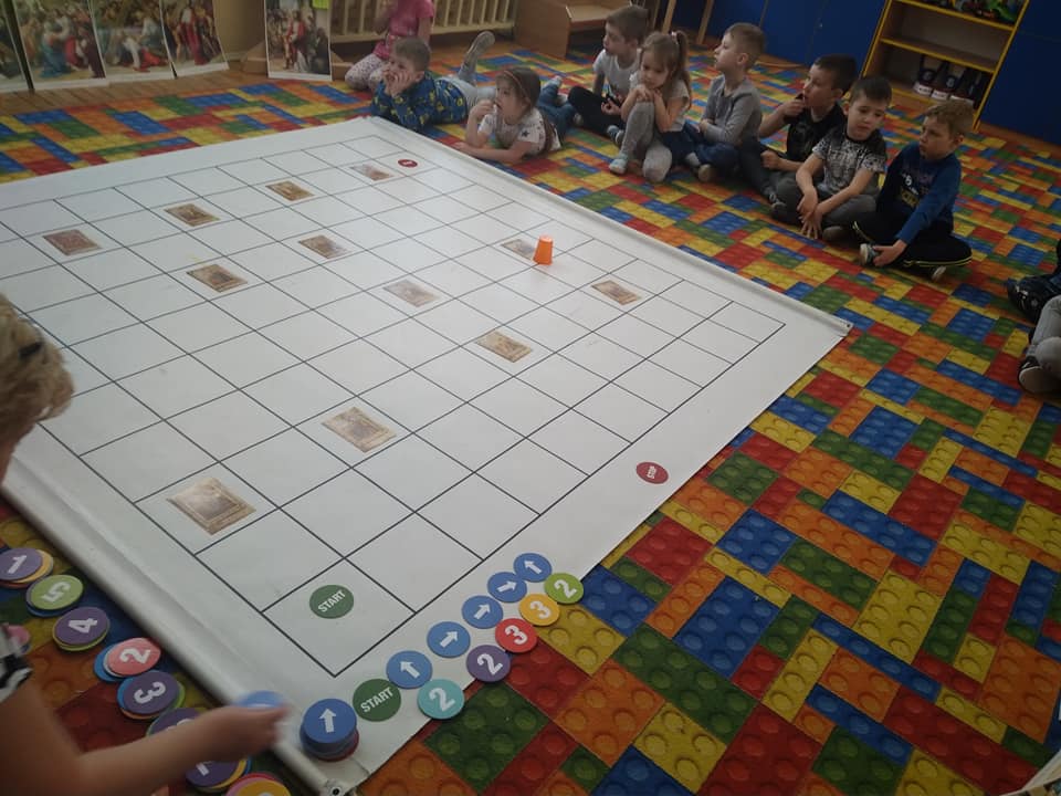 Oczywiście, że można dzisiejsze zajęcia w grupie Tropicieli to udowodniły. Przygotowane przez księdza obrazki przedstawiające poszczególne stacje drogi krzyżowej były ponumerowane, duże ilustracje ustawione wokół tak, by były dobrze widoczne dla wszystkich. Małe odpowiedniki znalazły się na macie. Dzieci miały ułożyć skrypt drogi od startu do mety, przechodząc kolejne stacje. O każdej ksiądz króciutko opowiadał.Tropiciele pięknie pracowały i z zaciekawieniem słuchały.