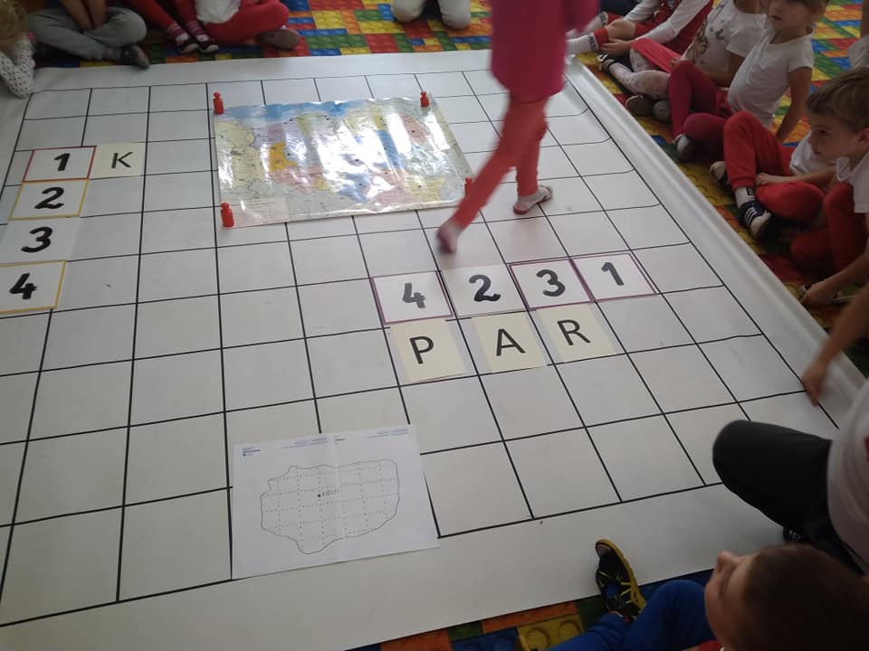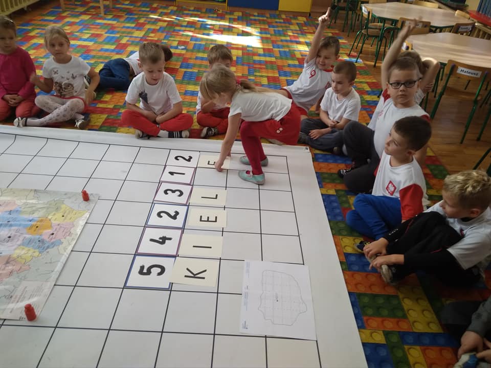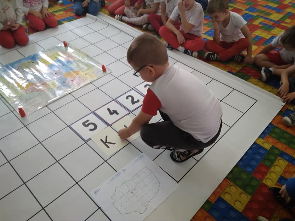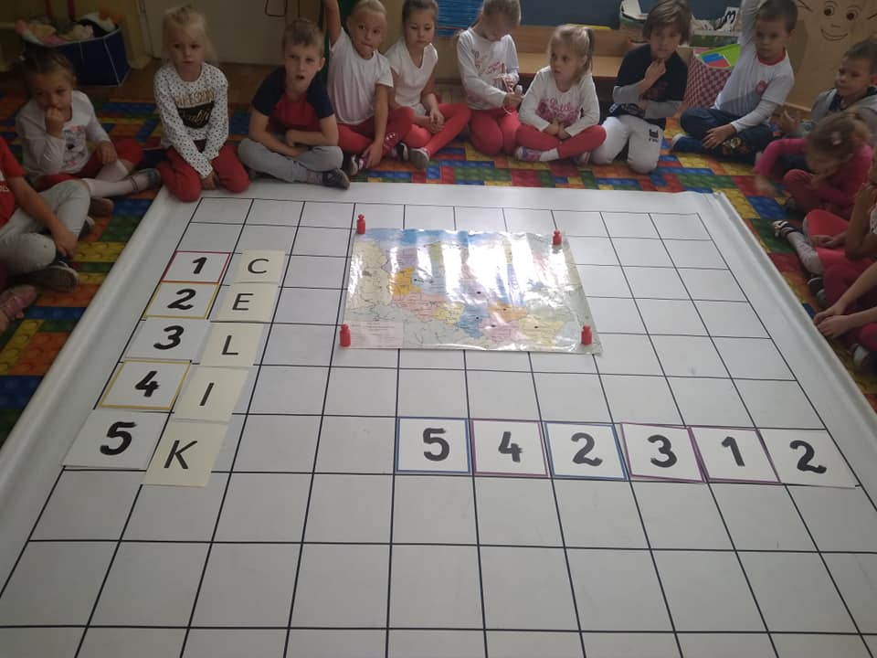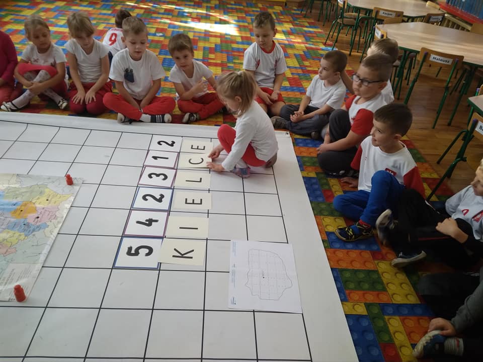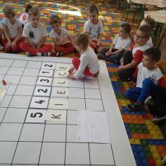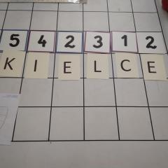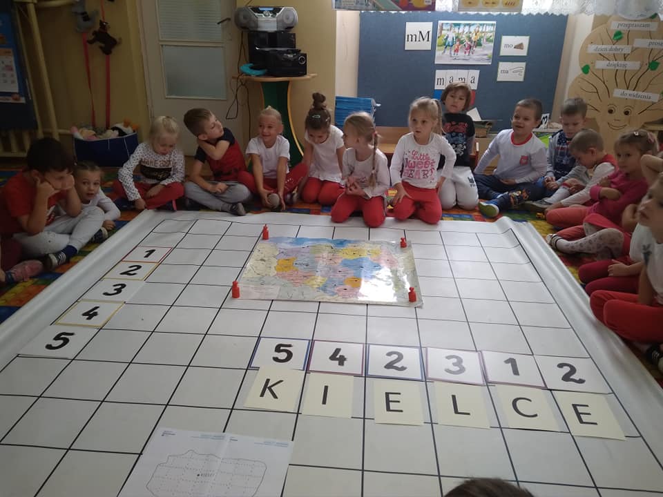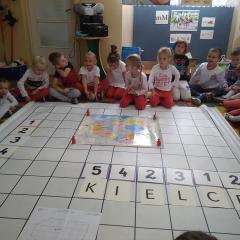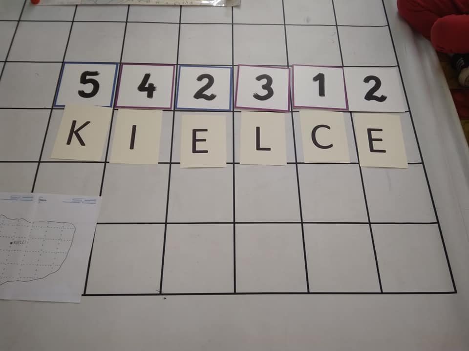 Dzisiaj zakodowaliśmy informacje dotyczące naszej miejscowości. Najpierw dzieci obejrzały mapę z zaznaczonymi województwami, przeliczając dowiedziały się ile ich jest i odszukały woj. świętokrzyskie. Potem odkodowaliśmy nazwę miejscowości, w której mieszkamy i nazwy różnych ciekawych miejsc w Kielcach. Ułożyliśmy skrypt trasy z przedszkola do parku z warunkiem że po drodze zwiedzamy różne ciekawe miejsca w Kielcach.