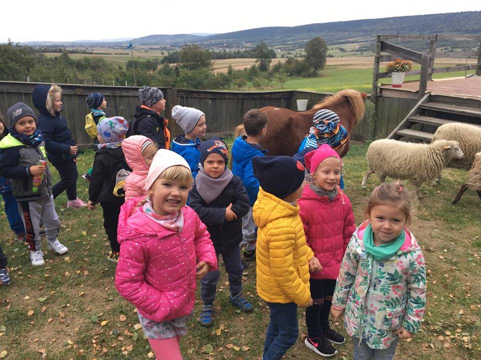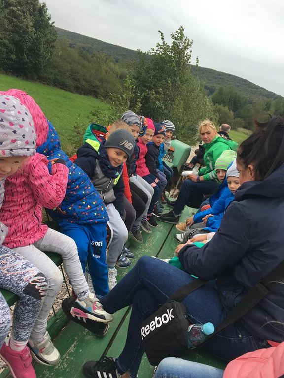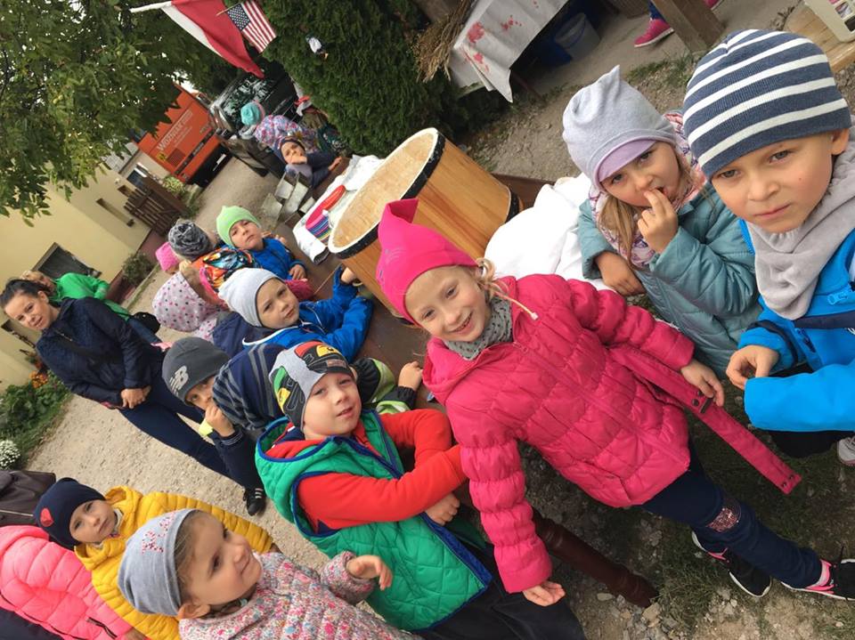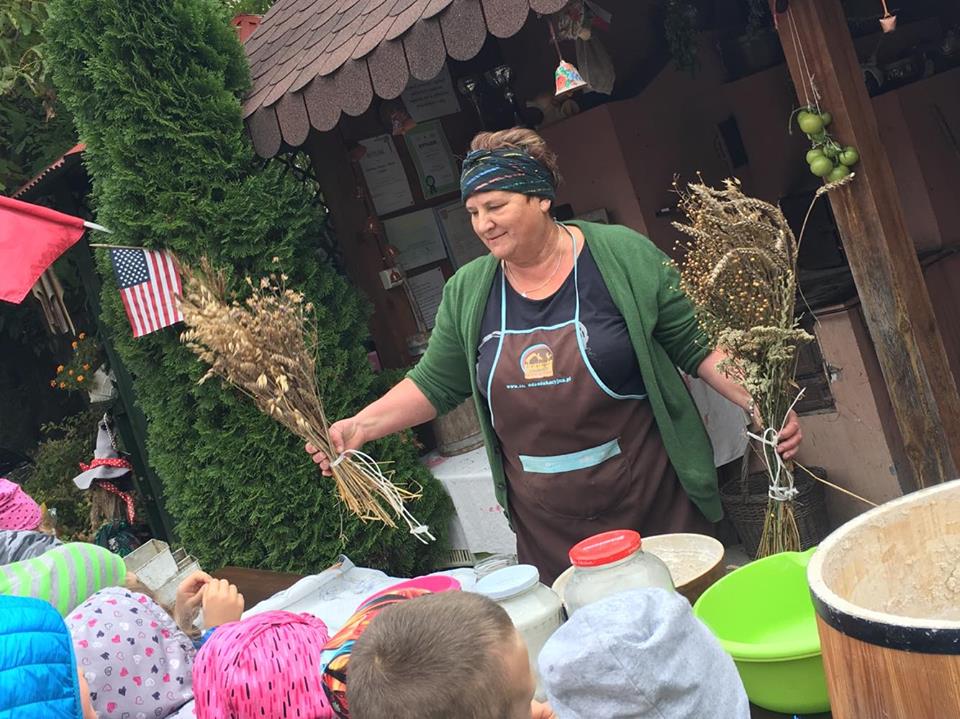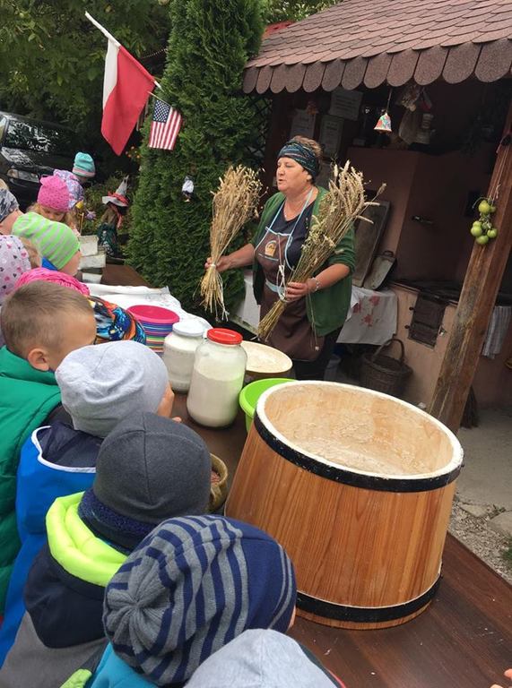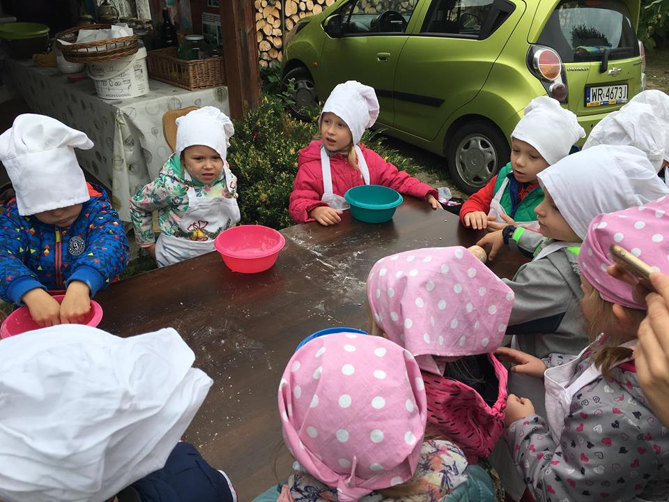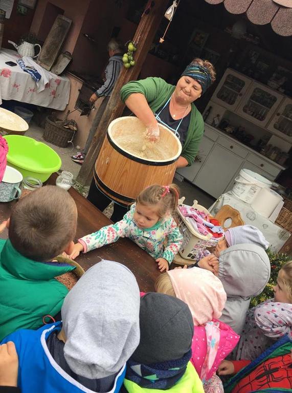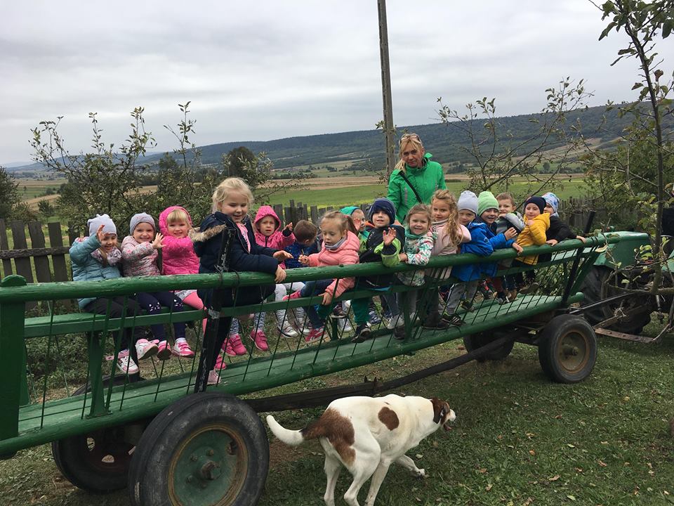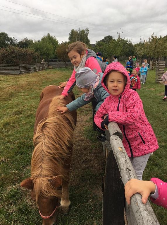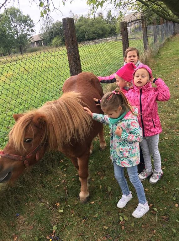 Wycieczka do gospodarstwa agroturystycznego „Na Górce” przyniosła Żabką i Biedronką wiele wrażeń. Dzieci obcowały ze zwierzętami zagrodowymi, ulubieńcem był szczeniaczek o imieniu Iskierka. Poznały procedurę wypieku chlebka. Wyrabiały ciasto i piekły podpłomyki. Odwiedziły warsztat tkacki, podziwiały gobeliny oraz zapoznały się z tradycyjnymi ludowymi strojami z naszego regionu. Dzieci ozdabiały sylwety zwierząt wypalone w drewnie, oglądały szmaciane laleczki, które Pani Jadzia samodzielnie wykonuje w swoim gospodarstwie. Nawet jedną z nich otrzymały w prezencie. Piekły kiełbaski oraz kosztowały domowe ciasta oraz pyszny chlebek. Ogromną atrakcją była dla dzieci przejażdżka furmanką, którą bardzo chciały wracać do przedszkola