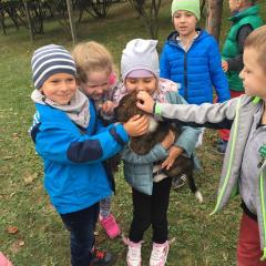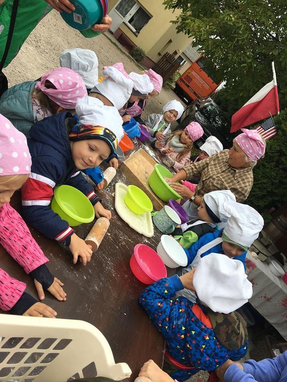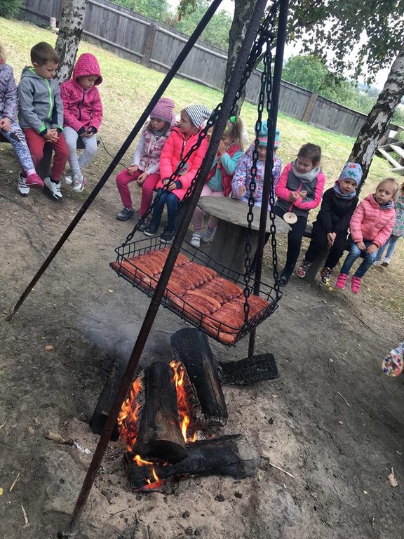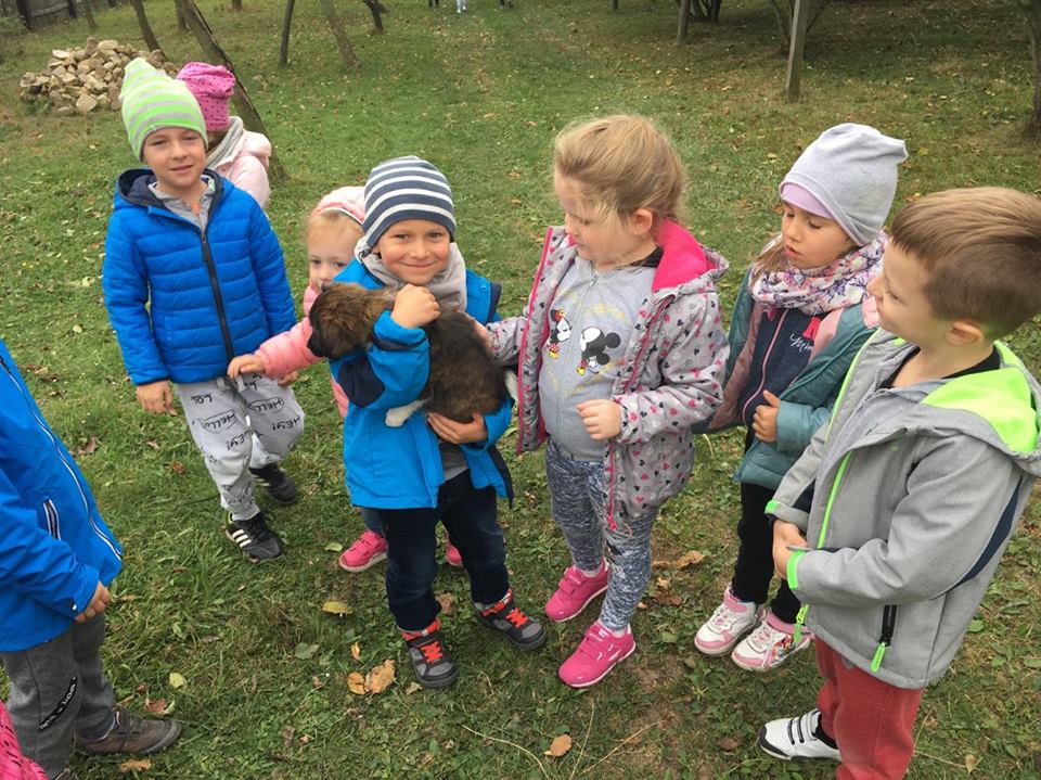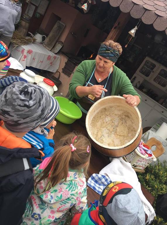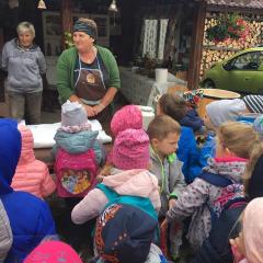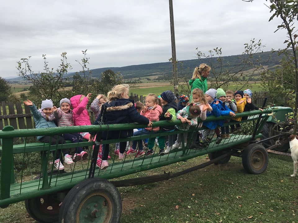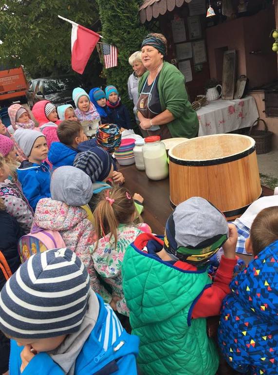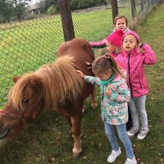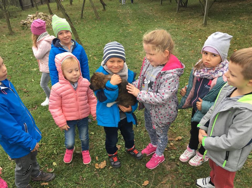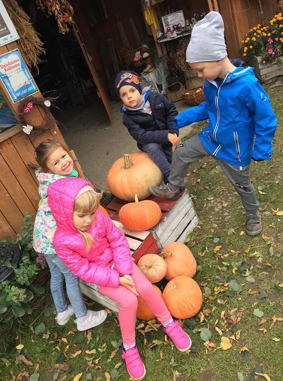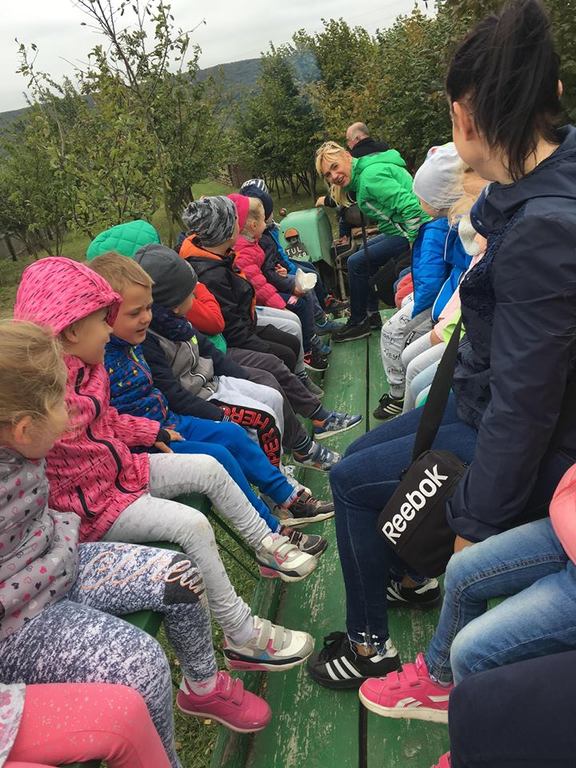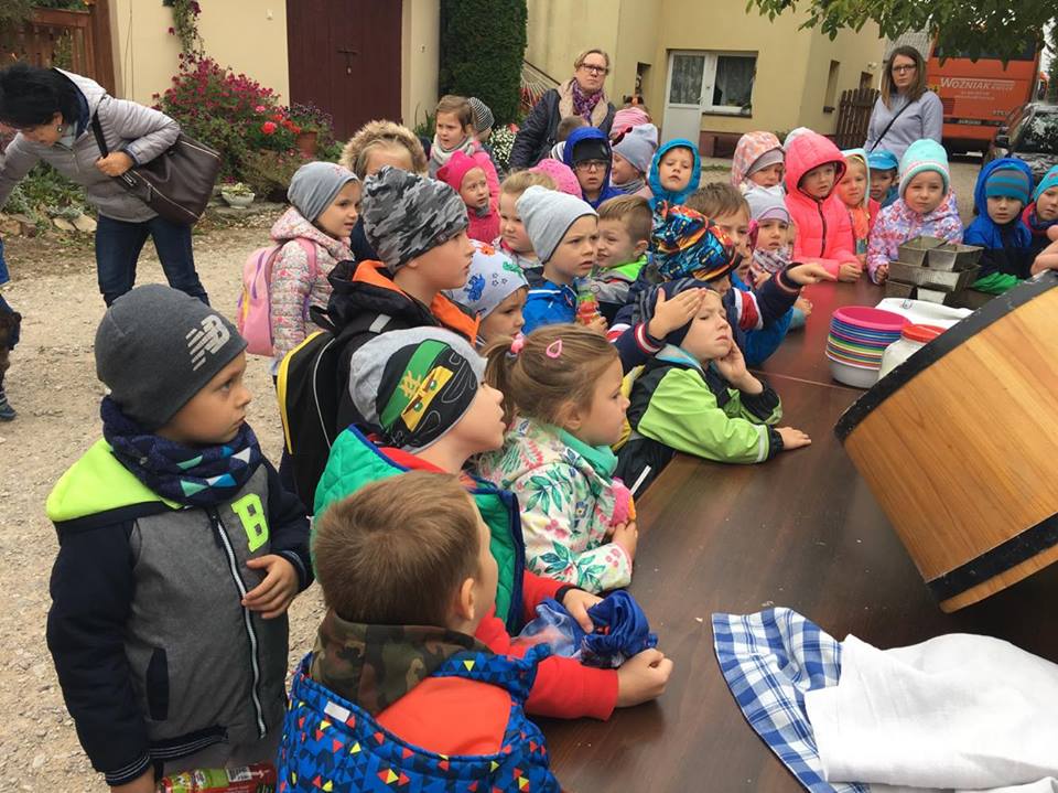 Wycieczka do gospodarstwa agroturystycznego „Na Górce” przyniosła Żabką i Biedronką wiele wrażeń. Dzieci obcowały ze zwierzętami zagrodowymi, ulubieńcem był szczeniaczek o imieniu Iskierka. Poznały procedurę wypieku chlebka. Wyrabiały ciasto i piekły podpłomyki. Odwiedziły warsztat tkacki, podziwiały gobeliny oraz zapoznały się z tradycyjnymi ludowymi strojami z naszego regionu. Dzieci ozdabiały sylwety zwierząt wypalone w drewnie, oglądały szmaciane laleczki, które Pani Jadzia samodzielnie wykonuje w swoim gospodarstwie. Nawet jedną z nich otrzymały w prezencie. Piekły kiełbaski oraz kosztowały domowe ciasta oraz pyszny chlebek. Ogromną atrakcją była dla dzieci przejażdżka furmanką, którą bardzo chciały wracać do przedszkola