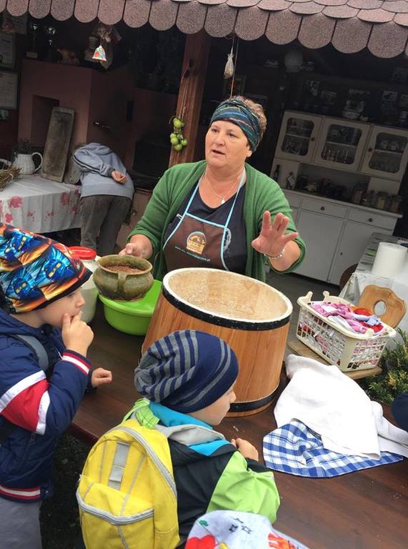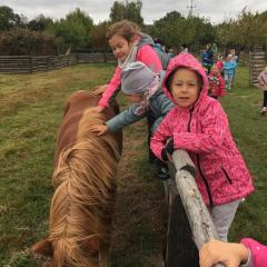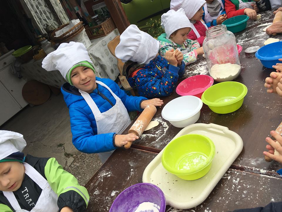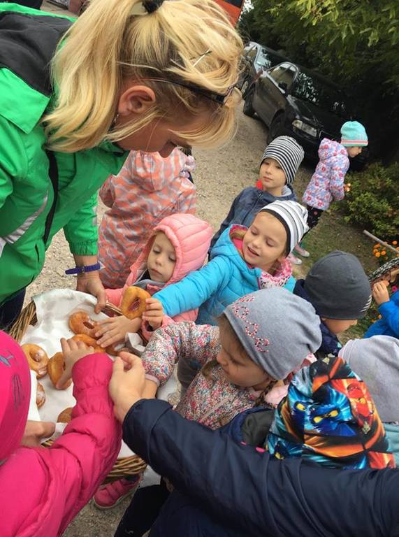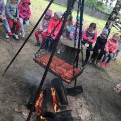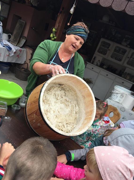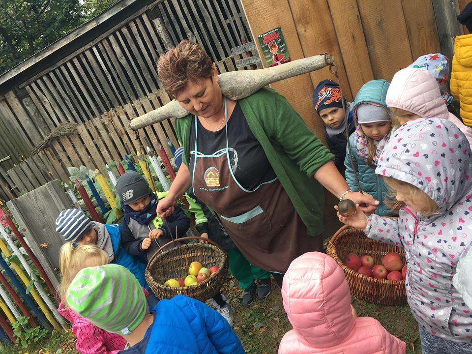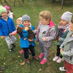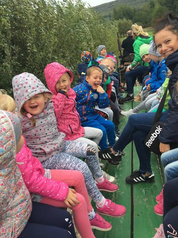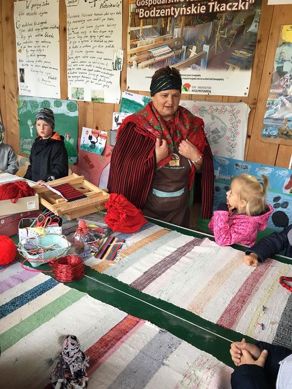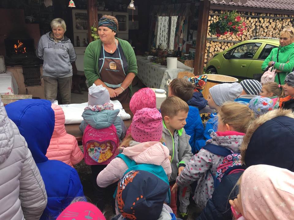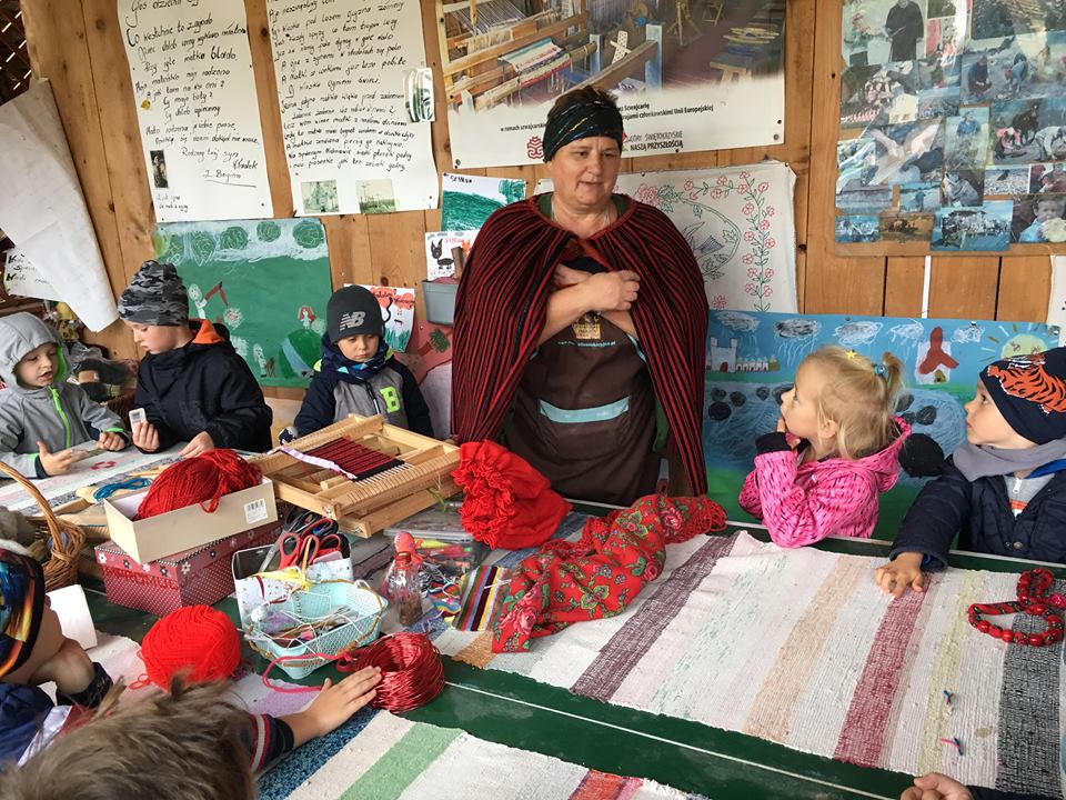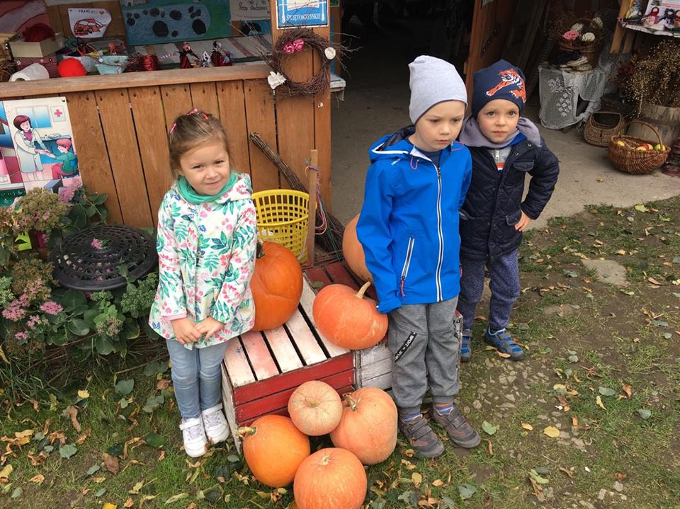 Wycieczka do gospodarstwa agroturystycznego „Na Górce” przyniosła Żabką i Biedronką wiele wrażeń. Dzieci obcowały ze zwierzętami zagrodowymi, ulubieńcem był szczeniaczek o imieniu Iskierka. Poznały procedurę wypieku chlebka. Wyrabiały ciasto i piekły podpłomyki. Odwiedziły warsztat tkacki, podziwiały gobeliny oraz zapoznały się z tradycyjnymi ludowymi strojami z naszego regionu. Dzieci ozdabiały sylwety zwierząt wypalone w drewnie, oglądały szmaciane laleczki, które Pani Jadzia samodzielnie wykonuje w swoim gospodarstwie. Nawet jedną z nich otrzymały w prezencie. Piekły kiełbaski oraz kosztowały domowe ciasta oraz pyszny chlebek. Ogromną atrakcją była dla dzieci przejażdżka furmanką, którą bardzo chciały wracać do przedszkola