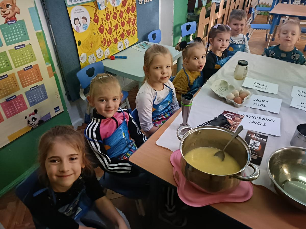 W ramach projektu Bon Appetit dzieci wykonały zadanie "Podwieczorek z rodziną". Wspólnymi siłami zrobiliśmy piernik staropolski, który będzie leżakował do świąt. Będziemy go degustować na spotkaniu jasełkowym. Ponadto jeżyki poznały różne składniki piernika w języku angielskim. Żeby zaspokoić rozbudzone gotowaniem apetyty na zakończenie zjedliśmy chałkę z miodem i masłem - przysmak wszystkich misiów.