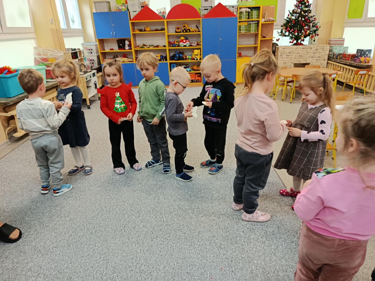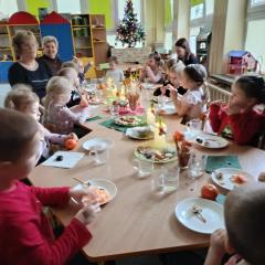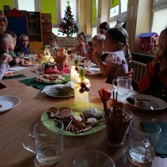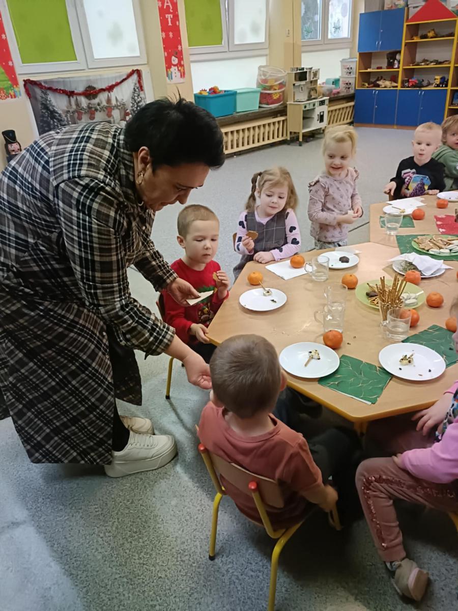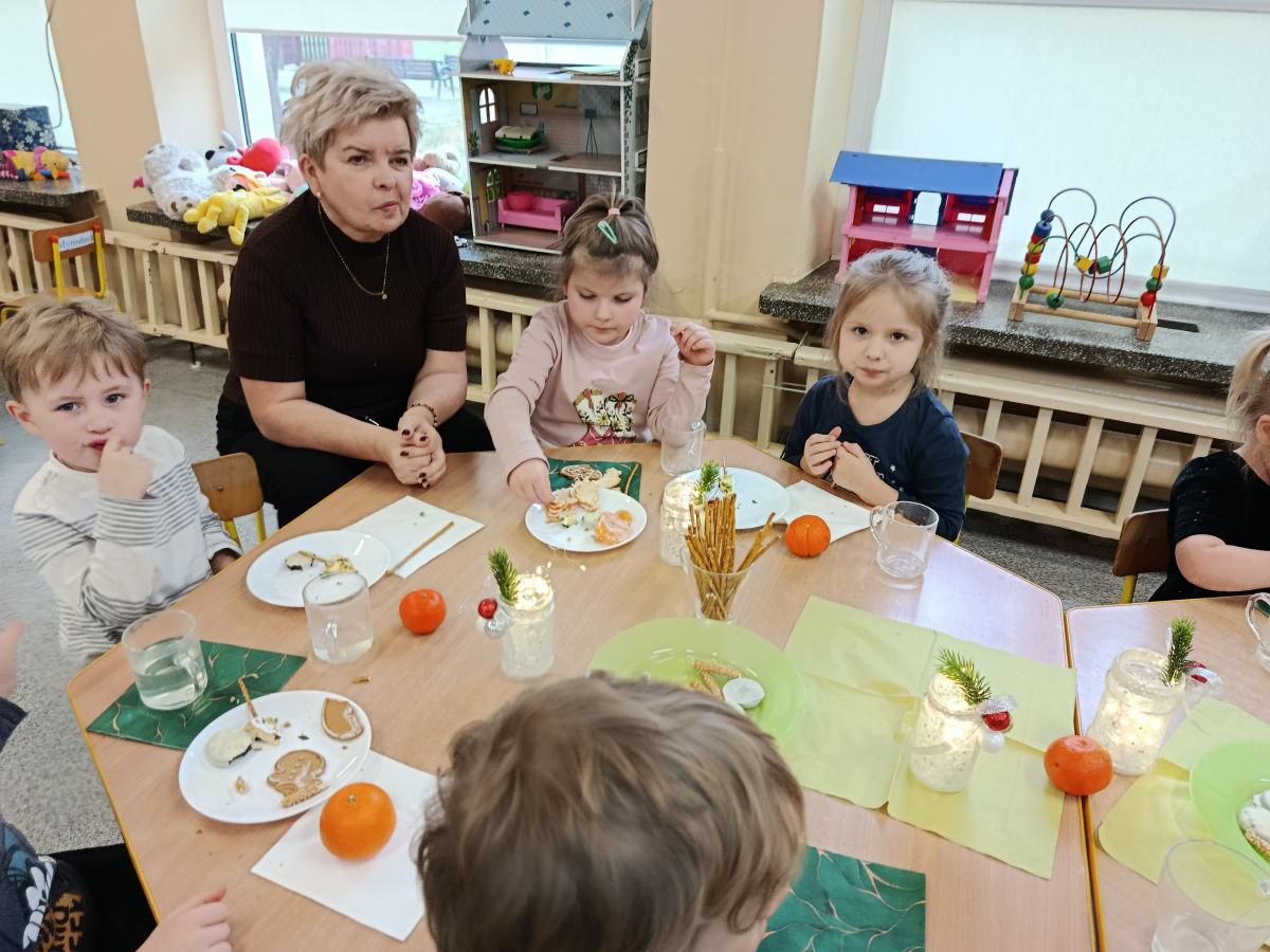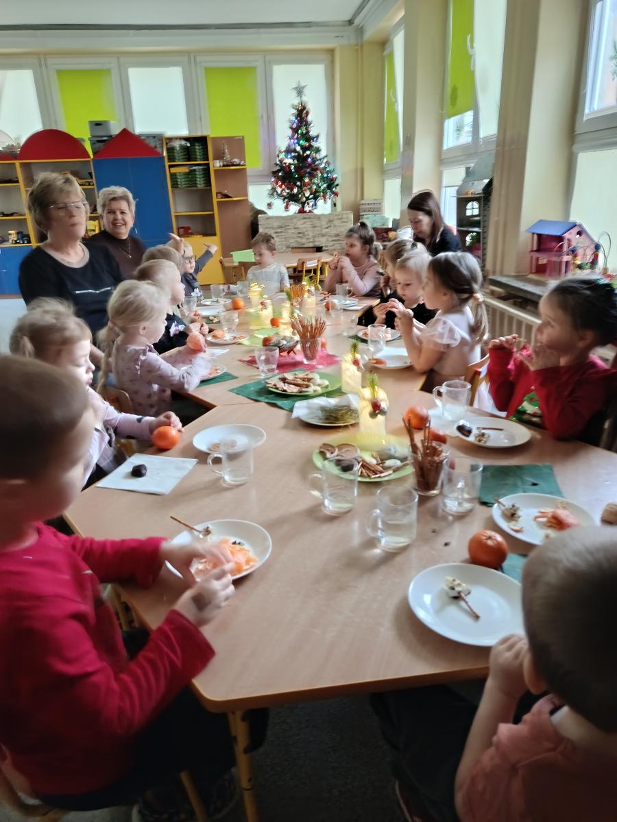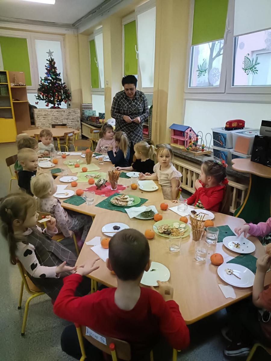 Grupa „Motylki” przygotowała uroczystą wigilię – dzieci zadbały o pięknie nakryty stół oraz świąteczne przekąski. Dzięki księdzu Robertowi odbyło się tradycyjne dzielenie opłatkiem, podczas którego składano sobie serdeczne życzenia bożonarodzeniowe. Spotkanie przebiegało w ciepłej i życzliwej atmosferze, sprzyjającej wspólnemu przeżywaniu zbliżających się Świąt Bożego Narodzenia. Ważnym elementem uroczystości było wspólne kolędowanie, które wprowadziło wszystkich w świąteczny nastrój. Do składania życzeń dołączyła również Pani Dyrektor. Na nadchodzące Święta Bożego Narodzenia życzymy wszystkim zdrowia, radości, rodzinnego ciepła oraz pomyślności w Nowym Roku.