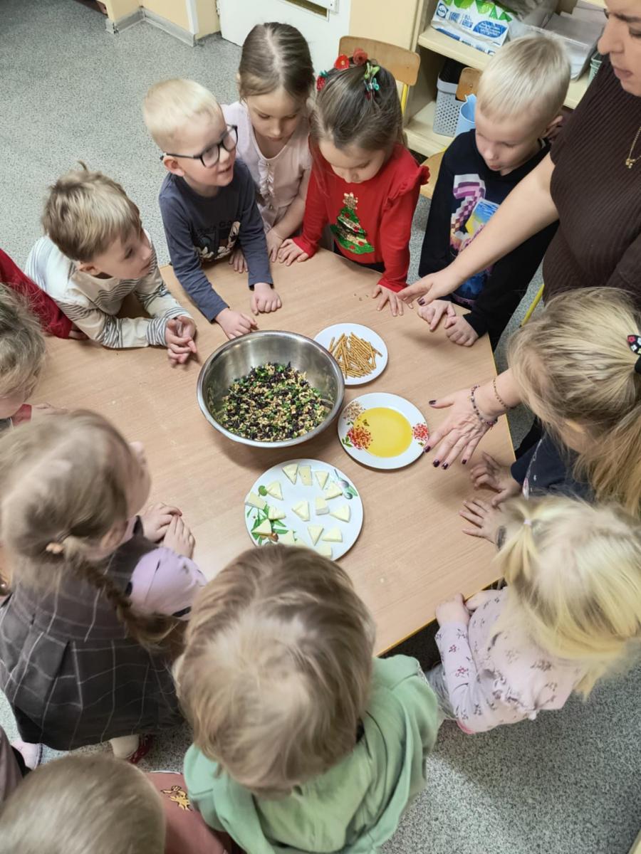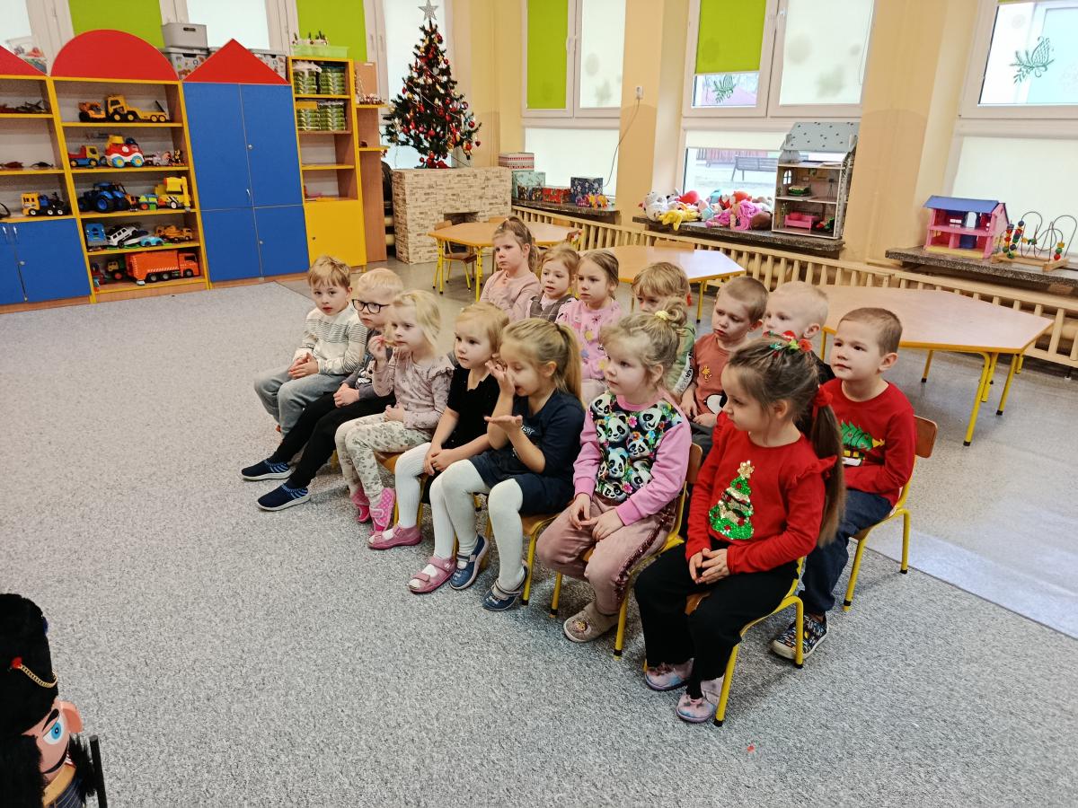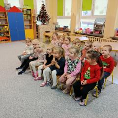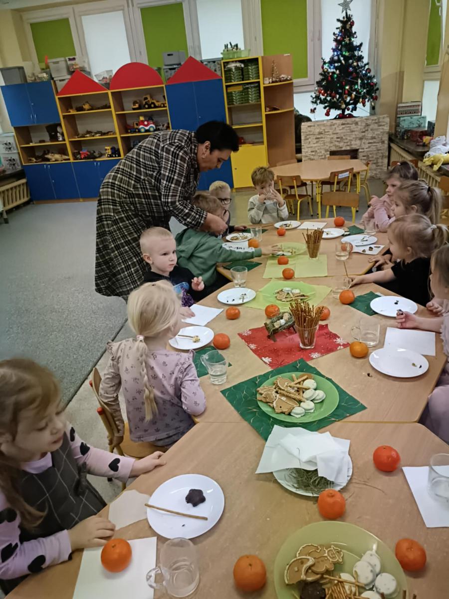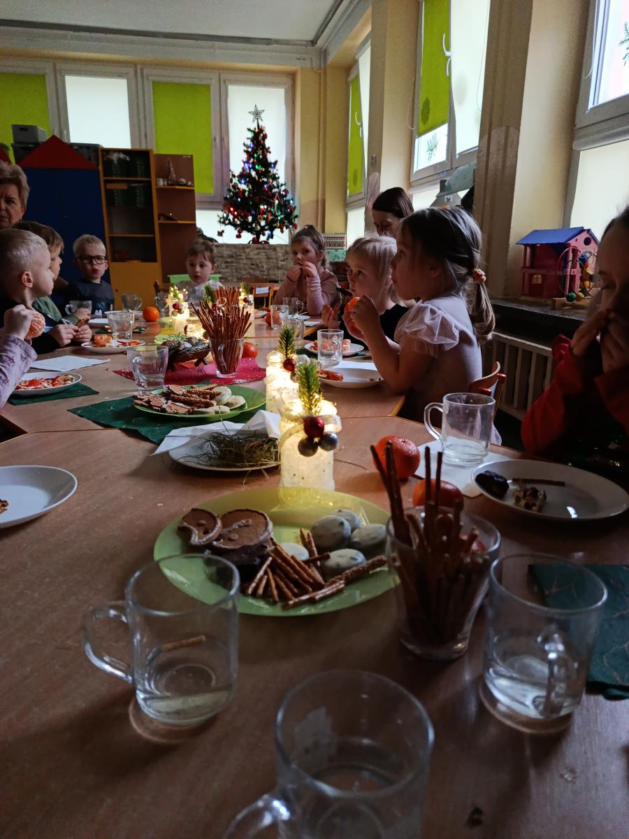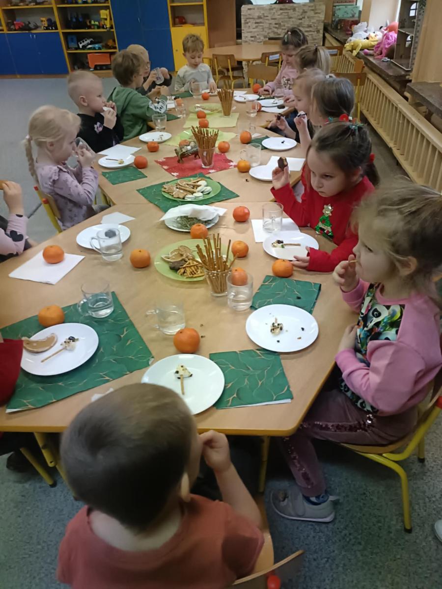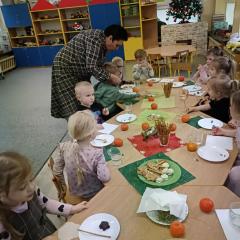 Grupa „Motylki” przygotowała uroczystą wigilię – dzieci zadbały o pięknie nakryty stół oraz świąteczne przekąski. Dzięki księdzu Robertowi odbyło się tradycyjne dzielenie opłatkiem, podczas którego składano sobie serdeczne życzenia bożonarodzeniowe. Spotkanie przebiegało w ciepłej i życzliwej atmosferze, sprzyjającej wspólnemu przeżywaniu zbliżających się Świąt Bożego Narodzenia. Ważnym elementem uroczystości było wspólne kolędowanie, które wprowadziło wszystkich w świąteczny nastrój. Do składania życzeń dołączyła również Pani Dyrektor. Na nadchodzące Święta Bożego Narodzenia życzymy wszystkim zdrowia, radości, rodzinnego ciepła oraz pomyślności w Nowym Roku.