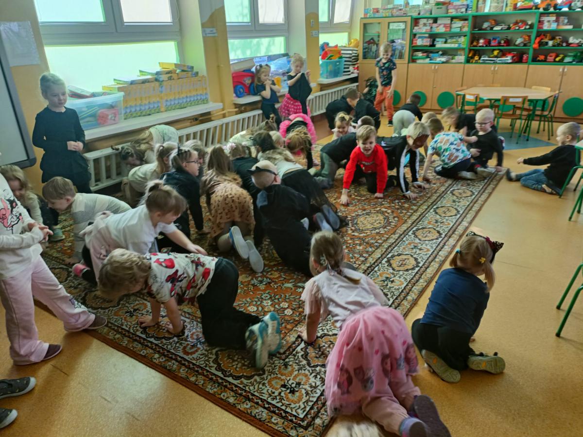Dzieci poznały ciekawostki o kotach domowych i ich zwyczajach. Wysłuchaliśmy opowiadania o przygodach kota, bawiliśmy się w „kocie zabawy” ruchowe oraz wykonywaliśmy prace plastyczne przedstawiające koty.