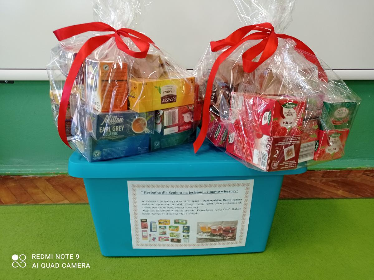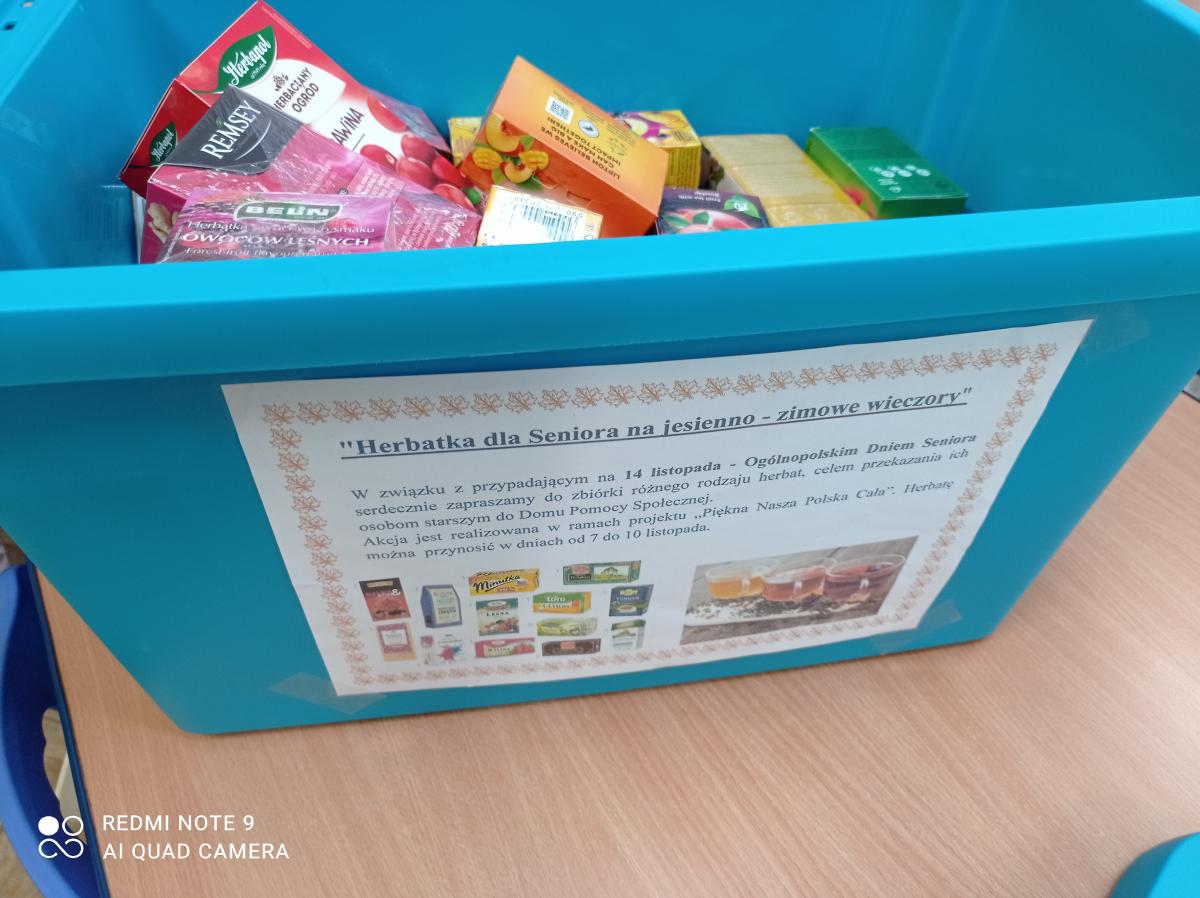 Zadanie polegało na zorganizowaniu zbiórki różnego rodzaju herbat, celem przekazania ich osobom starszym i potrzebującym z najbliższego otoczenia. Wykonując zadanie pragnęliśmy uczcić obchodzony 14 listopada Ogólnopolski Dzień Seniora.